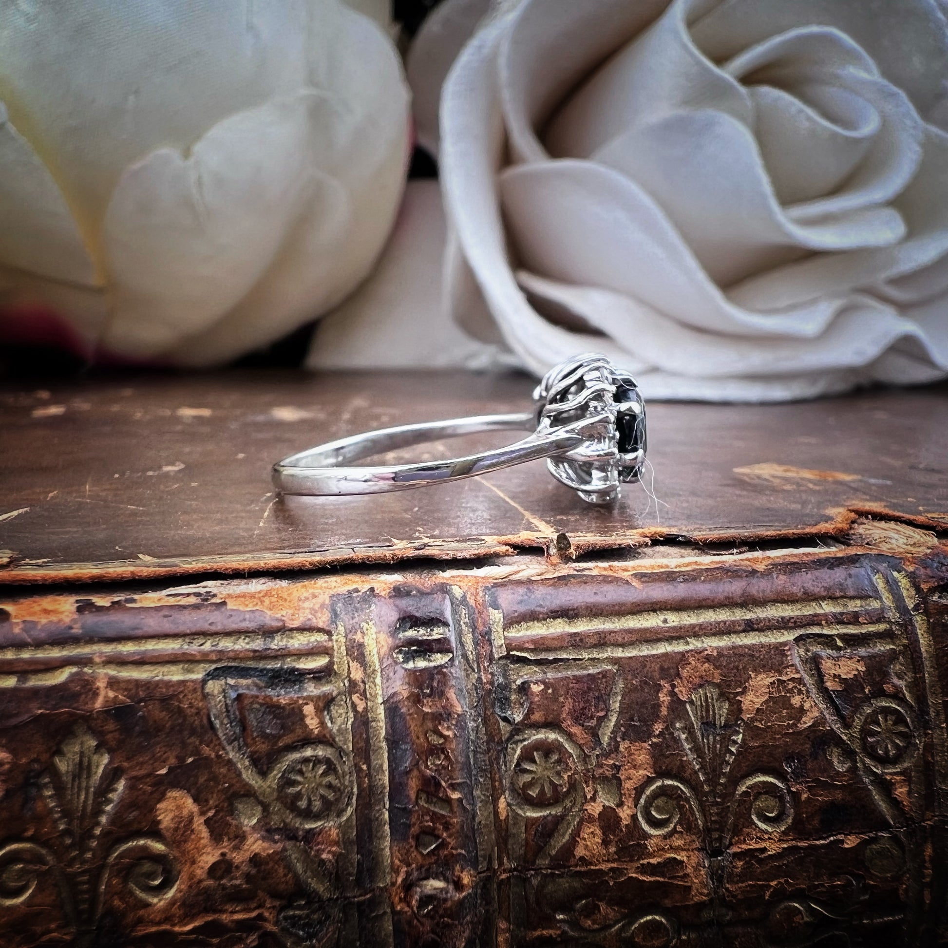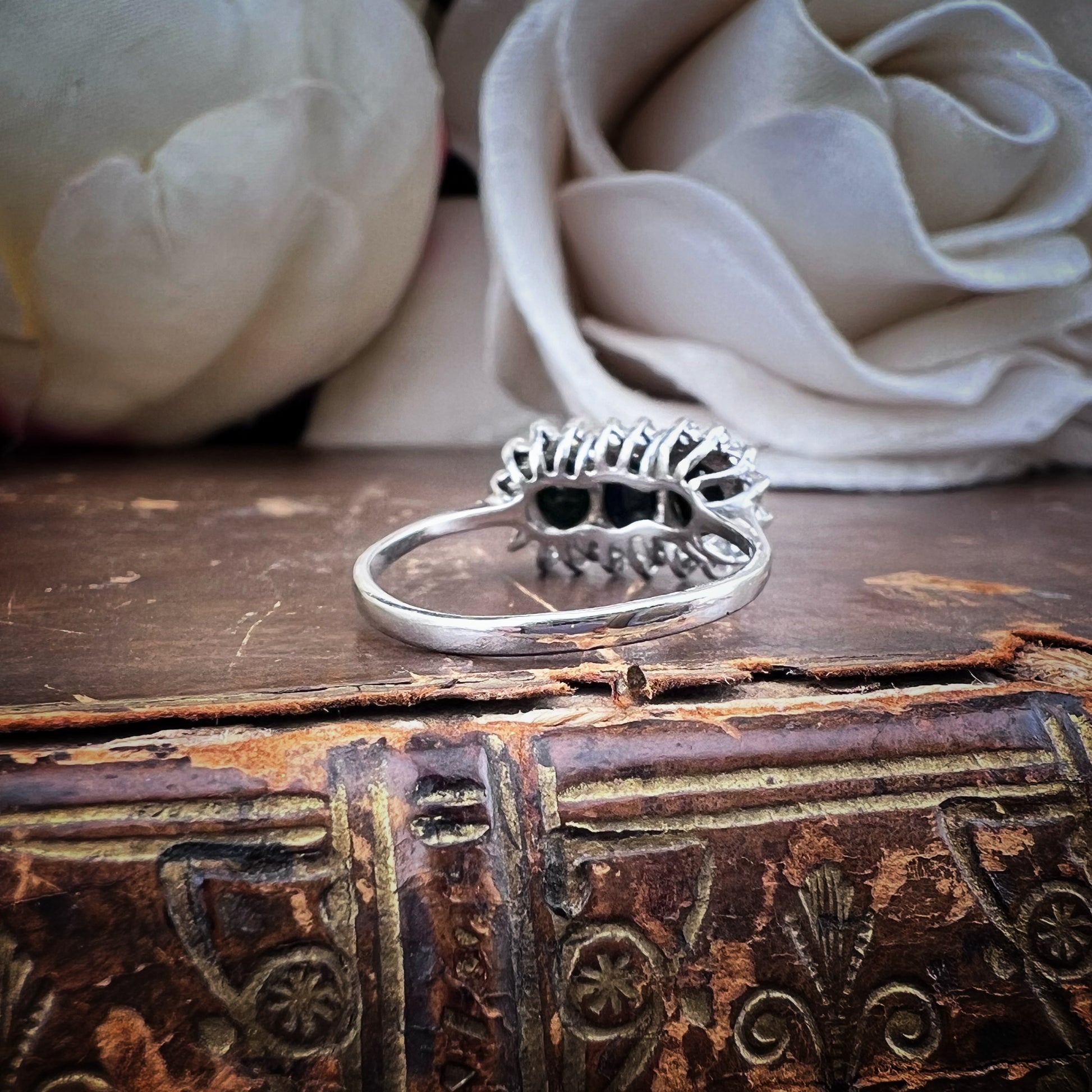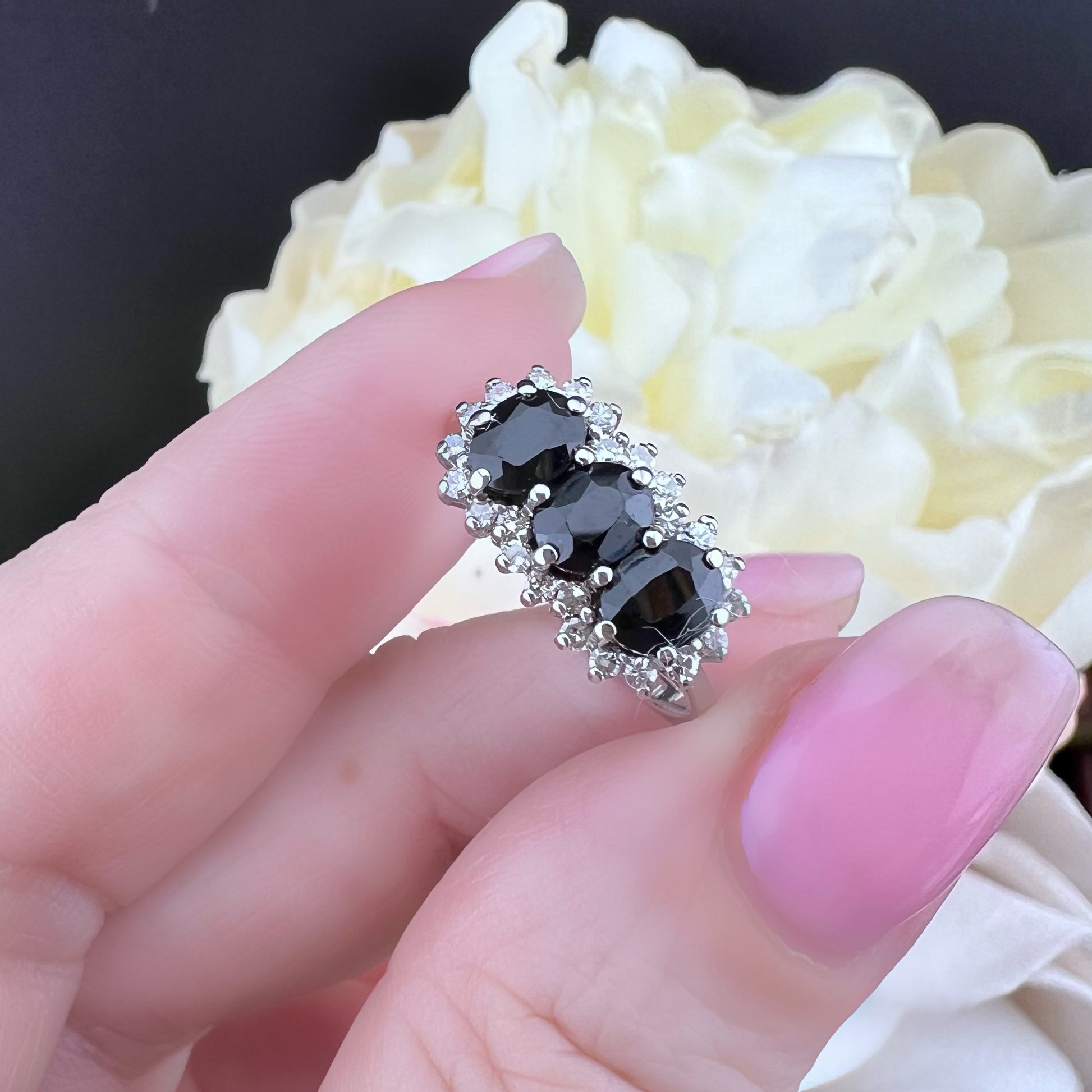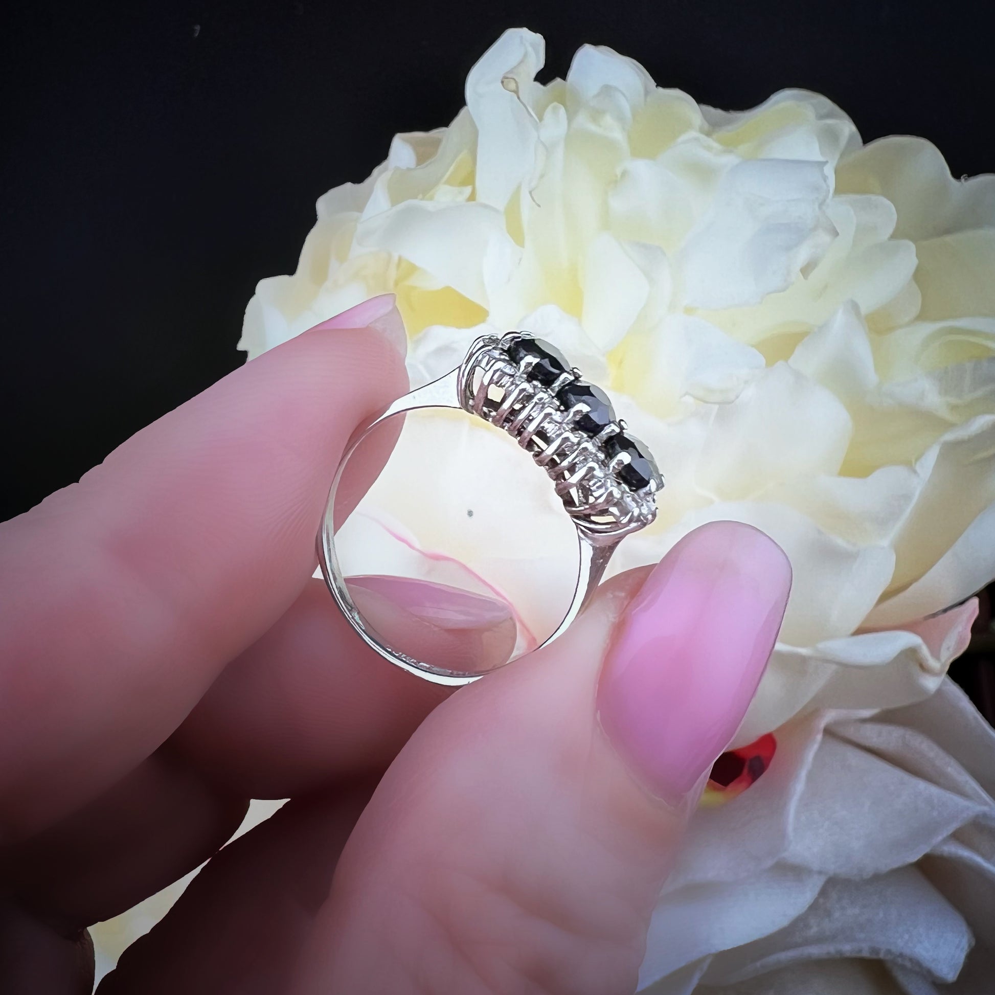 Three 5x4 mm oval-cut sapphires, a deep midnight blue, sit regally on the front of the ring, symbols of wisdom, loyalty, and protection. They are embraced by a sparkling crown of 24 brilliant-cut diamonds, each weighing 0.01 ct, arranged like petals around the sapphire hearts, lending light and movement to every gesture of the hand.