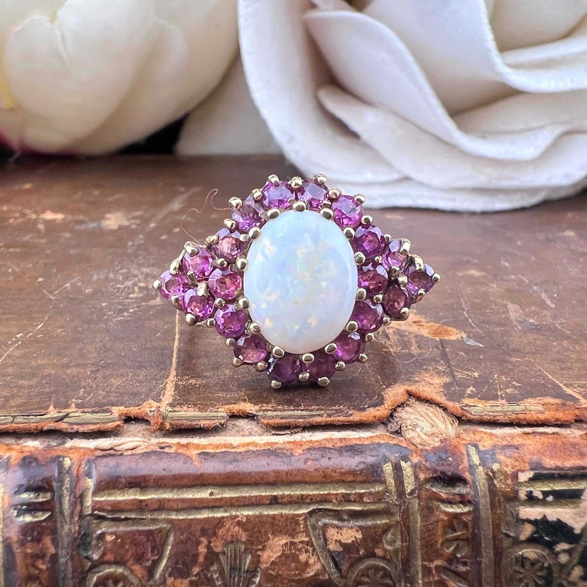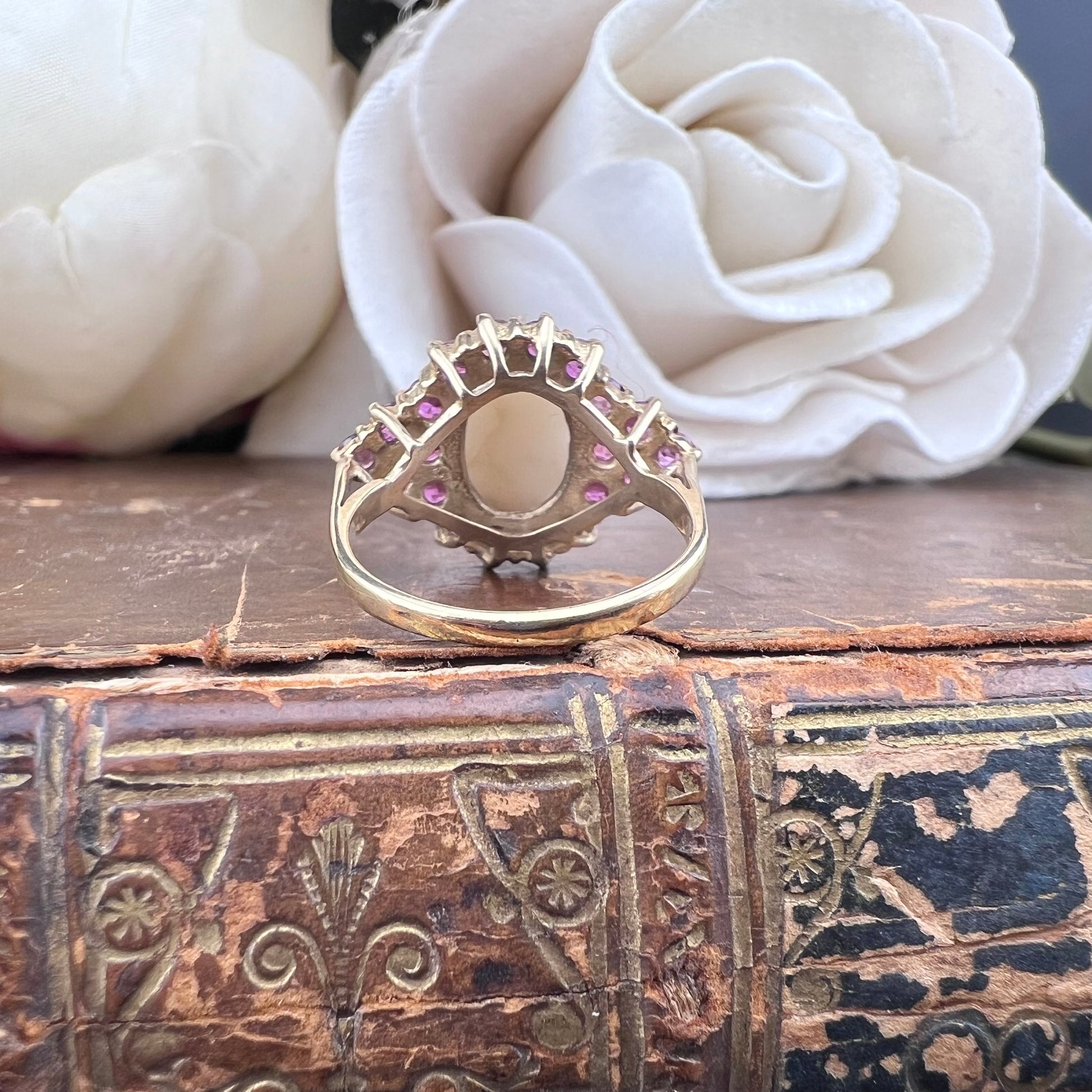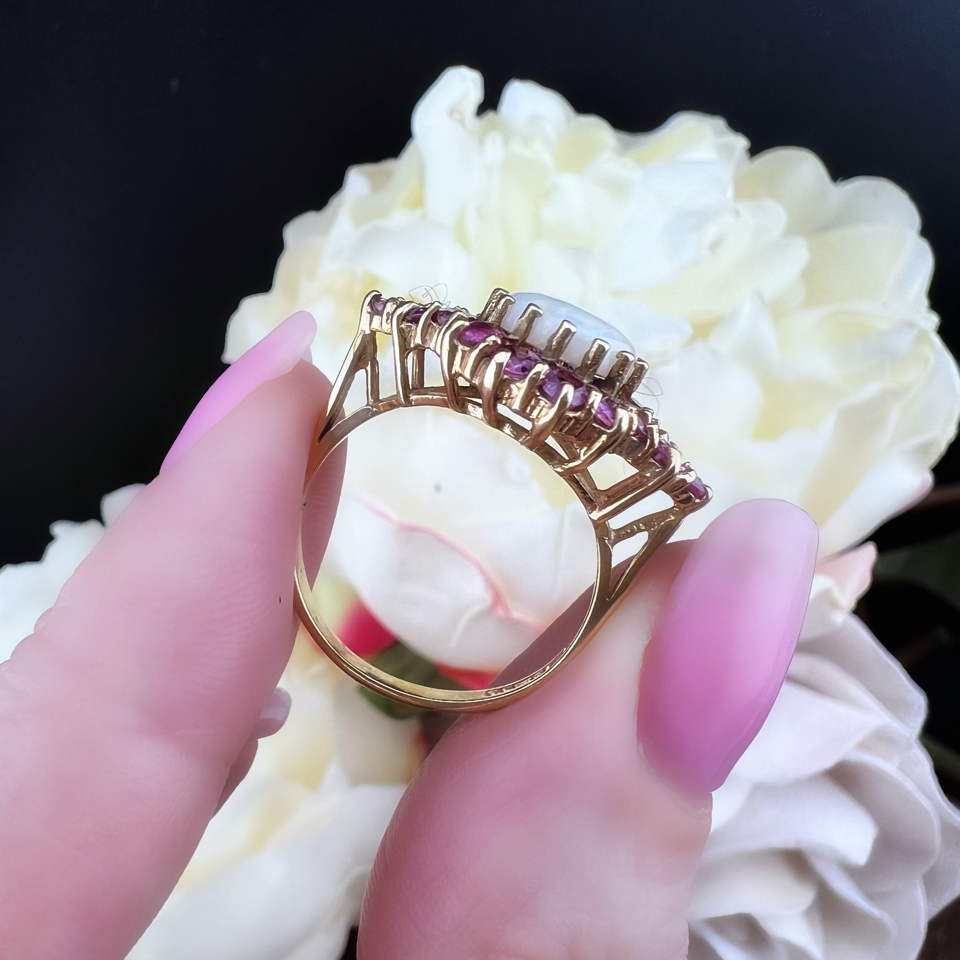 This ring, crafted in 1989 in Birmingham in yellow gold, captures that very encounter: at its center, an oval opal that, with every movement, reveals iridescent shimmers like an iridescent sunrise. Surrounding it, a frame of 20 round rubies arranged in an elongated and harmonious shape seems to embrace the center stone and amplify its light.