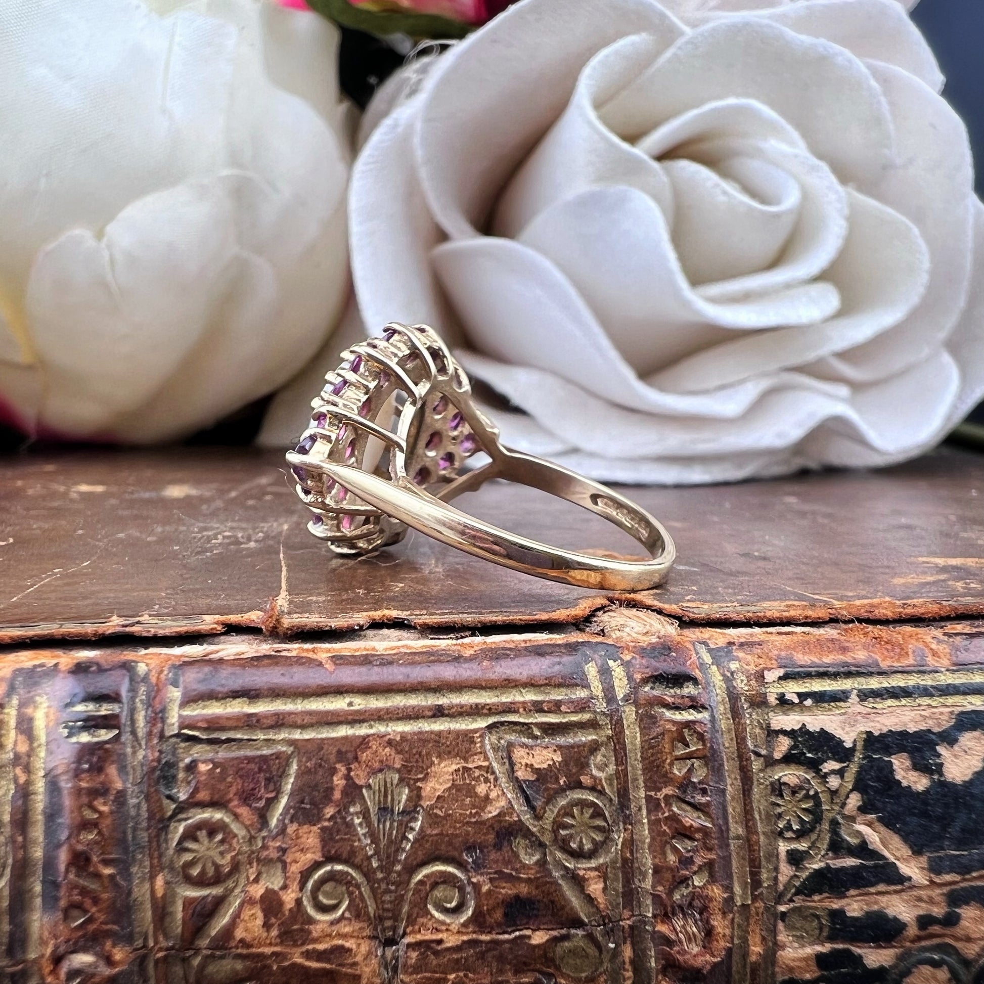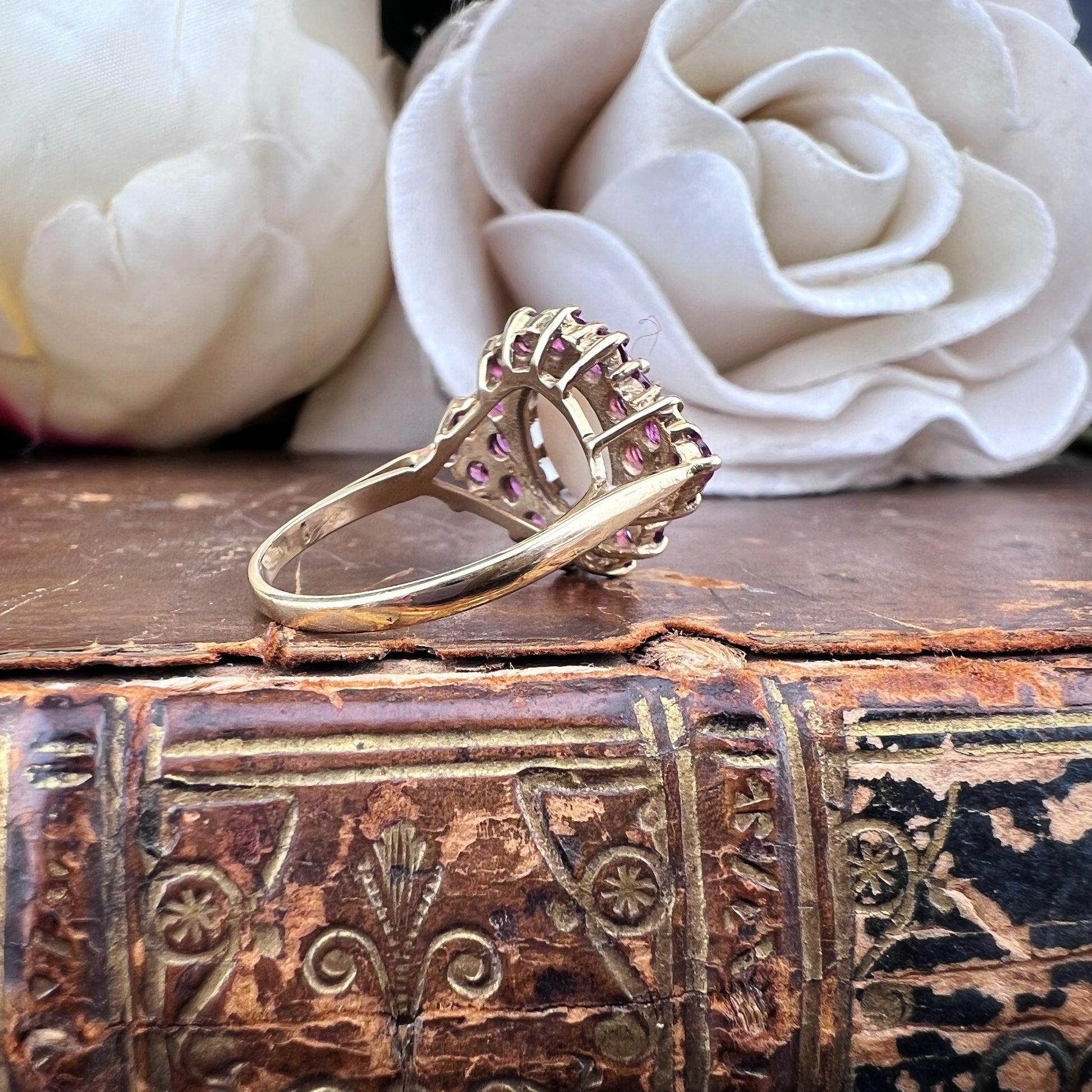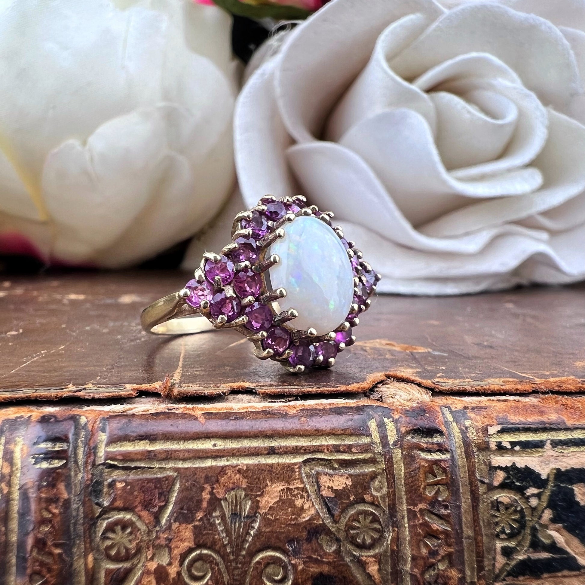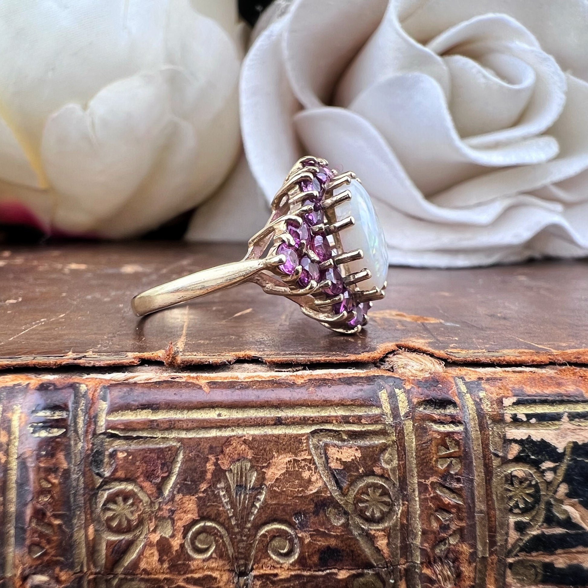 This ring, crafted in 1989 in Birmingham in yellow gold, captures that very encounter: at its center, an oval opal that, with every movement, reveals iridescent shimmers like an iridescent sunrise. Surrounding it, a frame of 20 round rubies arranged in an elongated and harmonious shape seems to embrace the center stone and amplify its light.