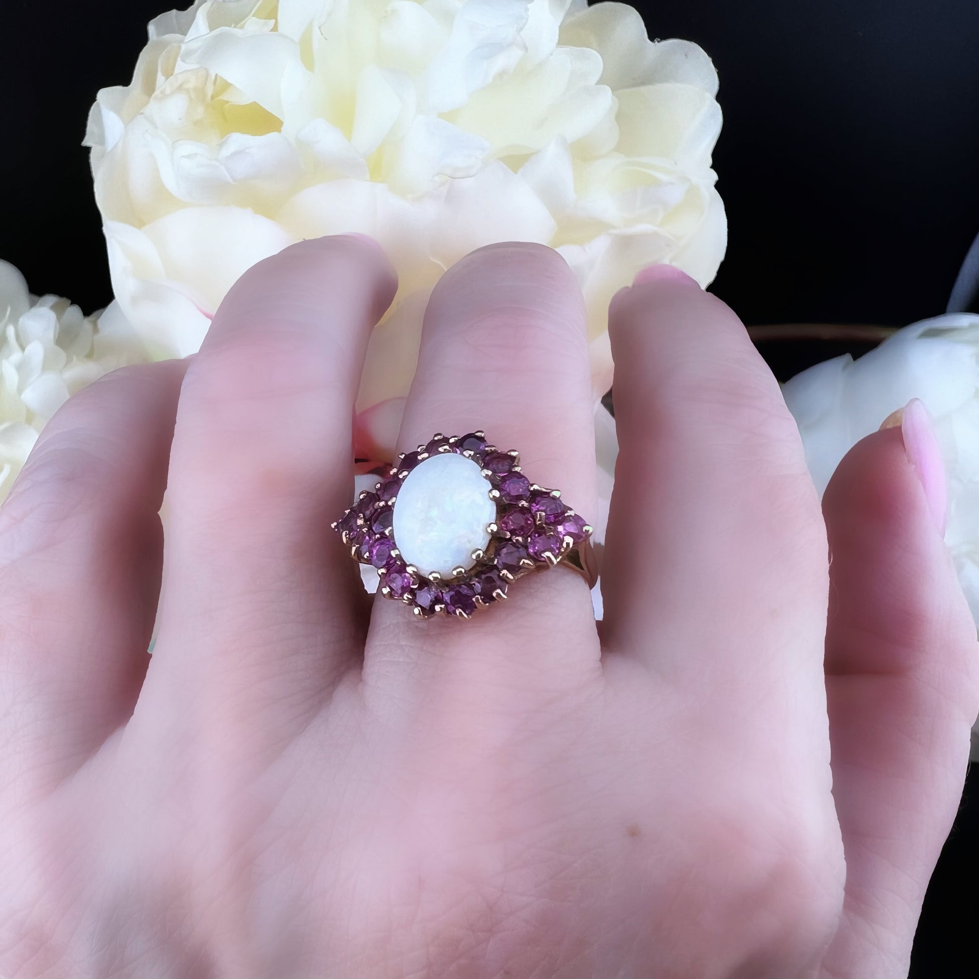 Vintage 9ct yellow gold opal and ruby ring – Birmingham, 1989