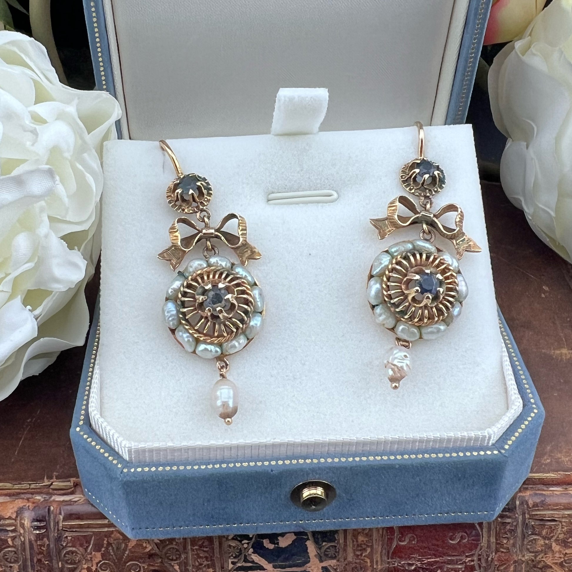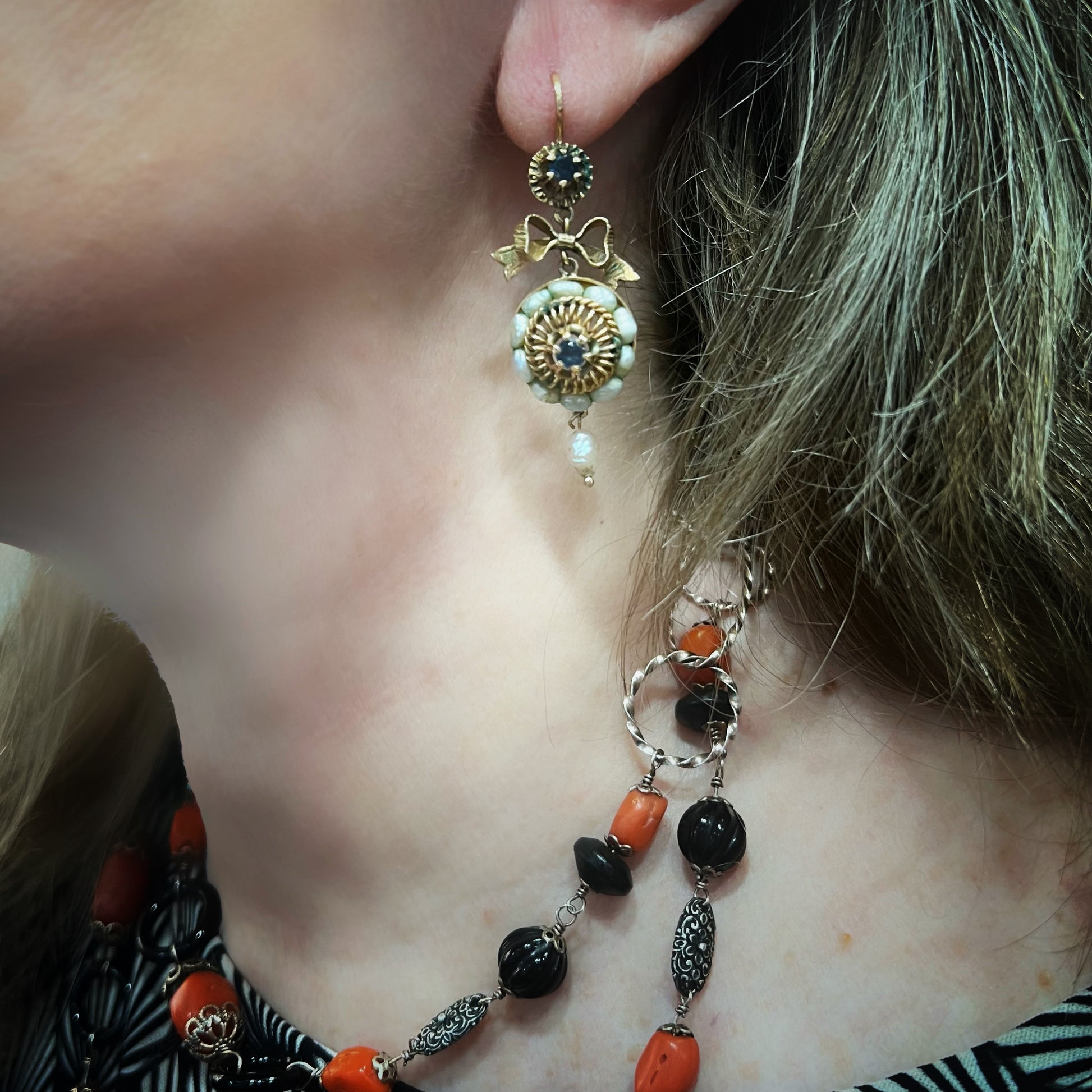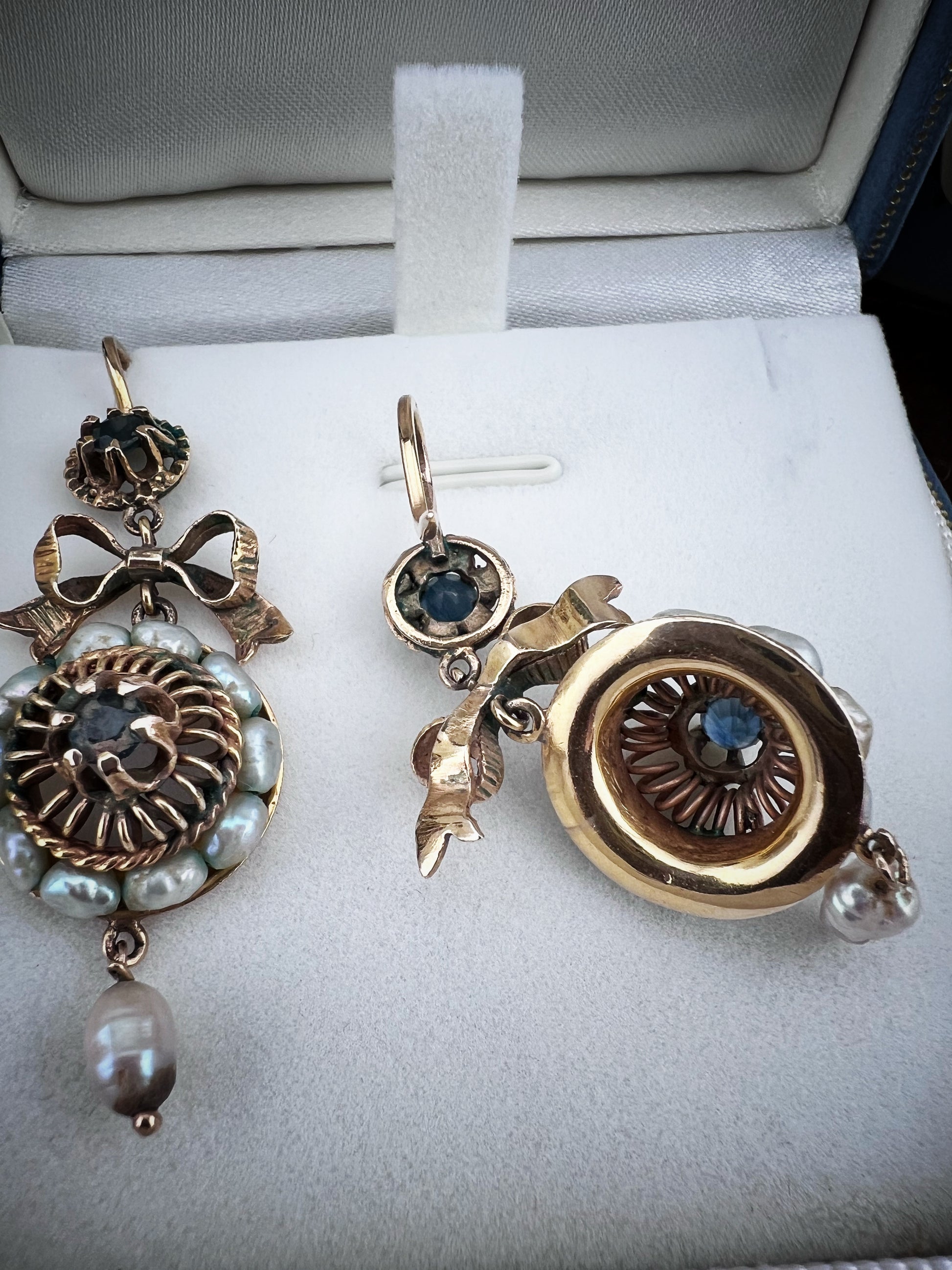 Antique Pair of 10kt Gold Earrings with Sapphires and Baroque Pearls – Late 19th Century