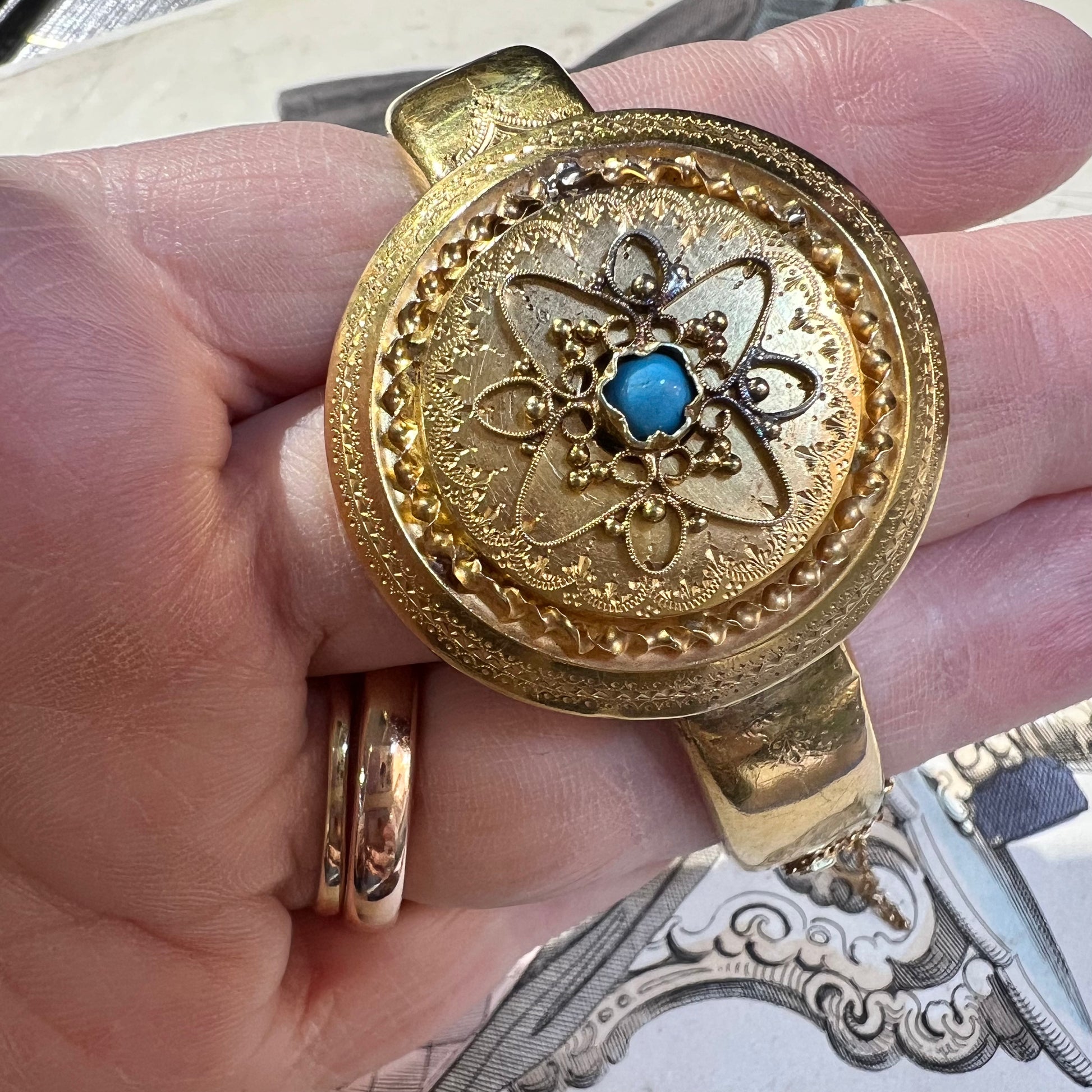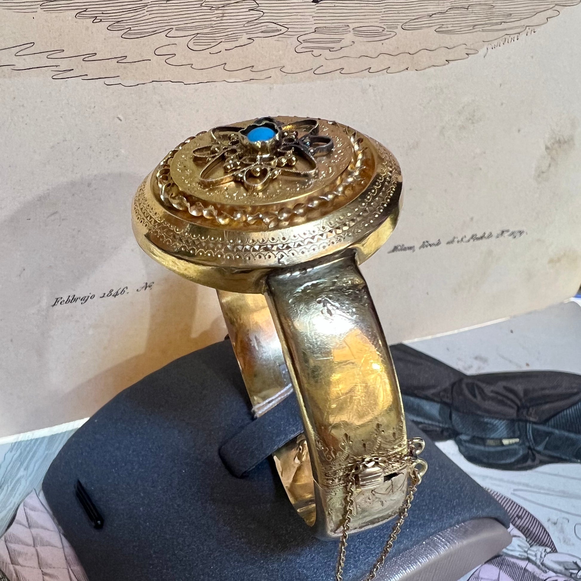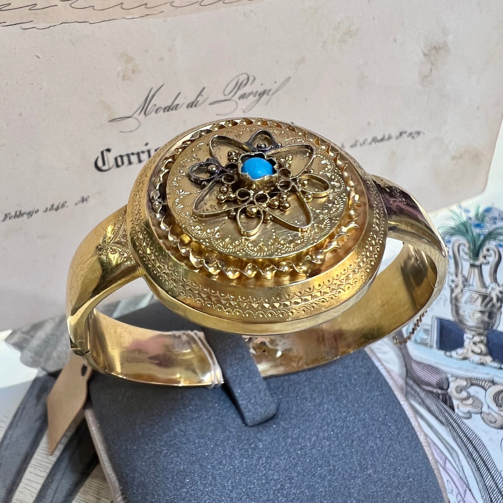 Unusual Bourbon bracelet with large engraved and filigreed medallion decoration on the front. The relief motifs surround a turquoise cabochon. The snap closure is secured by a connecting chain. It was made in central-southern Italy by the mid-19th century in 12-karat yellow gold of a very bright and luminous shade.
