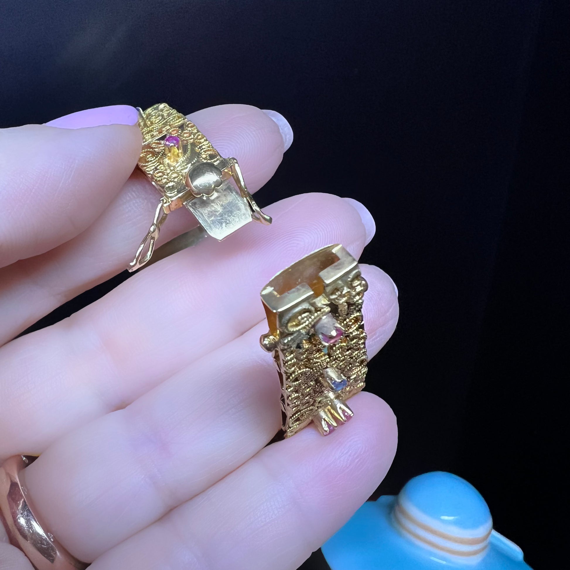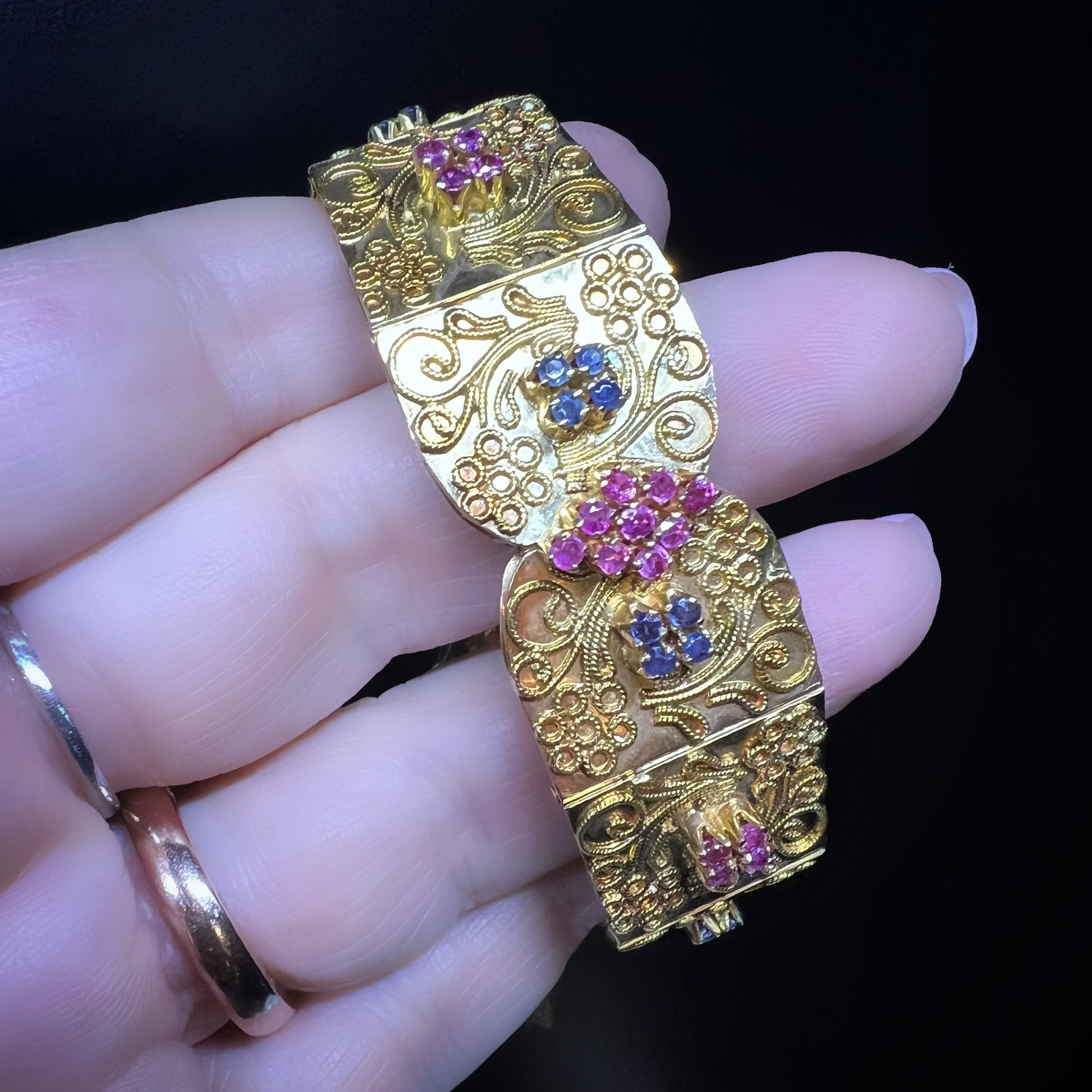 18K yellow gold bracelet with filigree, rubies, sapphires