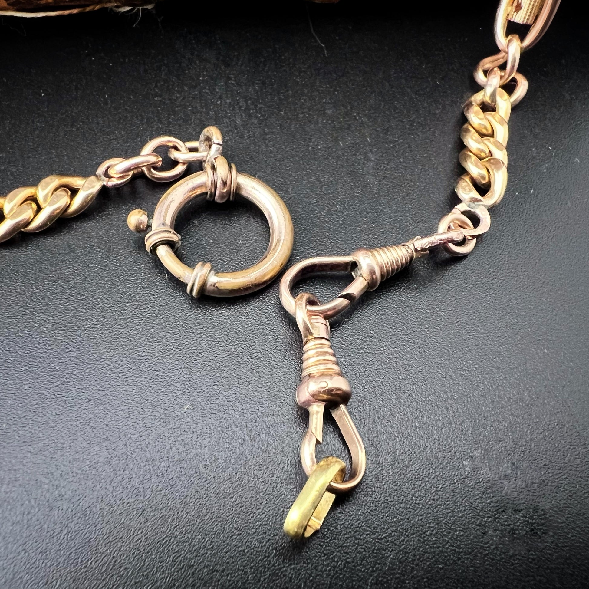 This refined antique watch chain, crafted entirely from 9k yellow gold, is a unique piece that embodies the charm and elegance of early 20th-century craftsmanship. The design stands out for its original alternating links and a series of striped tubular decorative elements, perforated with star motifs, enclosed by twisted hollow tubes. The chain ends with a traditional hook, perfectly in keeping with the characteristics of watch chains of the period.