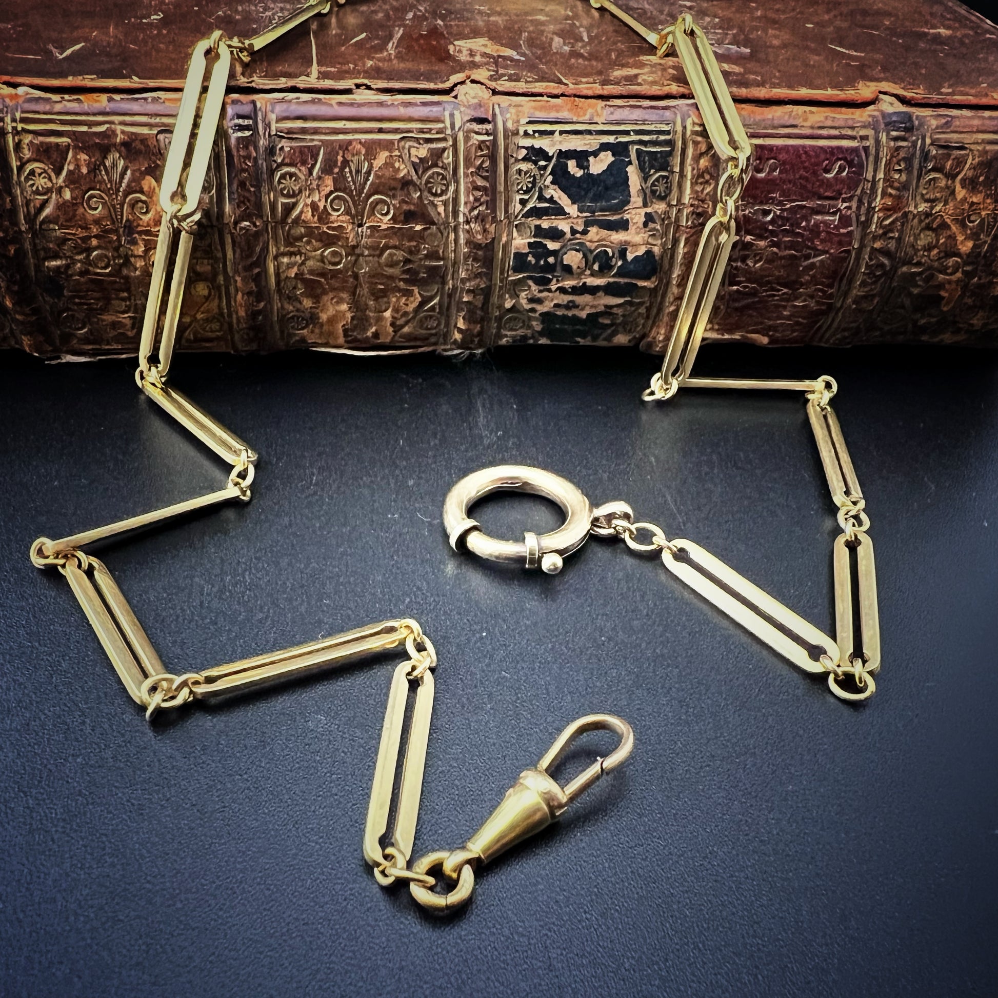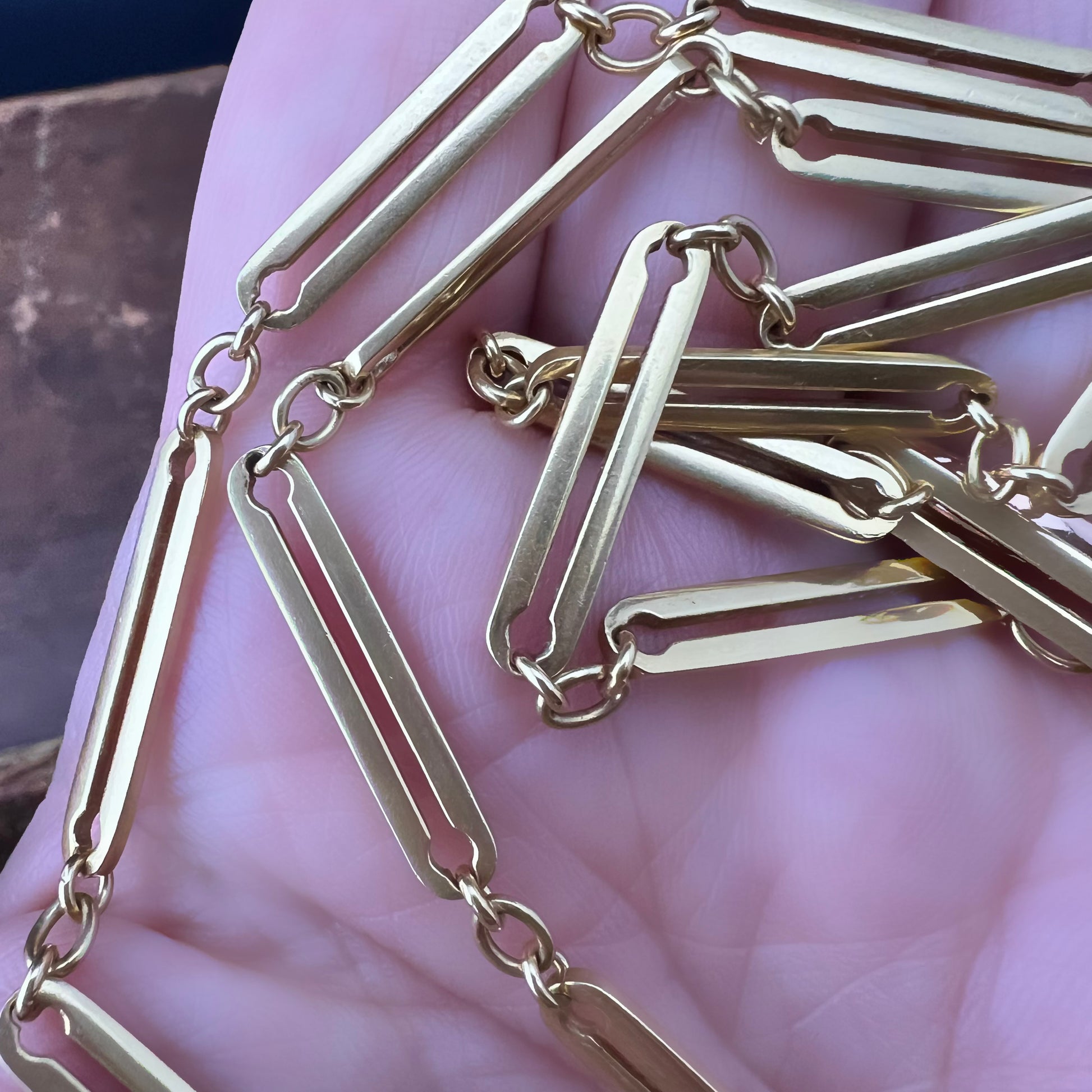 This extraordinary antique chain, dating back to the early 1900s, is a jewel of rare elegance and refinement. Crafted from 18-karat yellow gold, it stands out for its understated yet sophisticated design: the long, flat segments, interspersed with delicate links, create a harmonious and sophisticated visual effect.