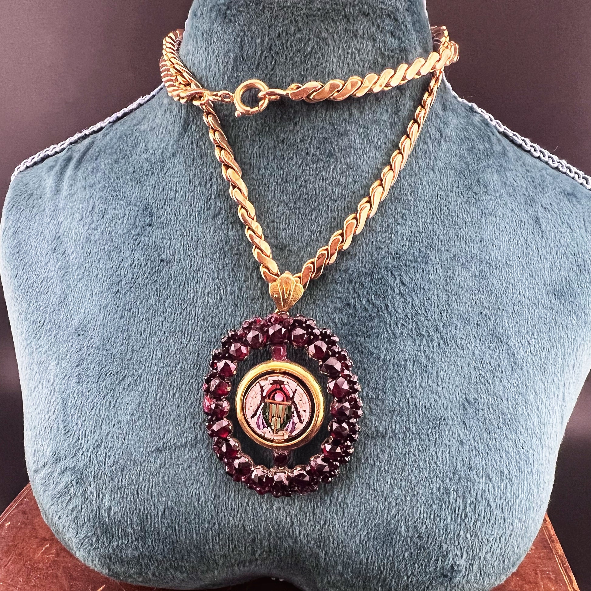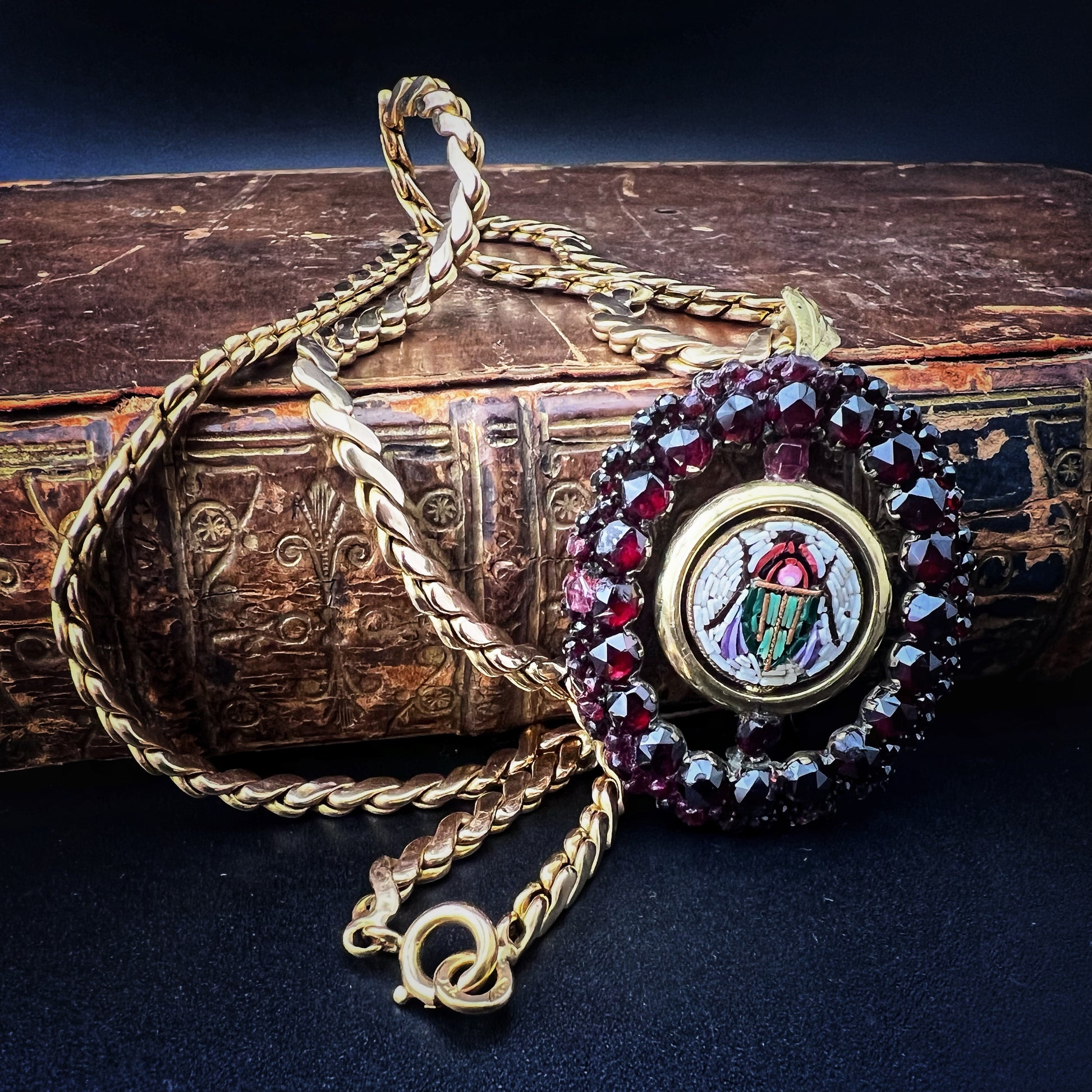 A unique and refined jewel, combining history and craftsmanship in a truly unusual composition. The centerpiece is a rare antique pendant that also served as a brooch, decorated with a micromosaic depicting a scarab, a symbol of rebirth and protection in ancient tradition.