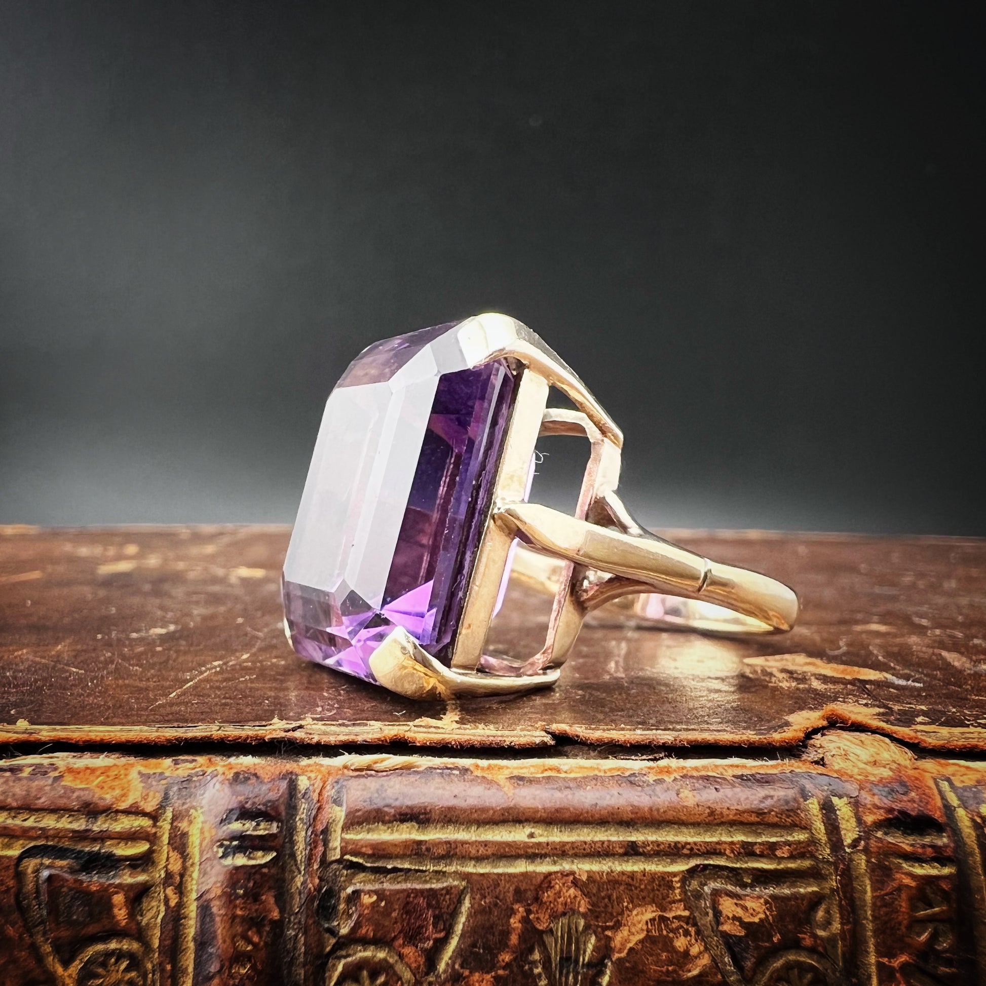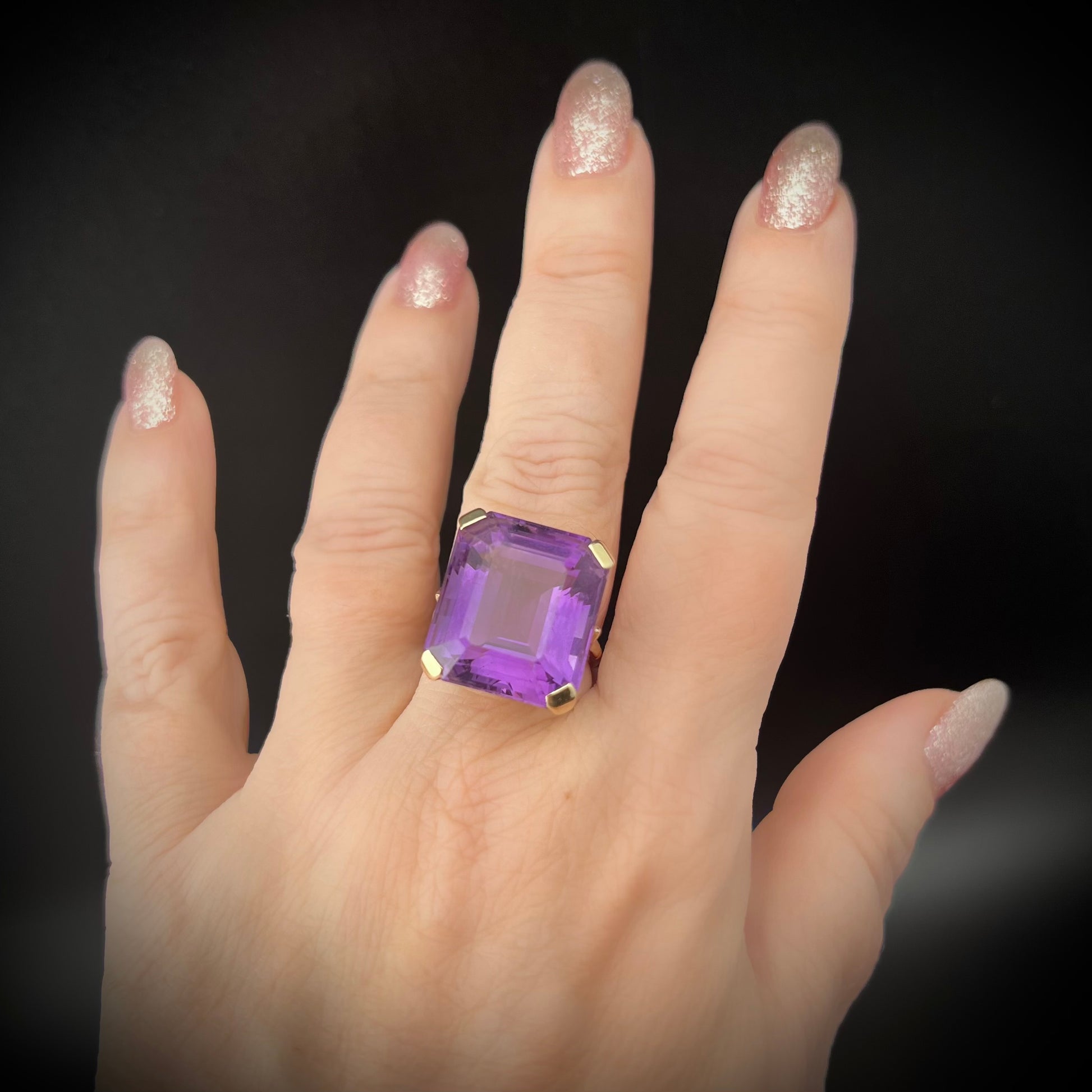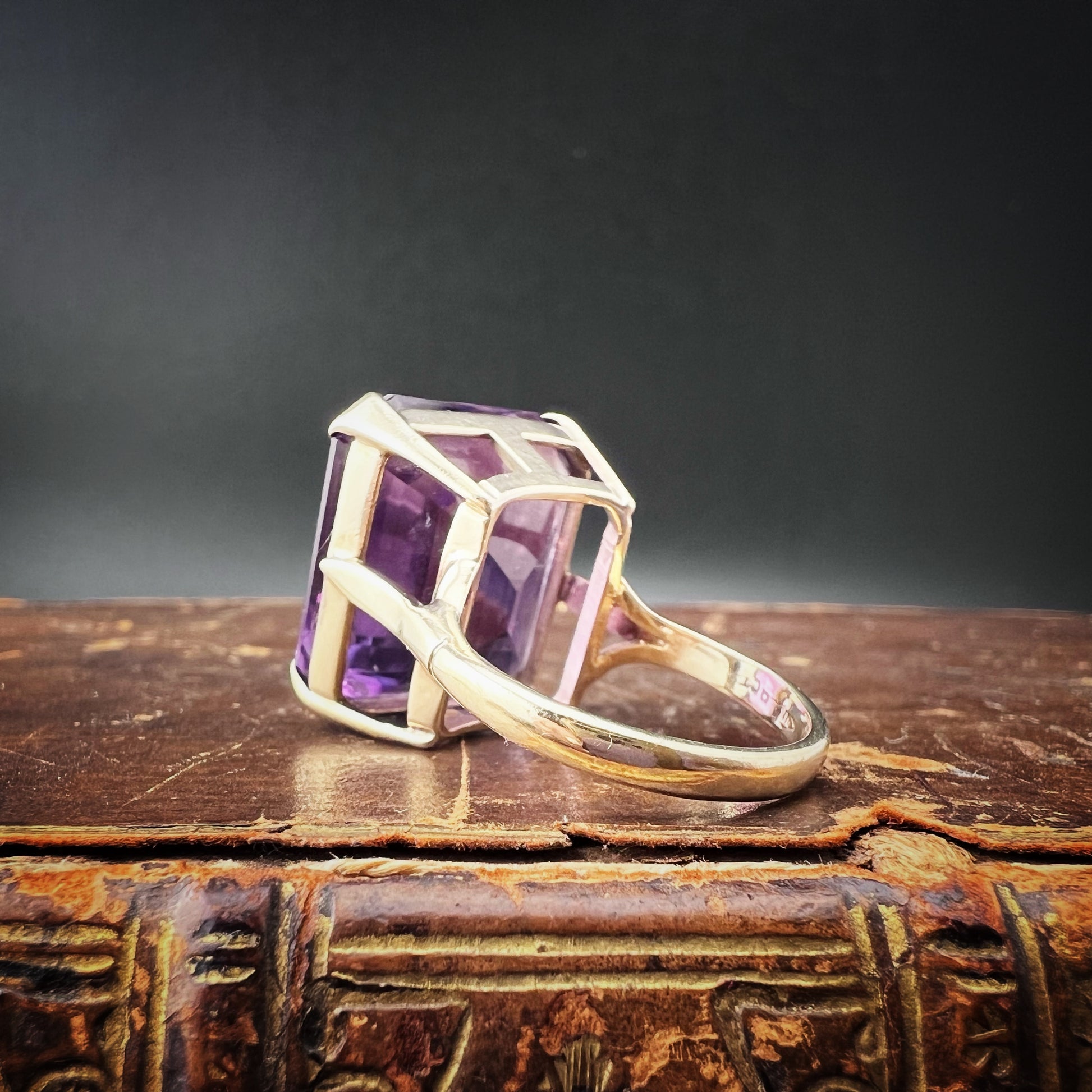 1960s gold cocktail ring with large 23.65 ct amethyst