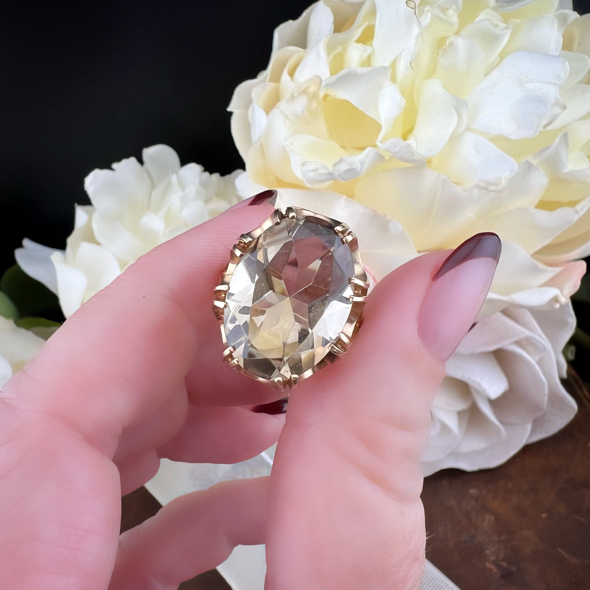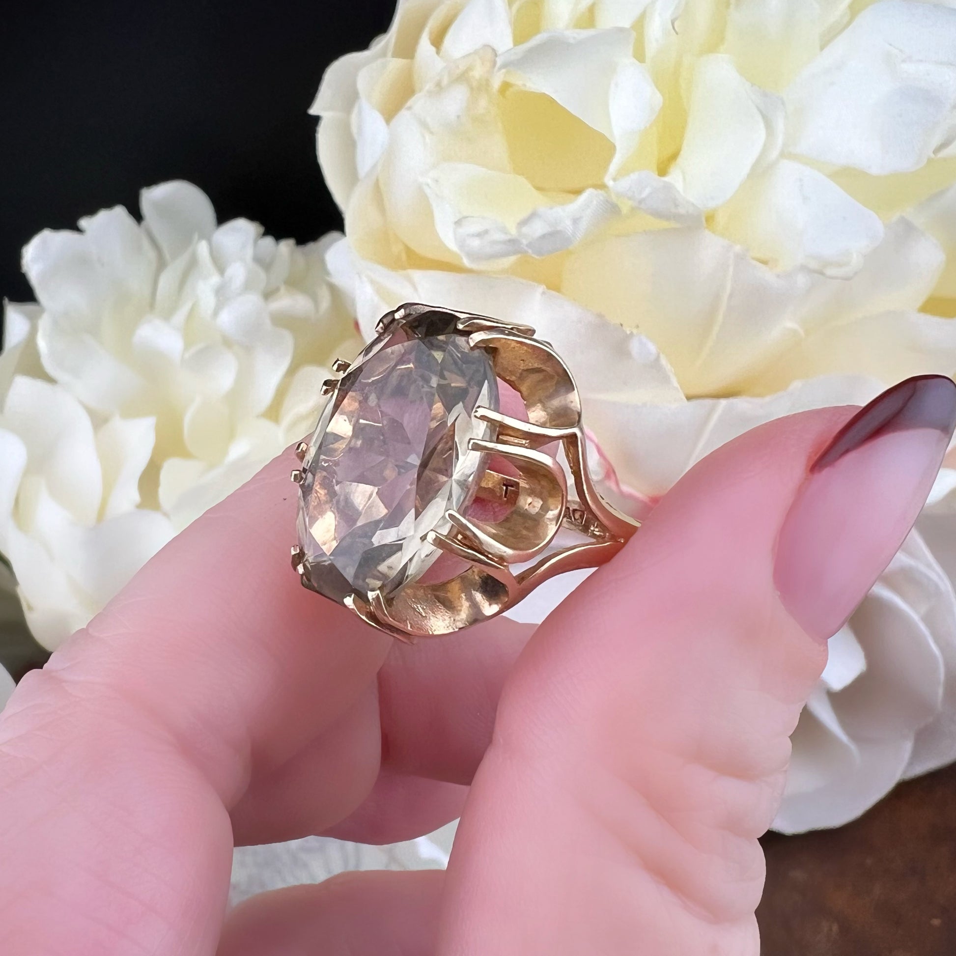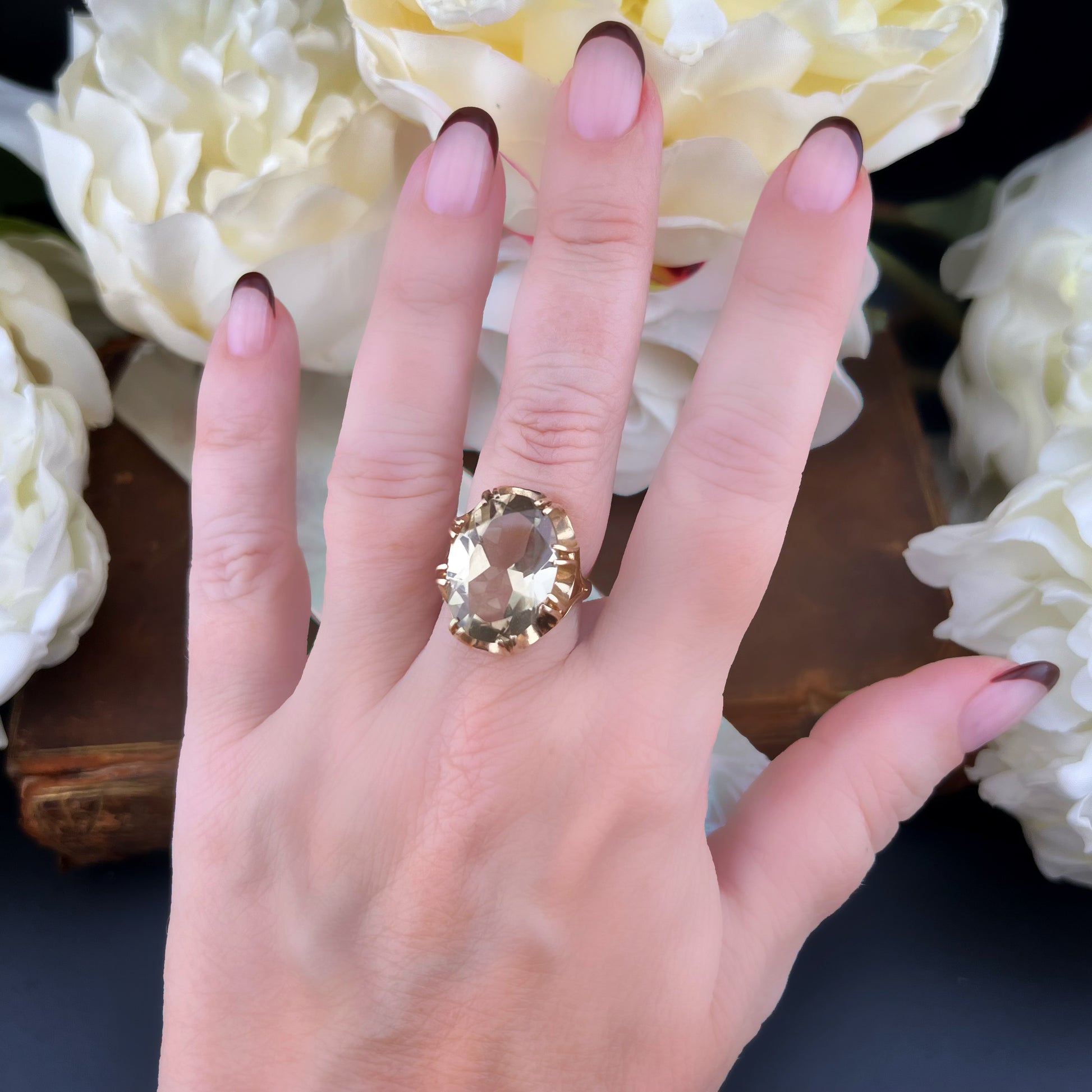 A vintage cocktail ring from Birmingham dating back to 1975, combining vintage elegance with timeless modernity.