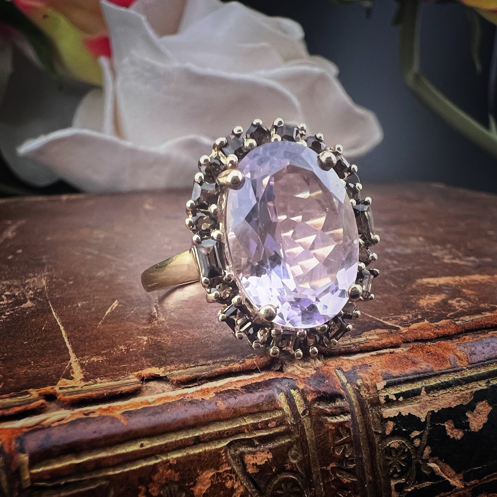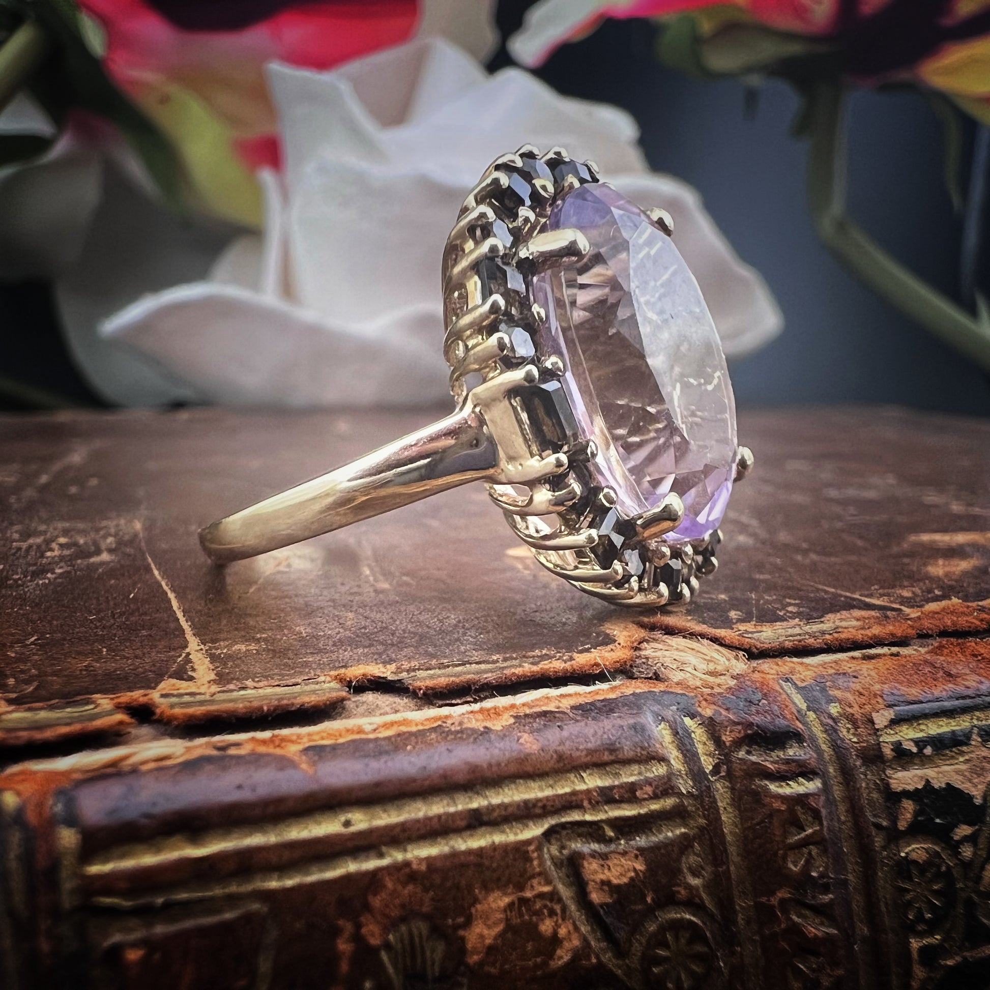 Elegant and dramatic, this vintage English cocktail ring is crafted from 9ct gold and stands out for its theatrical and luminous presence.