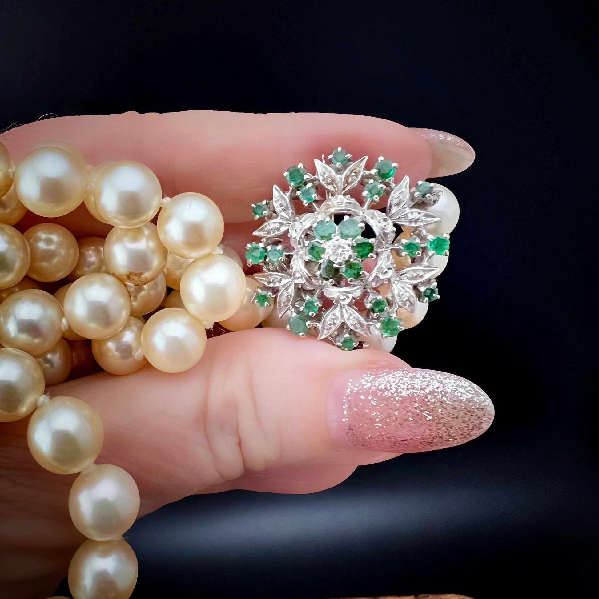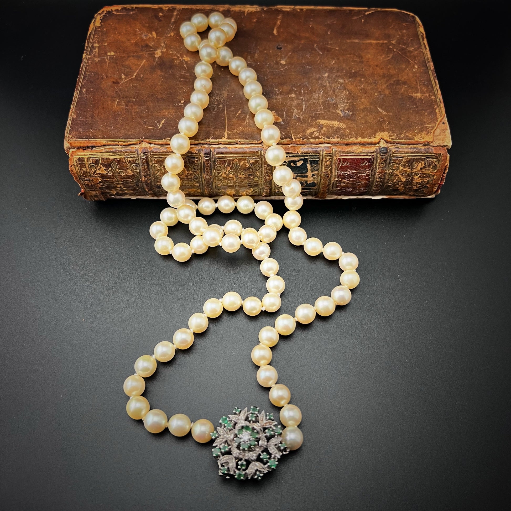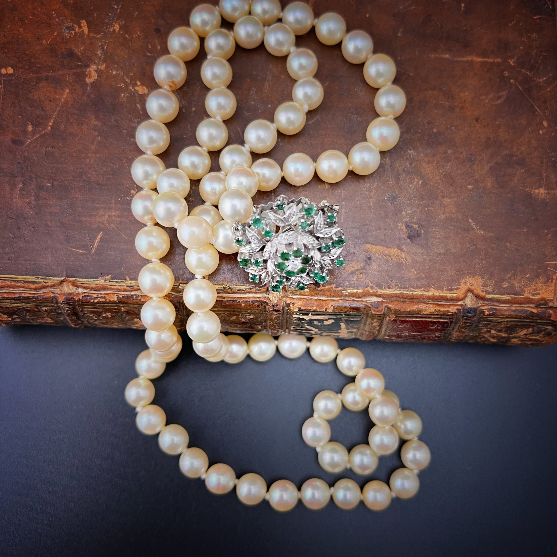 Pearl necklace, 82.5 cm, large 18 ct white gold clasp, emeralds, diamonds