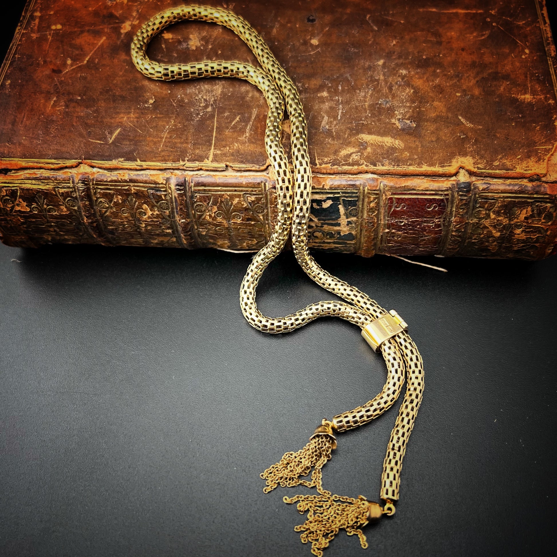 This vintage necklace embodies the essence of timeless luxury. Its original design and the quality of 18-karat gold make it an exclusive and versatile accessory, suitable for both everyday looks and special occasions. The adaptability of the clasp and the refined tassels at the ends make it a one-of-a-kind piece. An unmissable opportunity for those who wish to enrich their jewelry collection with a symbol of style, history, and elegance.