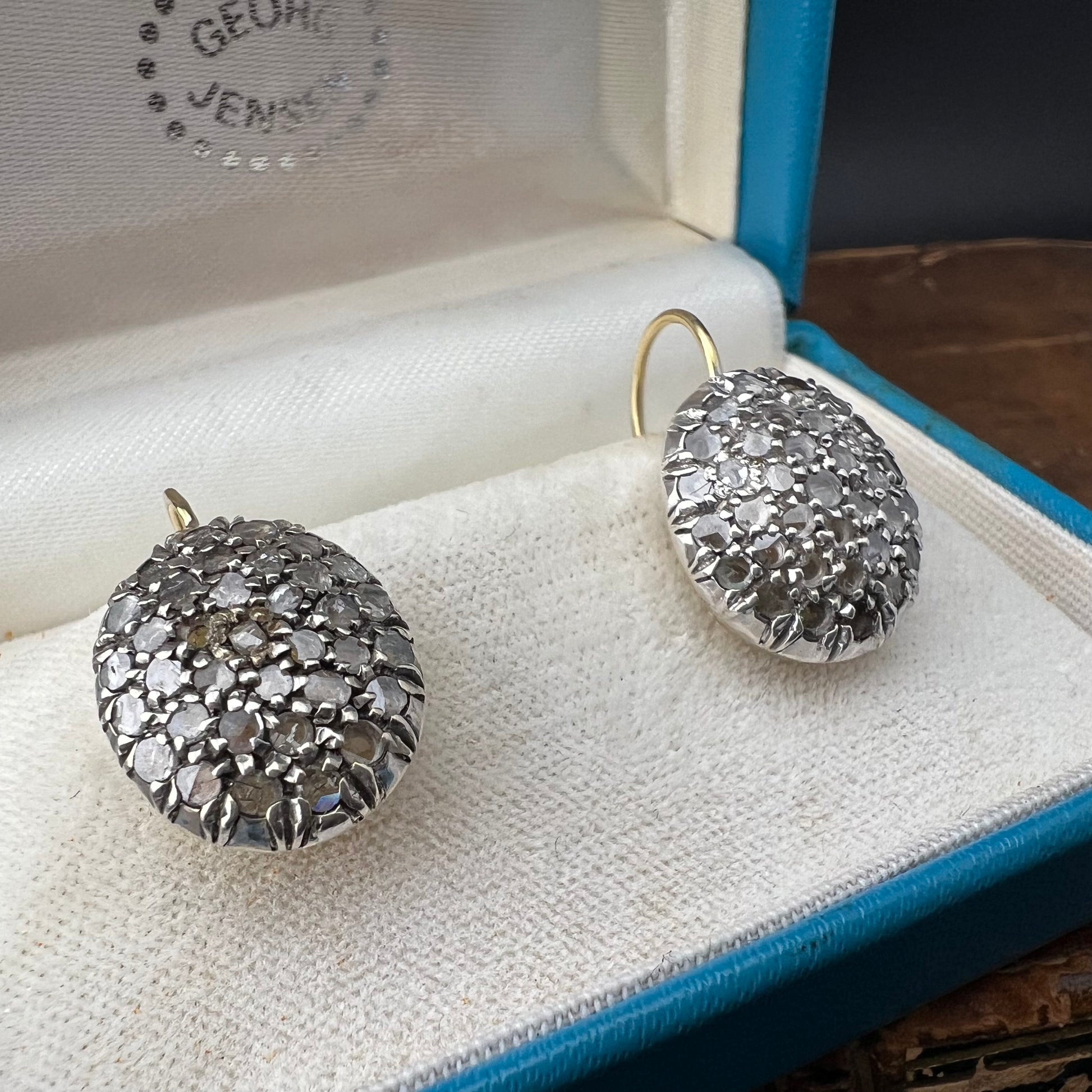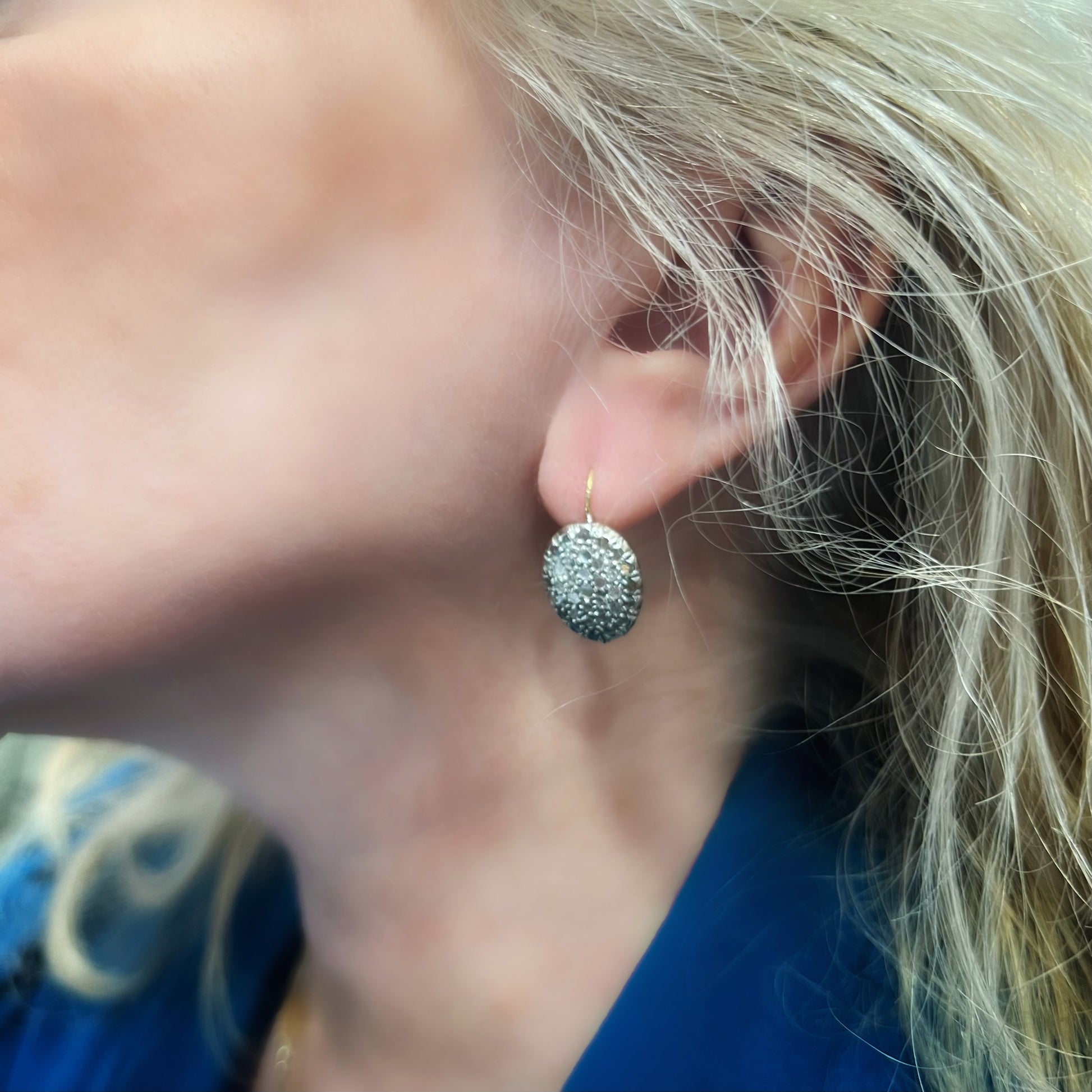 A pair of vintage drop earrings, a traditional example of Italian goldsmith art. The oval design, contrasting with the more common round shape, adds a touch of exclusivity, while the pavé setting of rose-cut diamonds, arranged concentrically, lends an elegant and unmistakable sparkle. These earrings, thanks to their craftsmanship, are a sought-after piece for any collector of vintage jewelry.