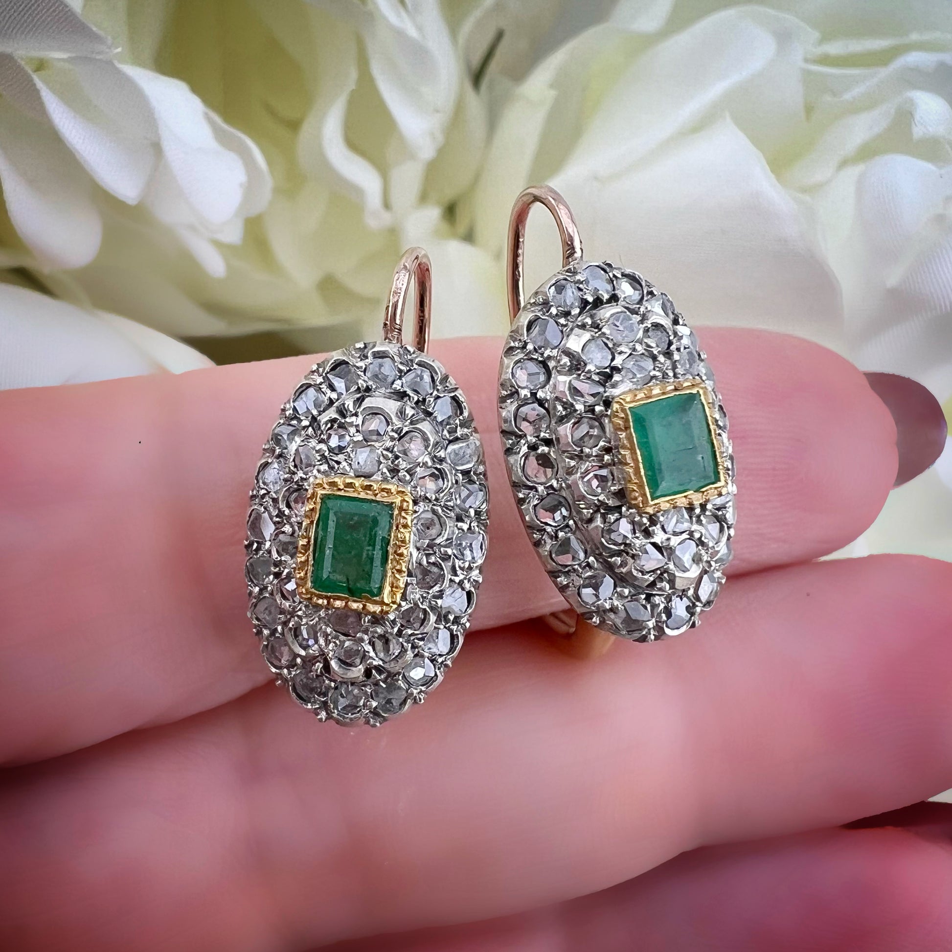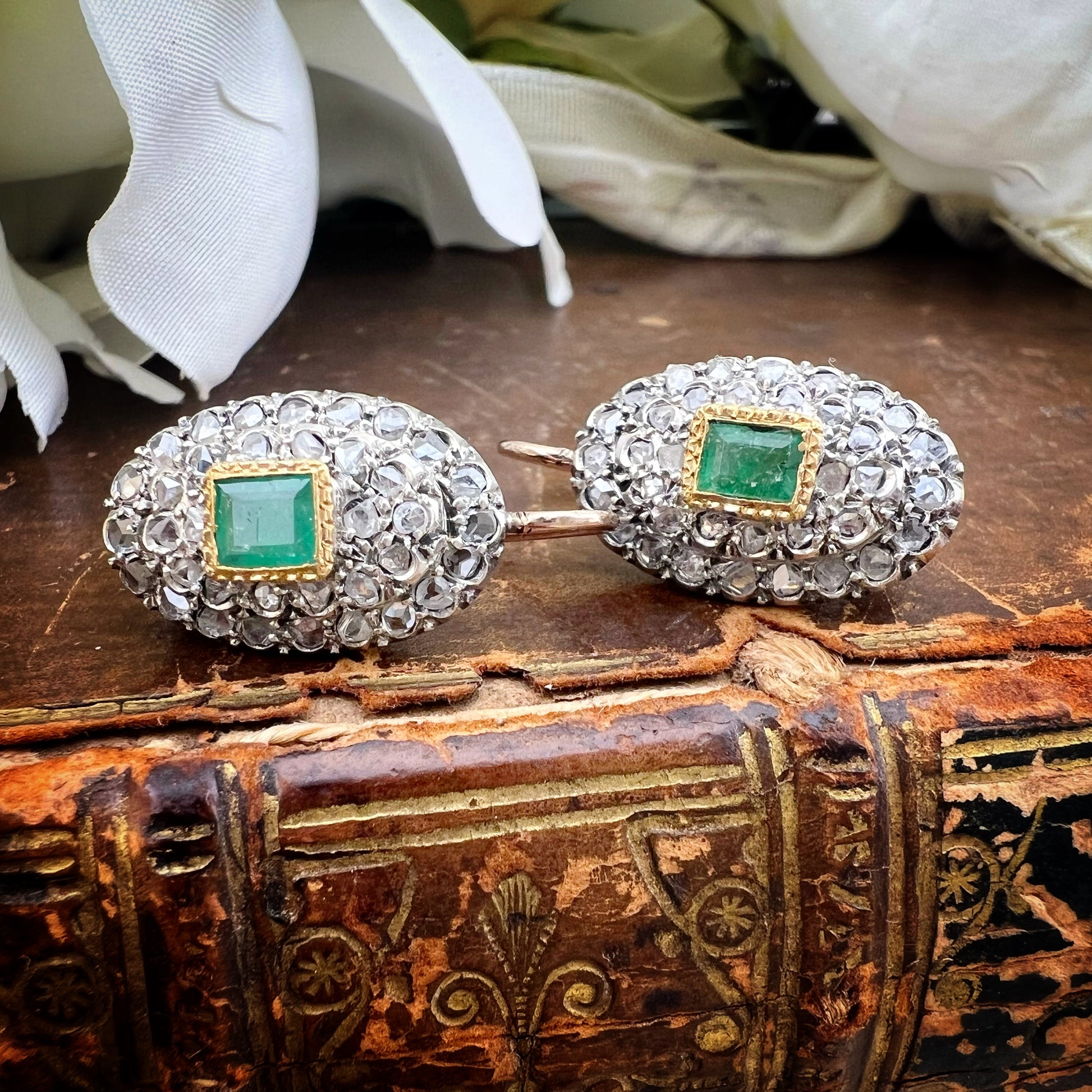 Pair of Gold, Silver, Rosette Diamond and Emerald Earrings – Monachella Model