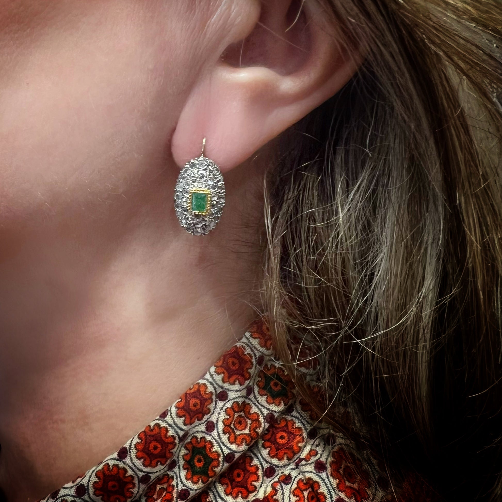 At the center, two natural square-cut emeralds (4.3 x 4 mm) stand out, set in a yellow gold setting that enhances their intense green hue. They are surrounded by a precious frame of rose-cut diamonds: 20 2 mm diamonds and 16 1.5 mm diamonds for each earring, for a total of 72 diamond rosettes that create a refined play of light.