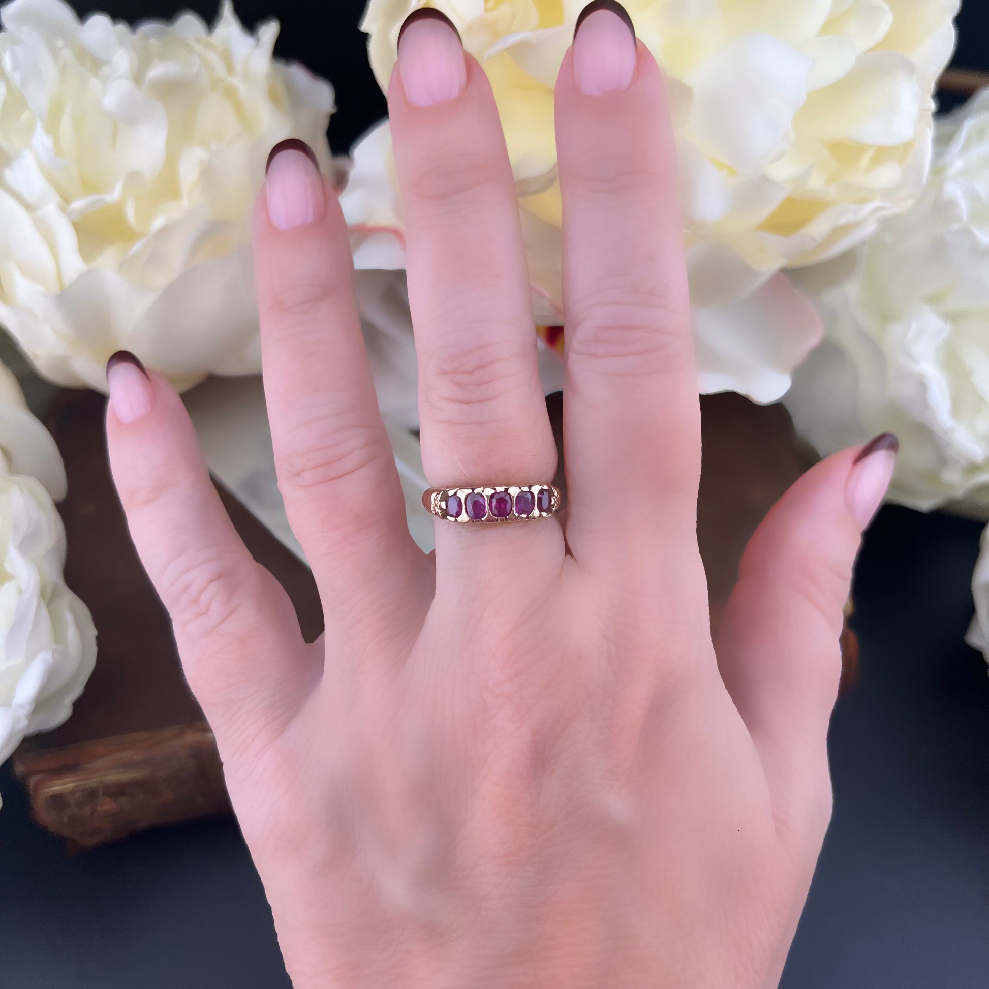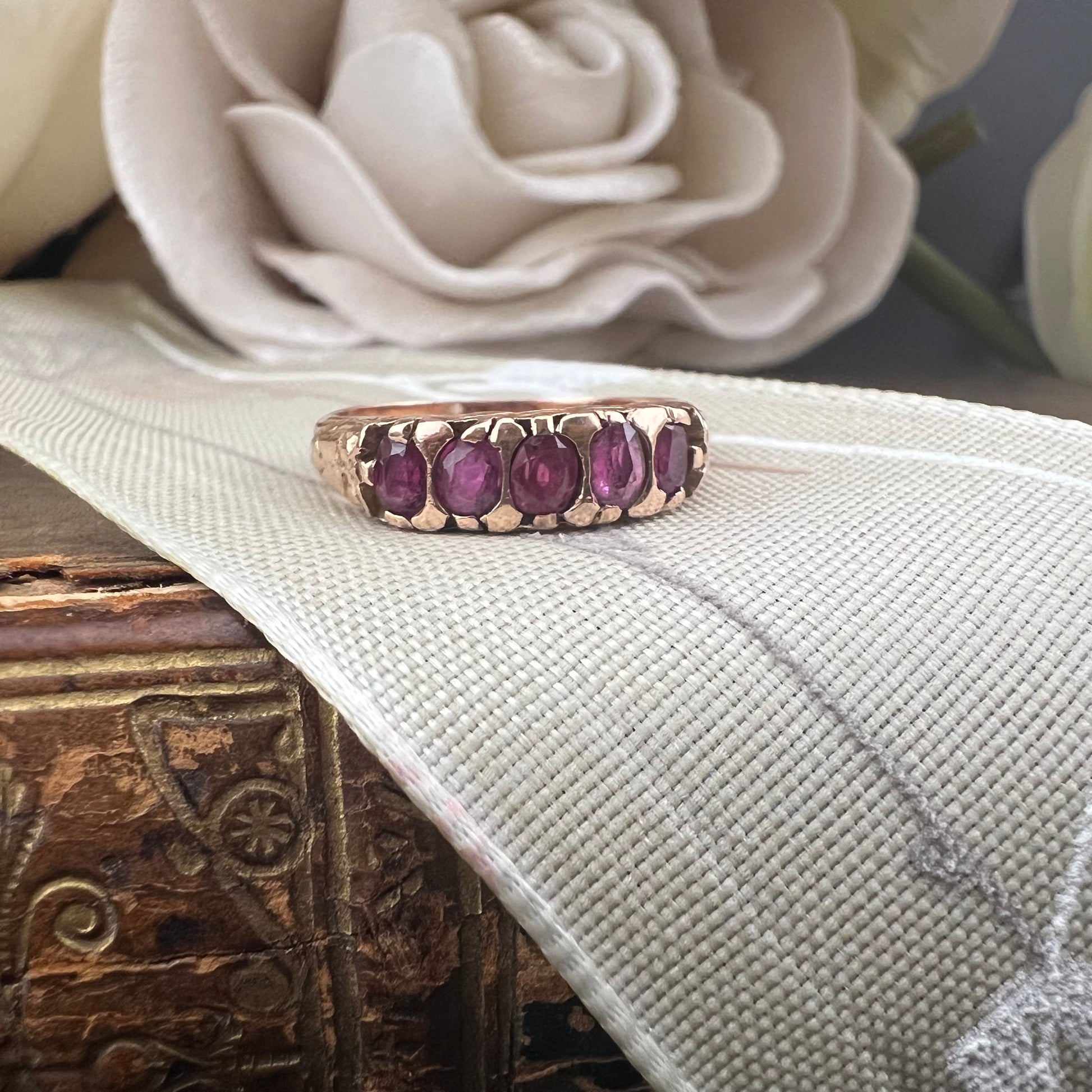 What we see in the photos is an elegant vintage yellow gold ring featuring a solid and harmonious band, embellished with five oval rubies arranged in a row.
