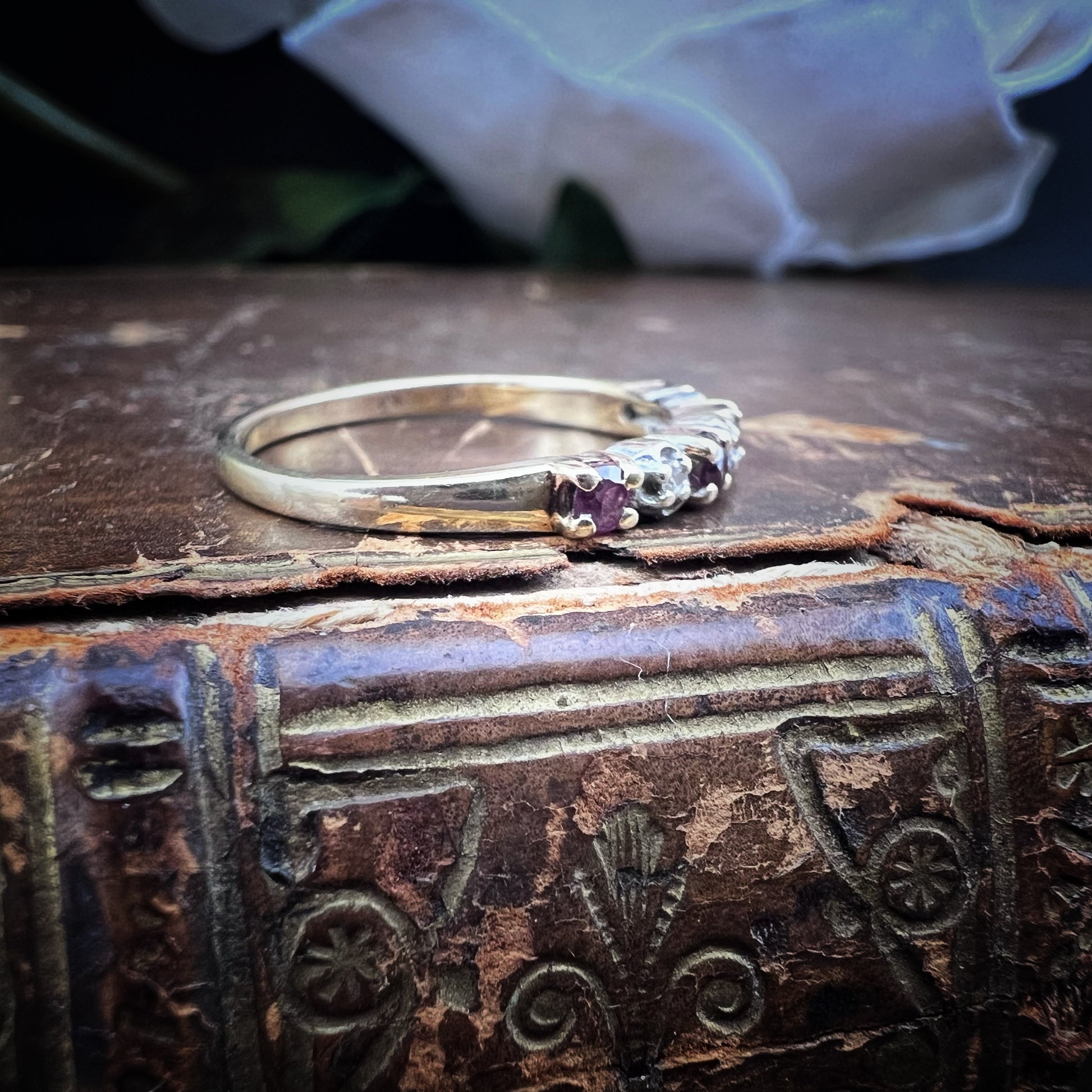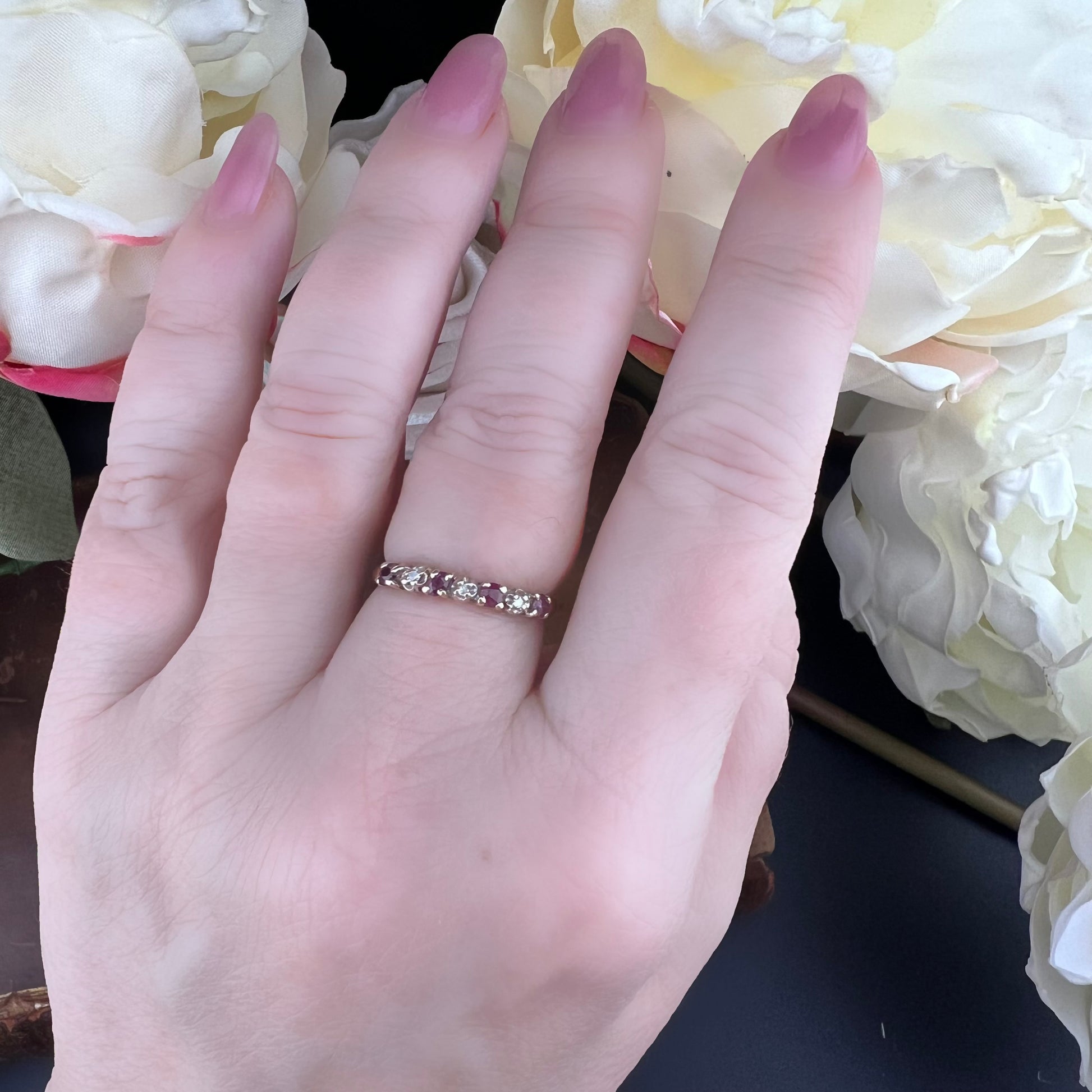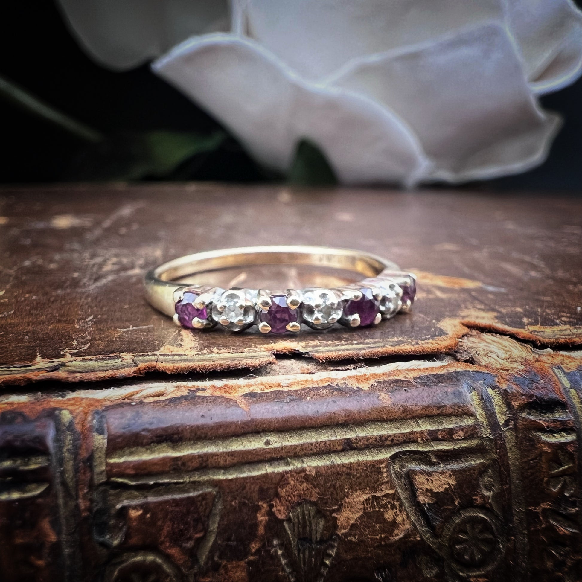 Elegant vintage yellow gold band featuring alternating small diamonds and rubies.