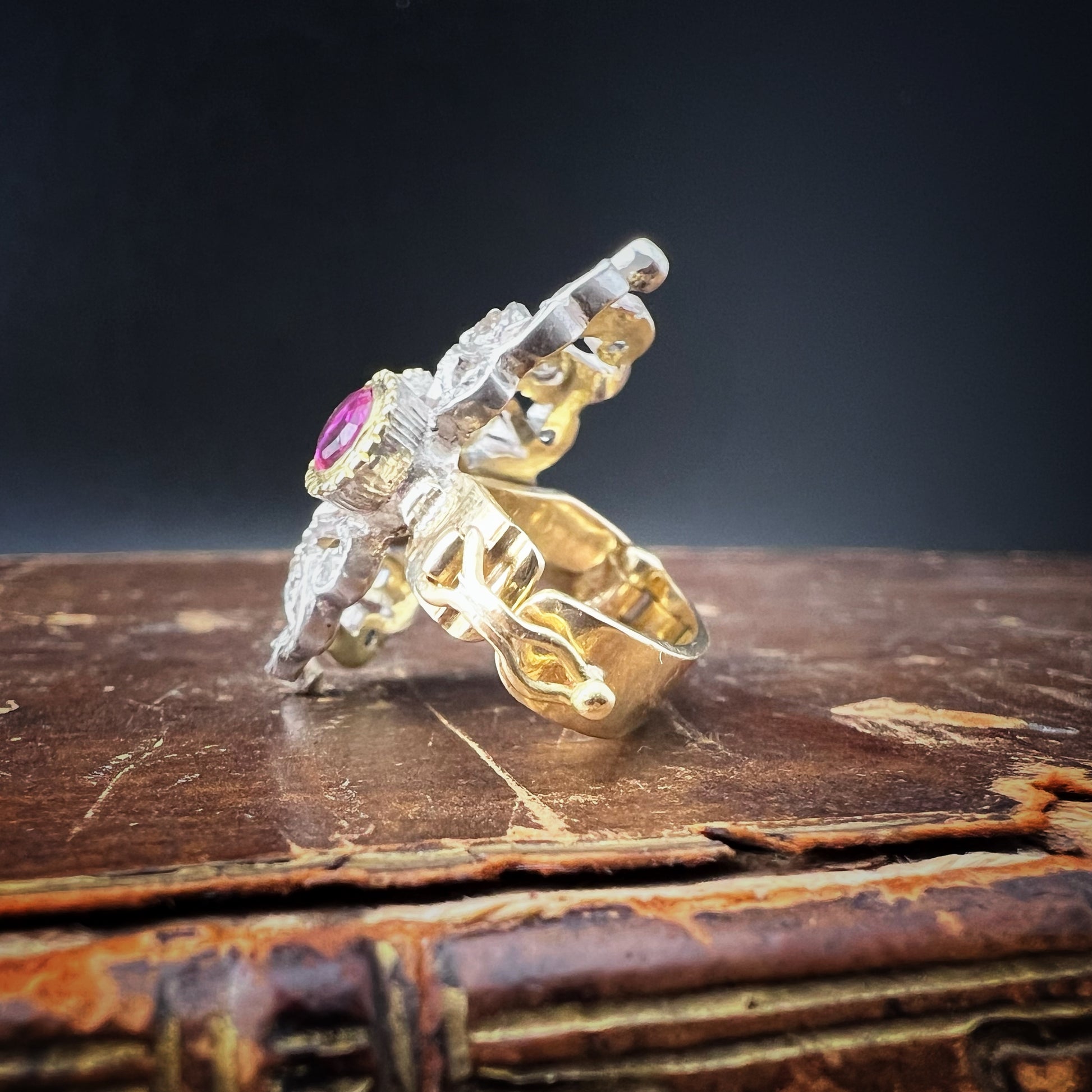 The decoration is illuminated by a row of small diamond rosettes that add brightness and brilliance to the design. At the center, a 6.5 x 4.7 mm oval sapphire stands out, flanked by two oval rubies (5.3 x 4.5 mm each), creating a refined color contrast that enhances the overall beauty of the clasp.