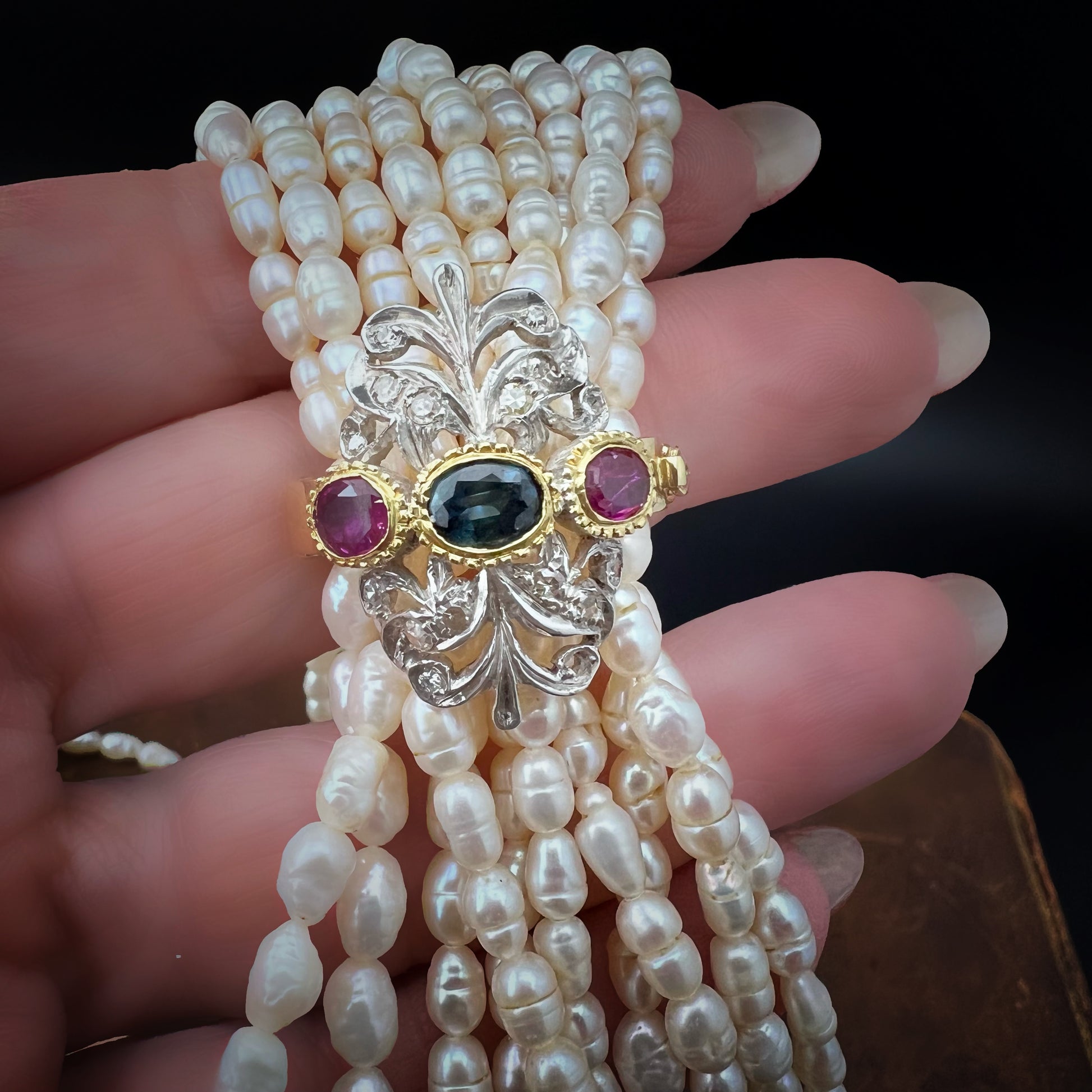 Vintage 18k yellow gold pearl clasp with sapphire, rubies and diamonds