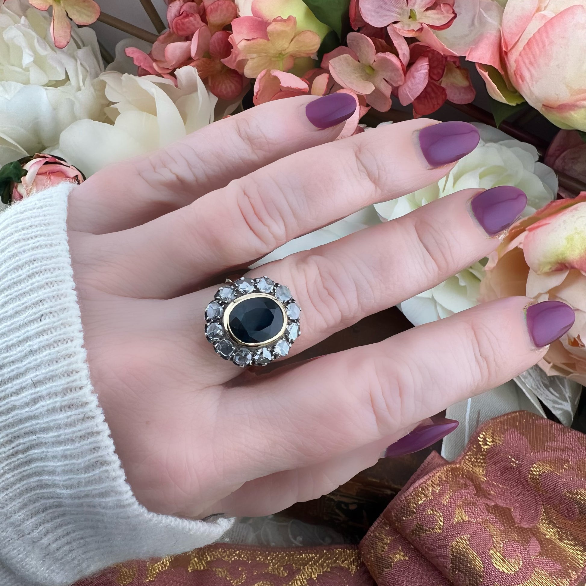 Lo zaffiro è incorniciato da una luminosa corona di 12 diamanti naturali a taglio rosetta, incastonati in argento. Il loro scintillio delicato e vibrante crea un raffinato gioco di luce che valorizza ulteriormente la gemma centrale, conferendo all’anello un equilibrio perfetto tra eleganza, presenza scenica e fascino senza tempo.