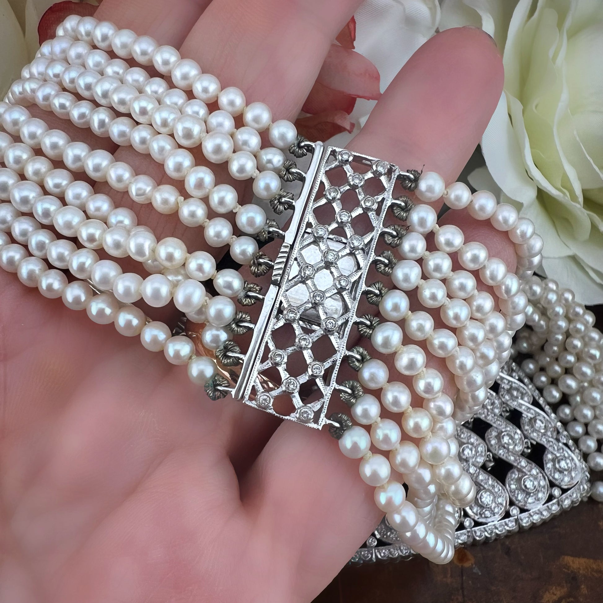 Importante collana choker di alto livello a nove fili di perle marine Akoya, esempio di alta manifattura orafa italiana della fine del Novecento, caratterizzata da un design scenografico ed estremamente raffinato.
