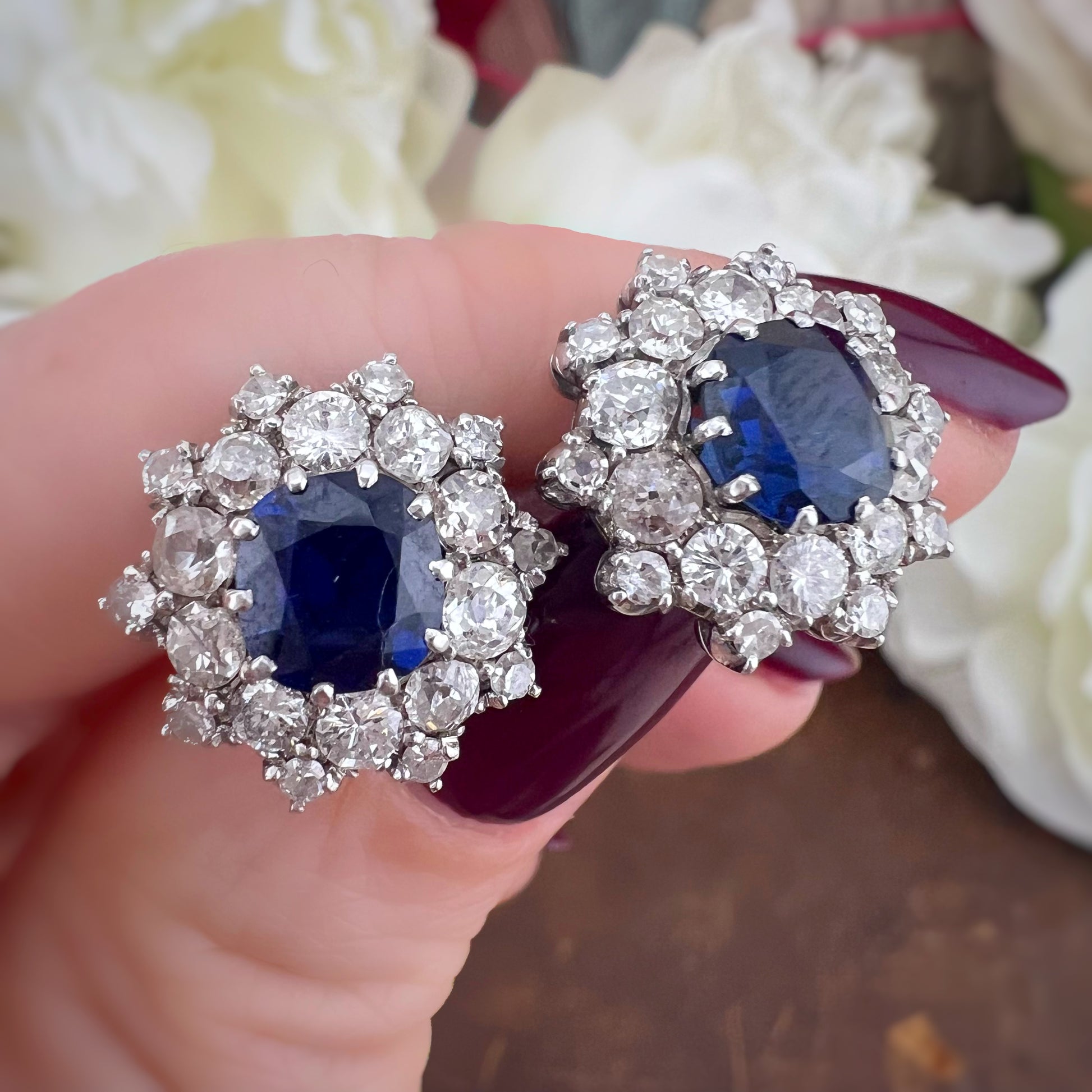 Un’eleganza luminosa e senza tempo caratterizza questi magnifici orecchini in oro bianco 18 ct con zaffiri e diamanti, realizzati in Europa nella prima metà del XX secolo.