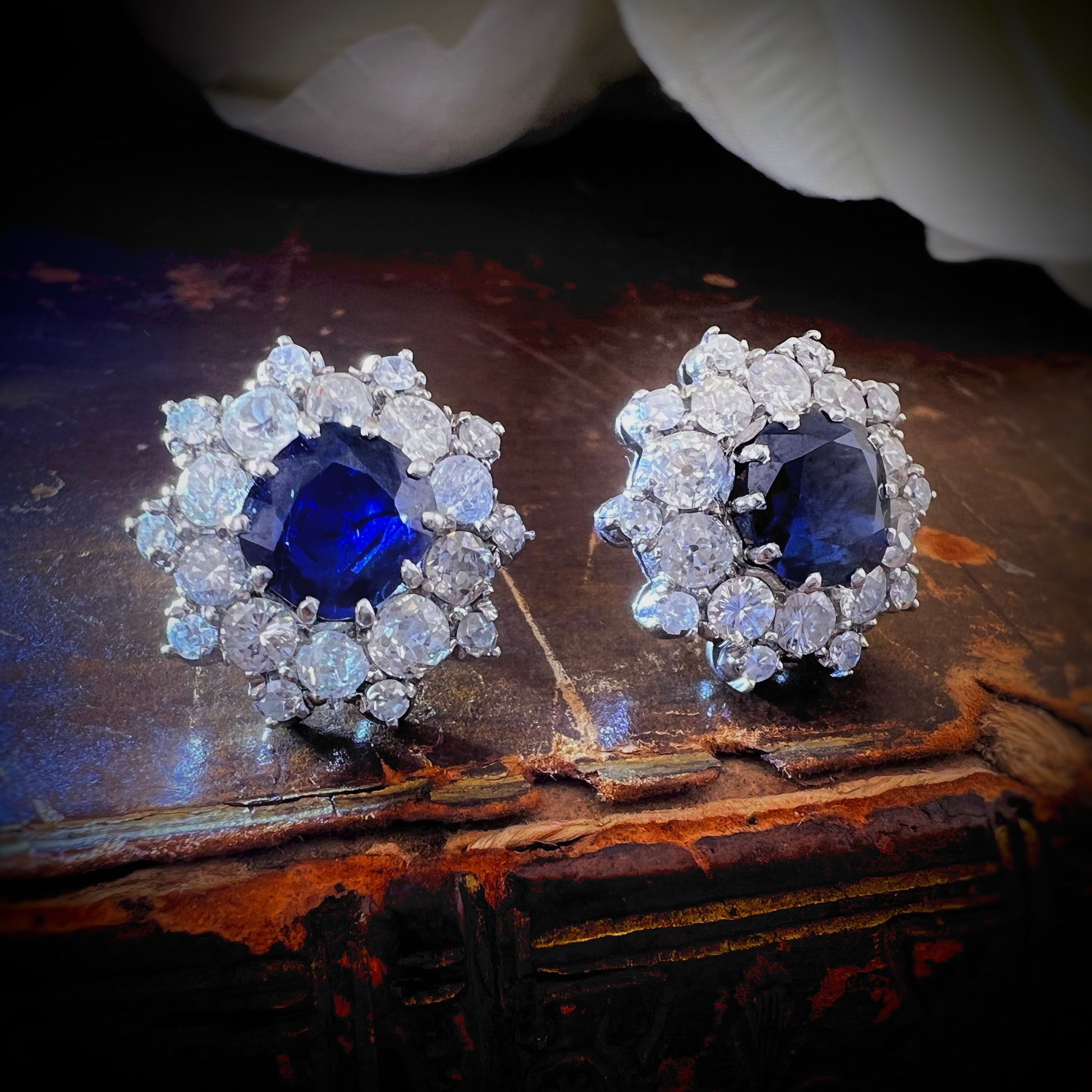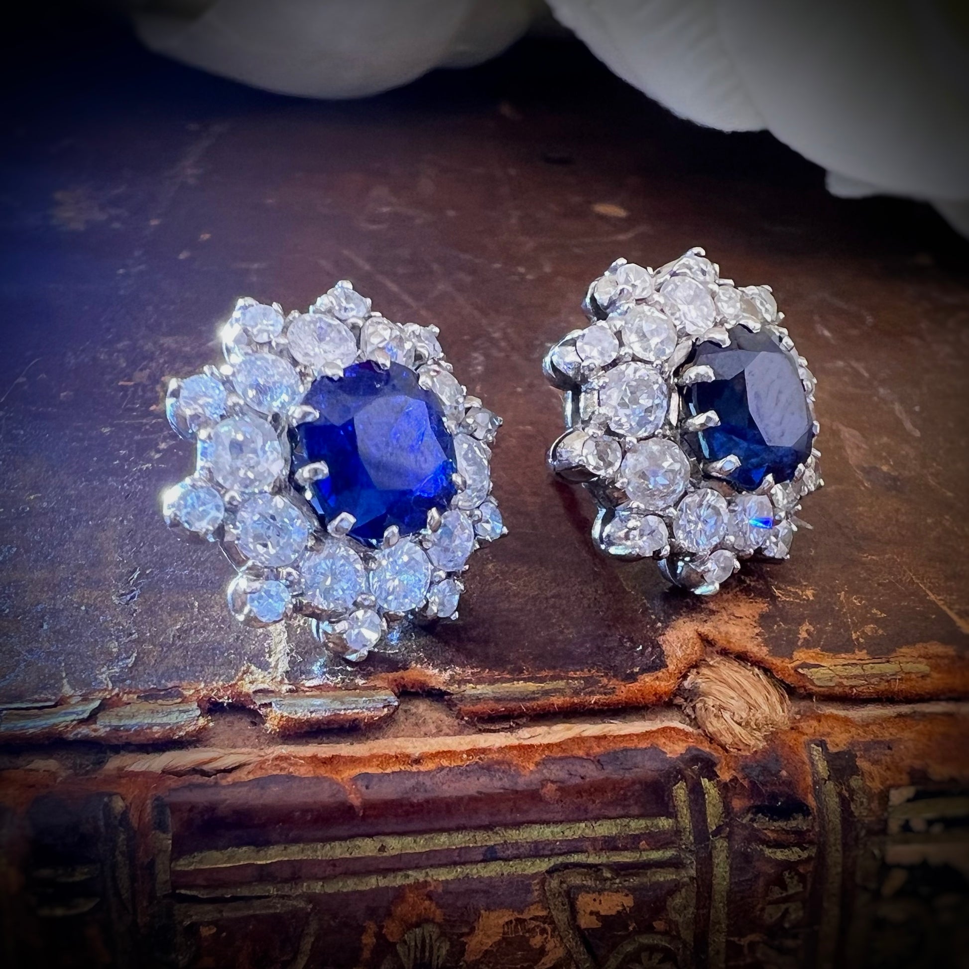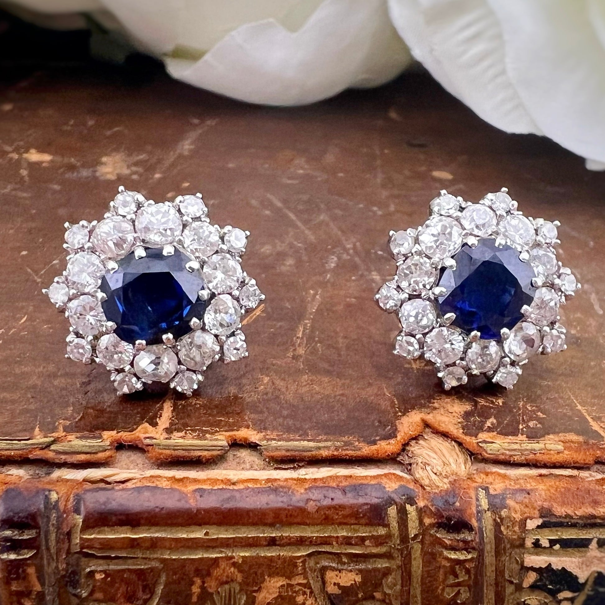 Al centro, due zaffiri dal blu intenso e vivido, tagliati in forma tonda sfaccettata, catturano lo sguardo con profondità vellutata. Attorno a essi si apre un primo giro di diamanti old mine cut e old European cut, scelti per la loro brillantezza morbida e calda: il tipico scintillio conferisce un fascino antico e prezioso, decisamente diverso dalla brillantezza moderna.