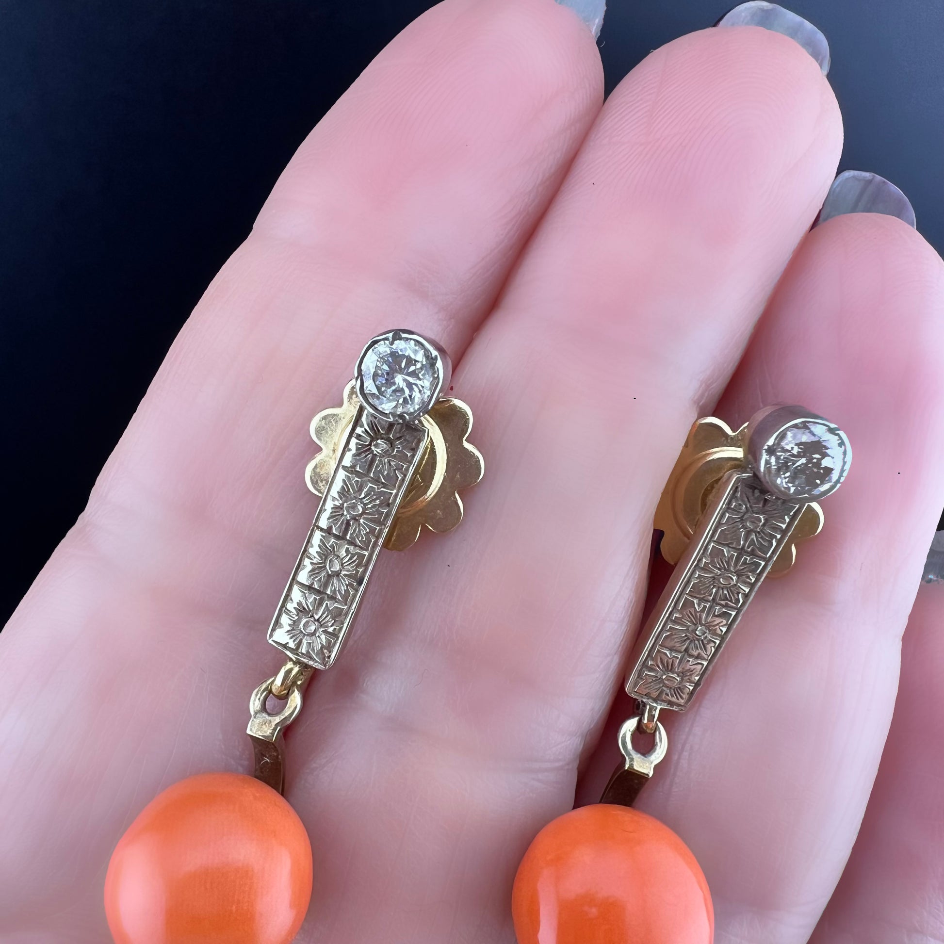 A refined example of 1930s jewelry, these earrings stand out for their elegant and original structure. An engraved 14-karat yellow gold bar culminates at the lobe with a timeless antique diamond. The focal point of the design is the natural coral, turned into a button, set on a swinging support that gives the piece movement and lightness.