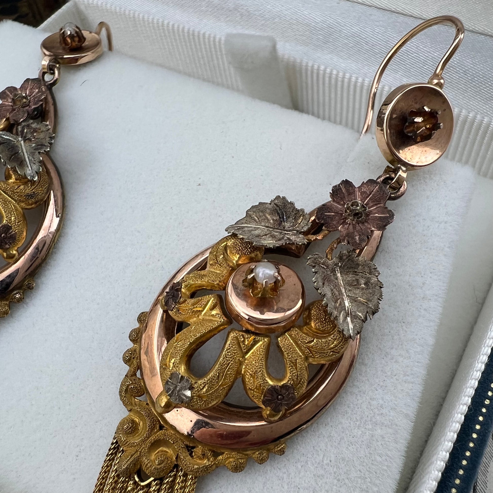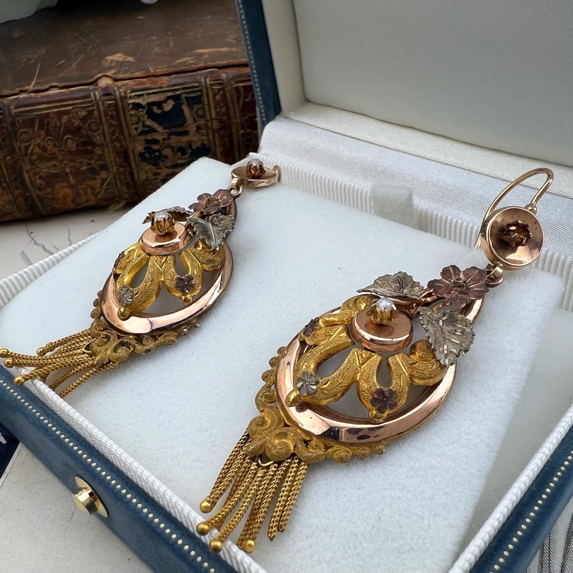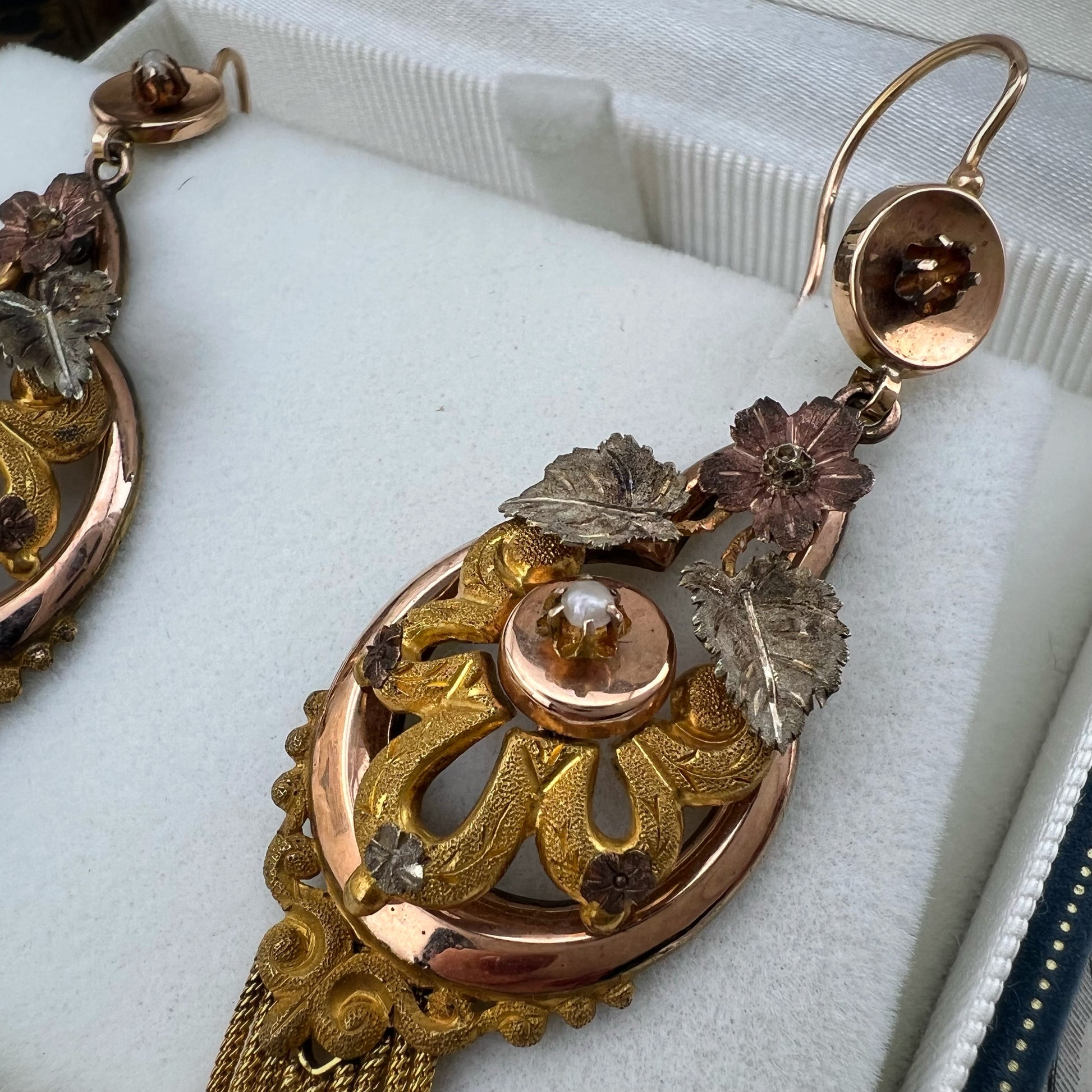 Realizzati in oro giallo, rosa e verde — caratteristica tipica dei gioielli aristocratici borbonici — questi orecchini presentano un corpo a struttura traforata, arricchito da applicazioni floreali e fogliari finemente modellate a mano. Le piccole perline centrali aggiungono un tocco di delicatezza romantica, simbolo di purezza e raffinatezza.
