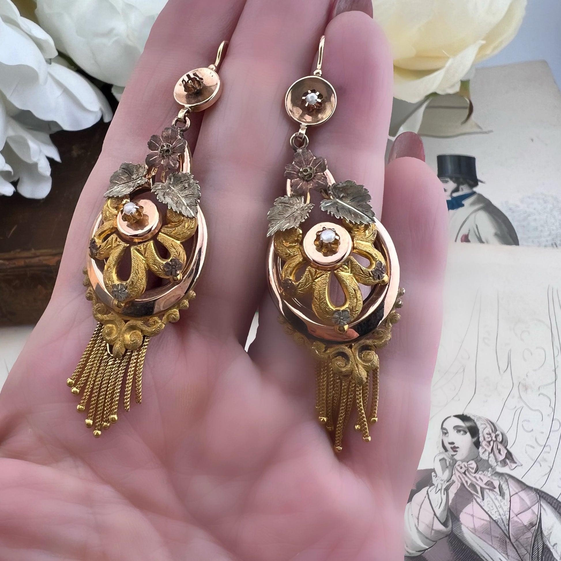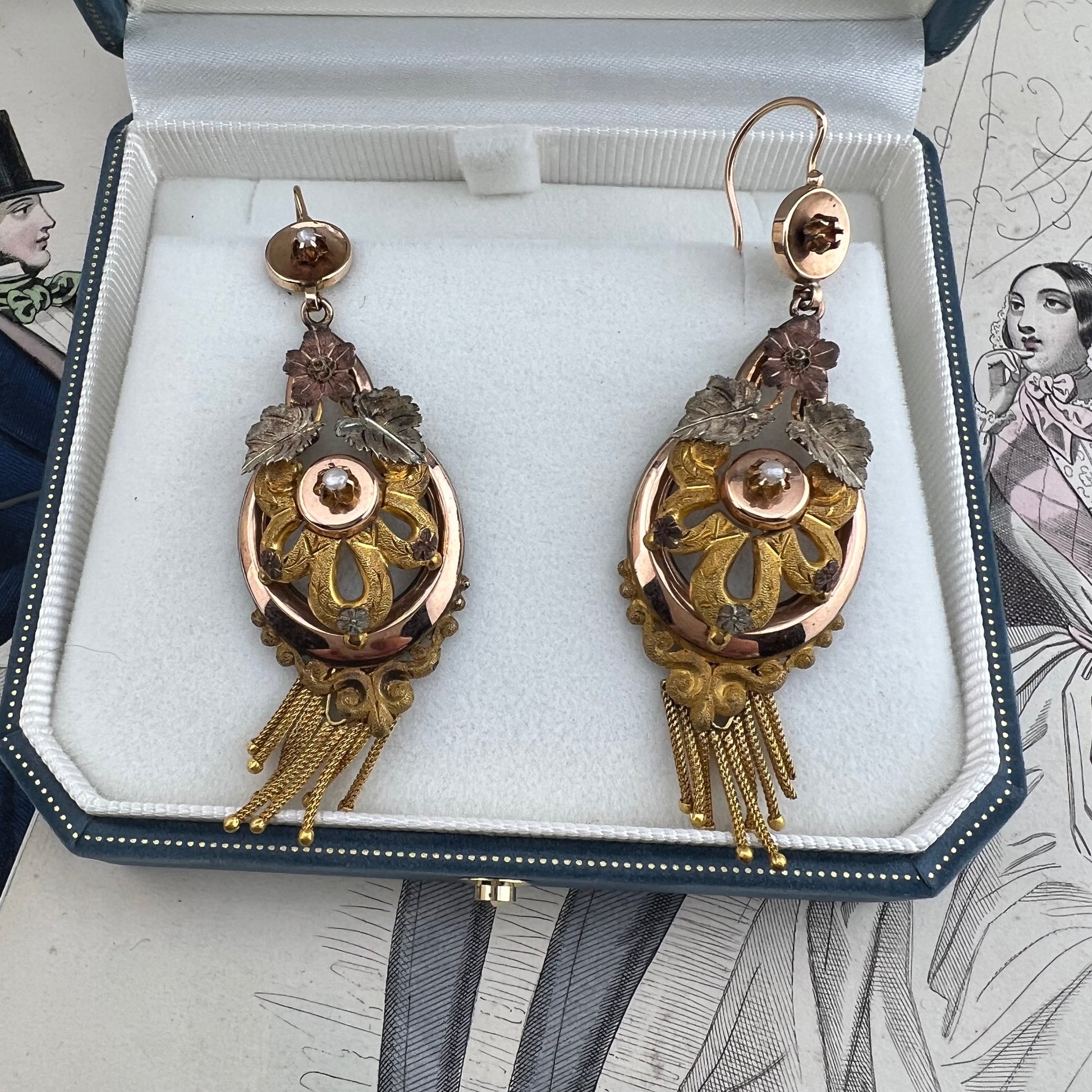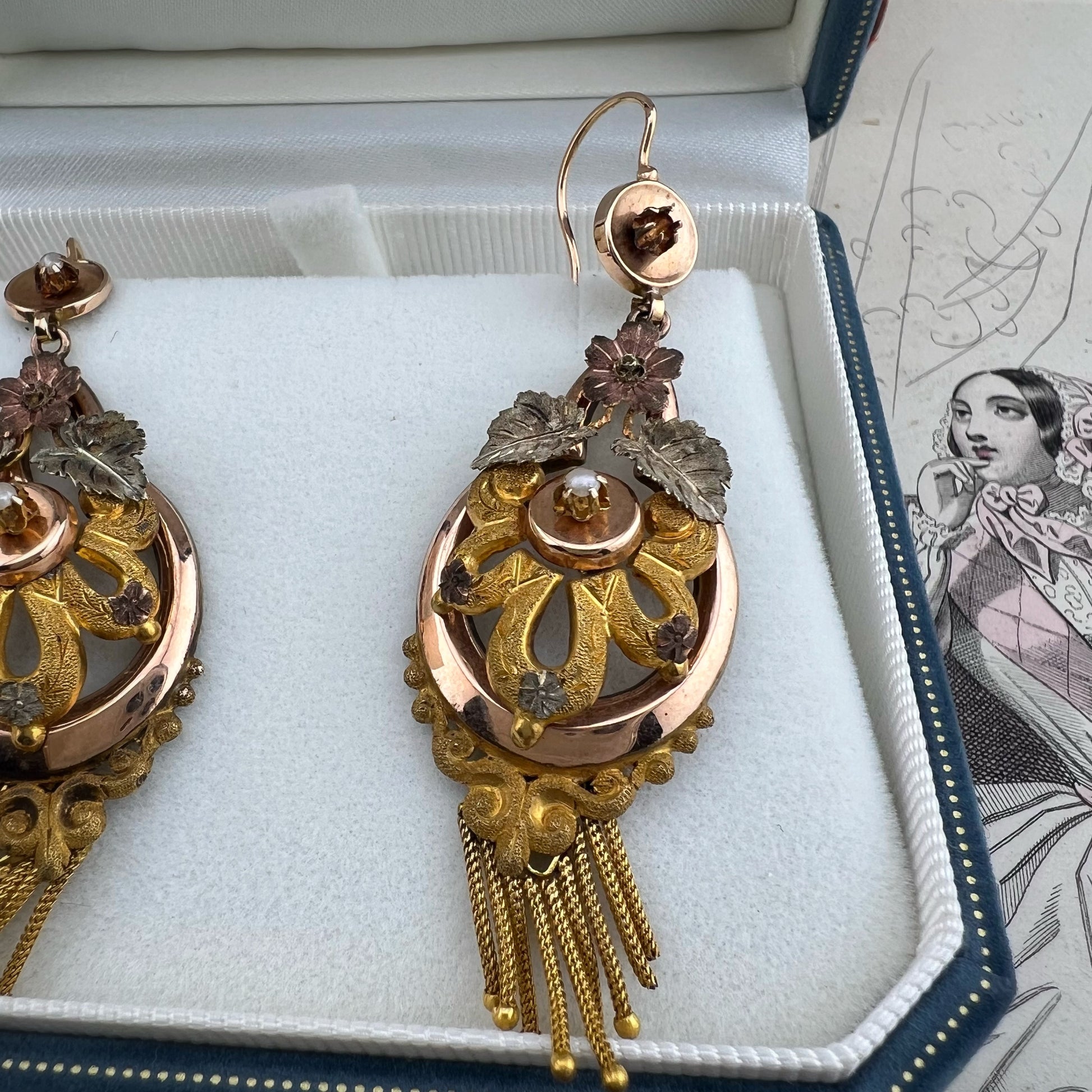 Realizzati in oro giallo, rosa e verde — caratteristica tipica dei gioielli aristocratici borbonici — questi orecchini presentano un corpo a struttura traforata, arricchito da applicazioni floreali e fogliari finemente modellate a mano. Le piccole perline centrali aggiungono un tocco di delicatezza romantica, simbolo di purezza e raffinatezza.
