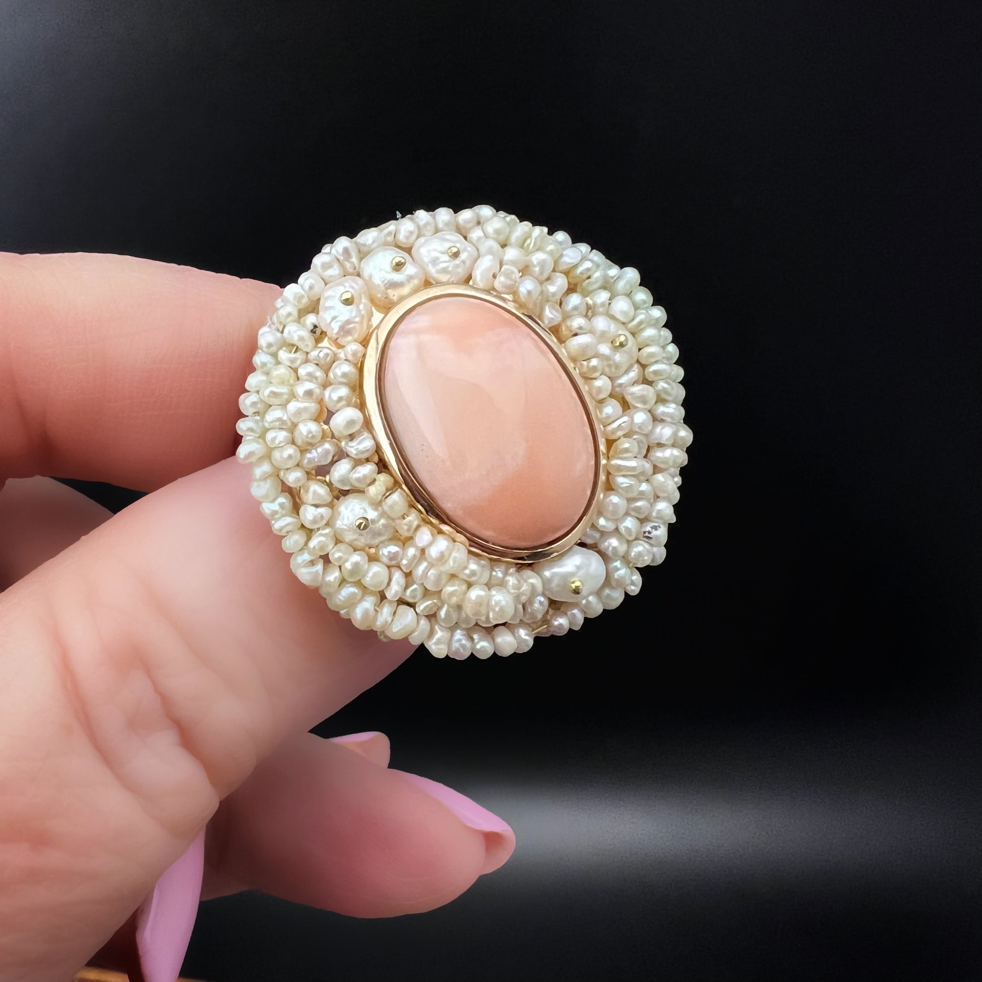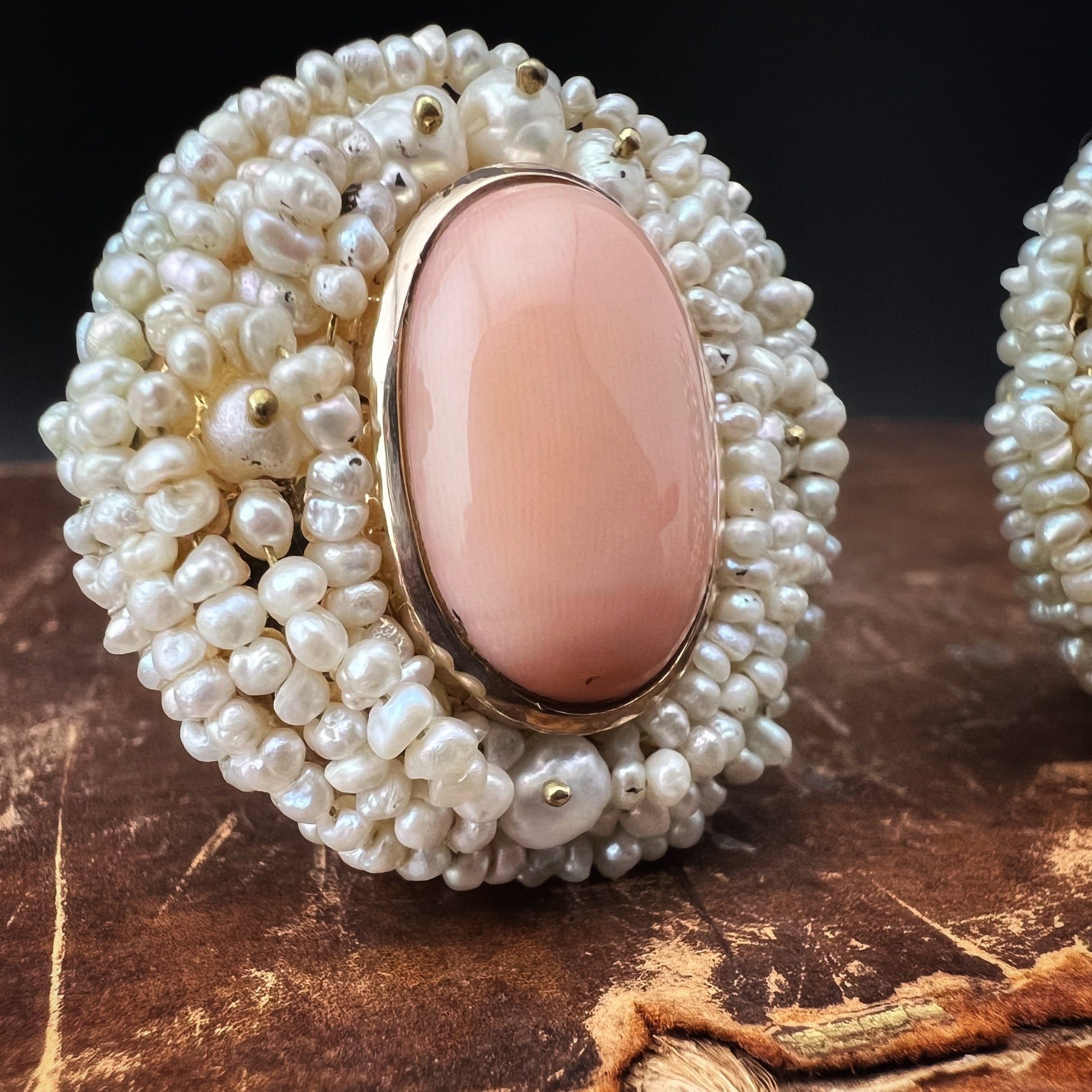 These stunning earrings feature a round 14-karat gold frame, centered by two oval pink coral cabochons, carefully set to enhance their natural beauty. Surrounding the coral, a delicate series of natural river pearls, strung with gold wire, creates a refined interplay of texture and shine.