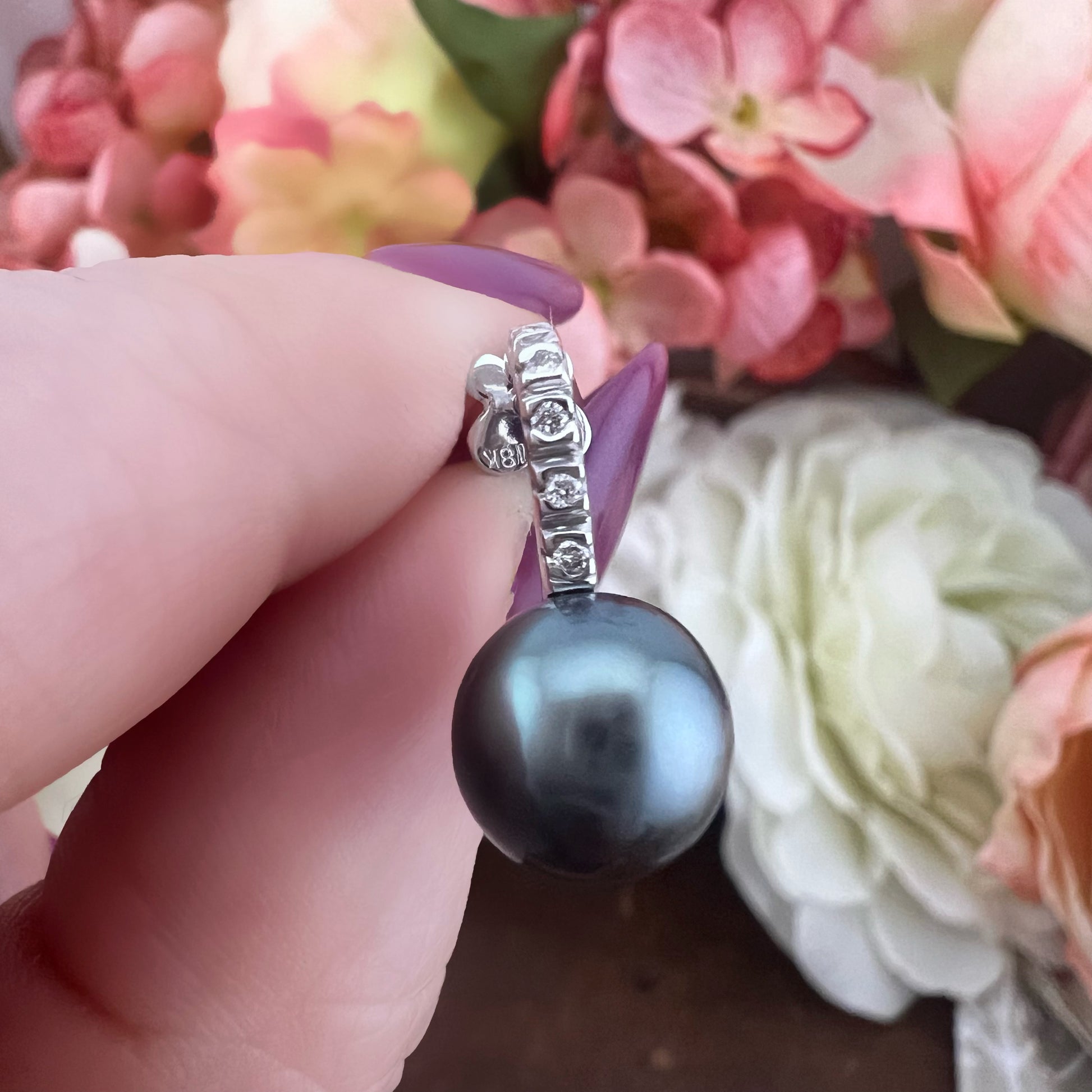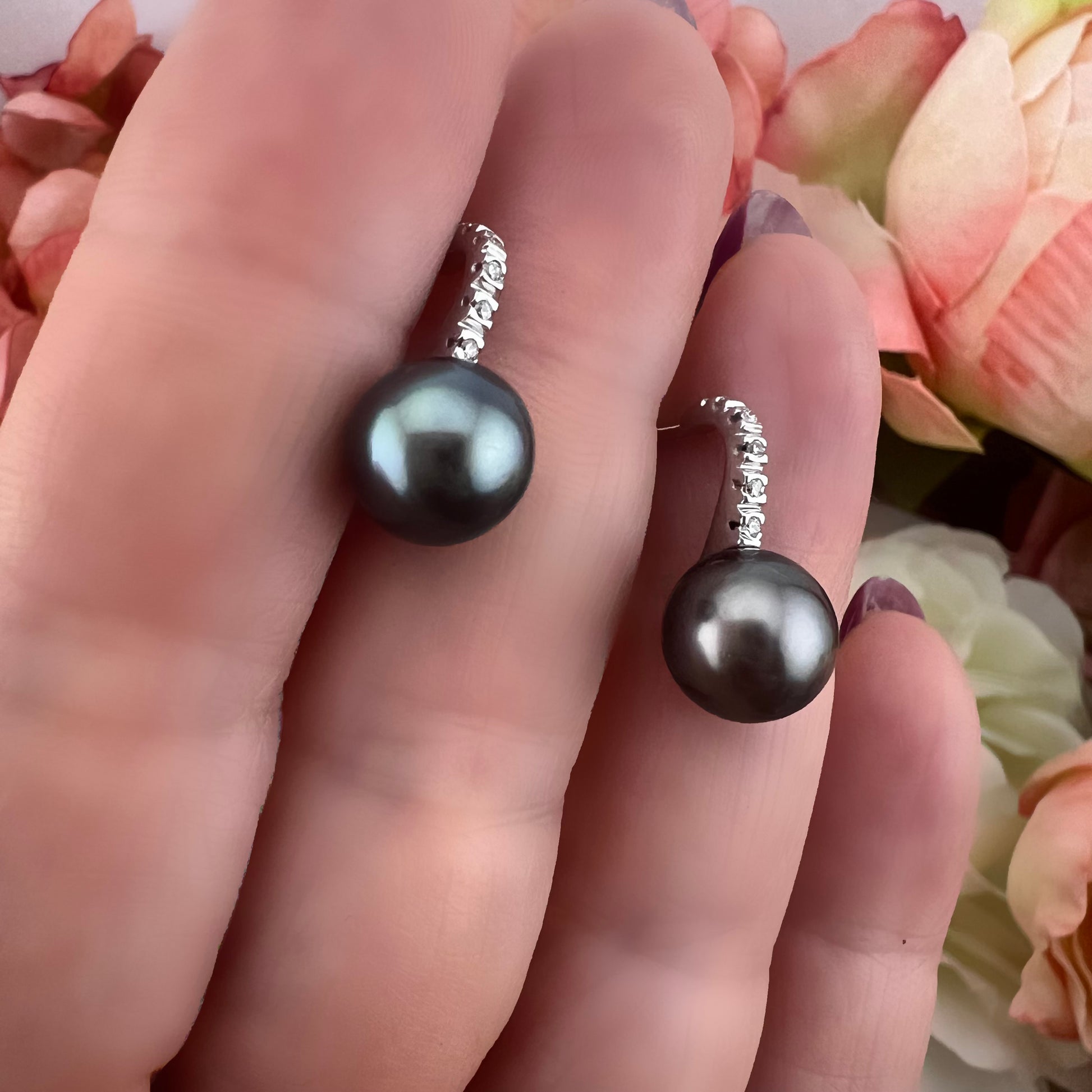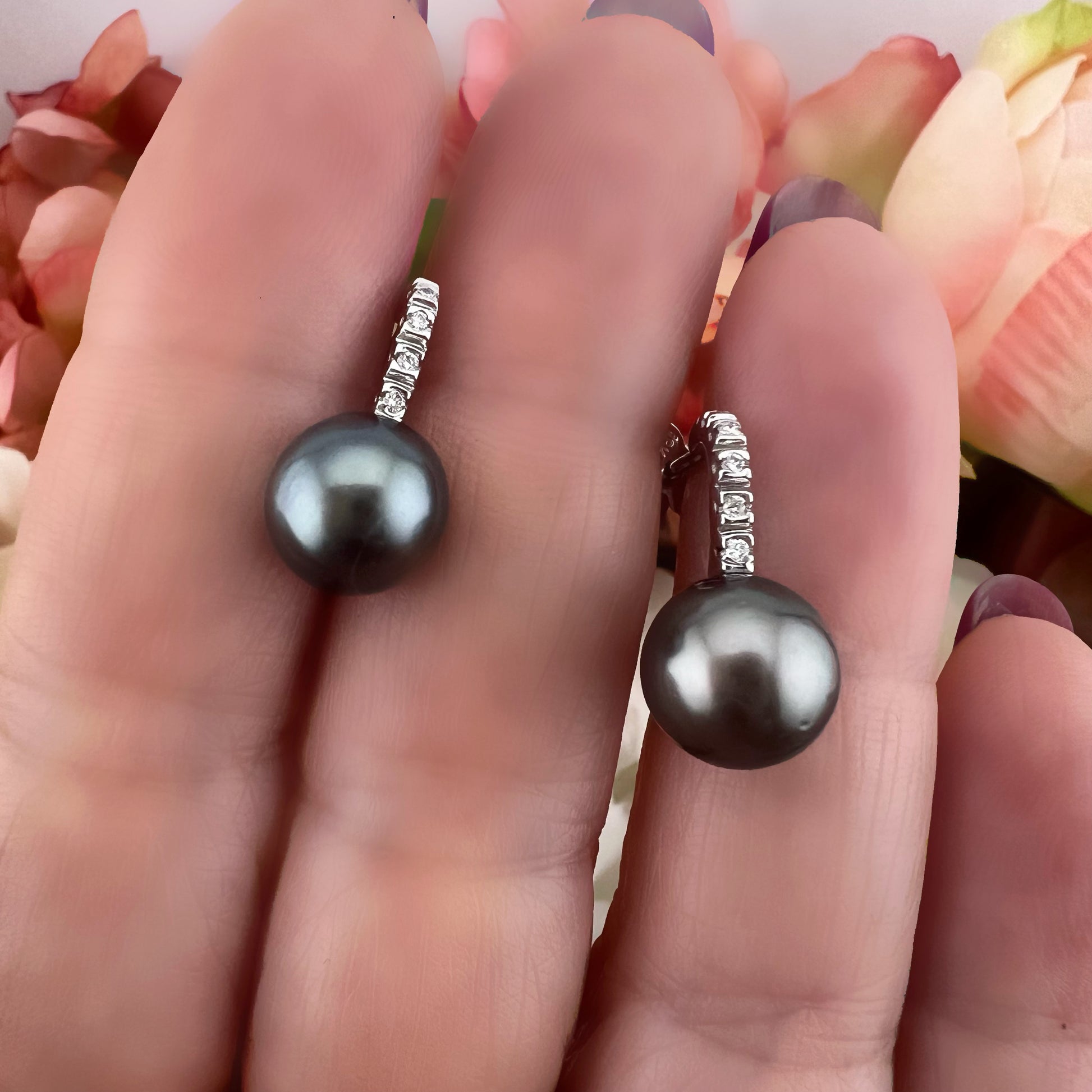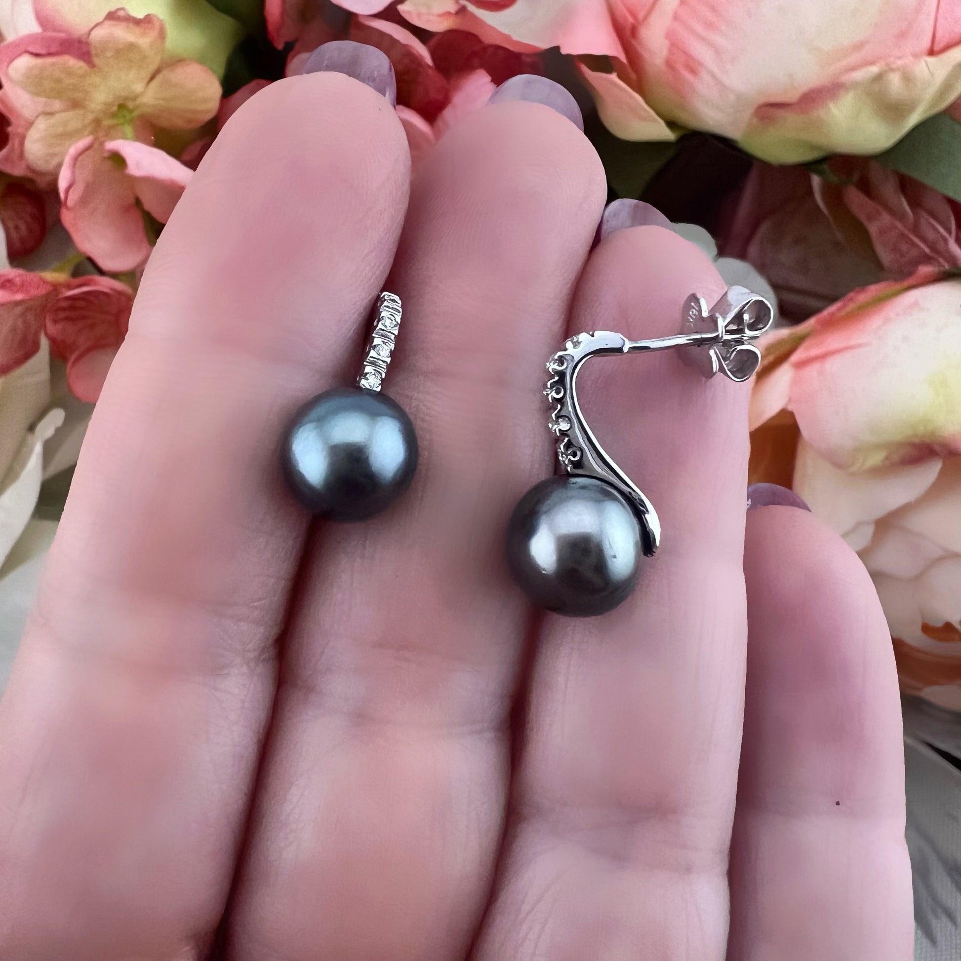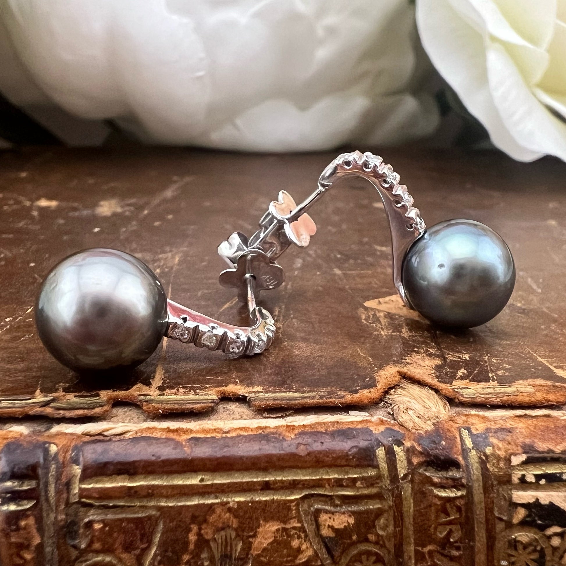 L’attacco a perno è sicuro e funzionale, con un piccolo dettaglio a forma di cuore marchiato sul retro, che conferisce un’aria di esclusività. Le perle di Tahiti, dal caratteristico colore grigio-nero iridescente, dominano la composizione, evocando l’esotismo del Mar del Sud unito alla maestria orafa italiana. Ideali per un look elegante e moderno, questi orecchini uniscono lusso intramontabile e originalità, perfetti per valorizzare il décolleté con un velo di mistero e raffinatezza. La coppia è in condizioni molto buone, con segni minimi d’uso che ne accentuano il fascino autentico.