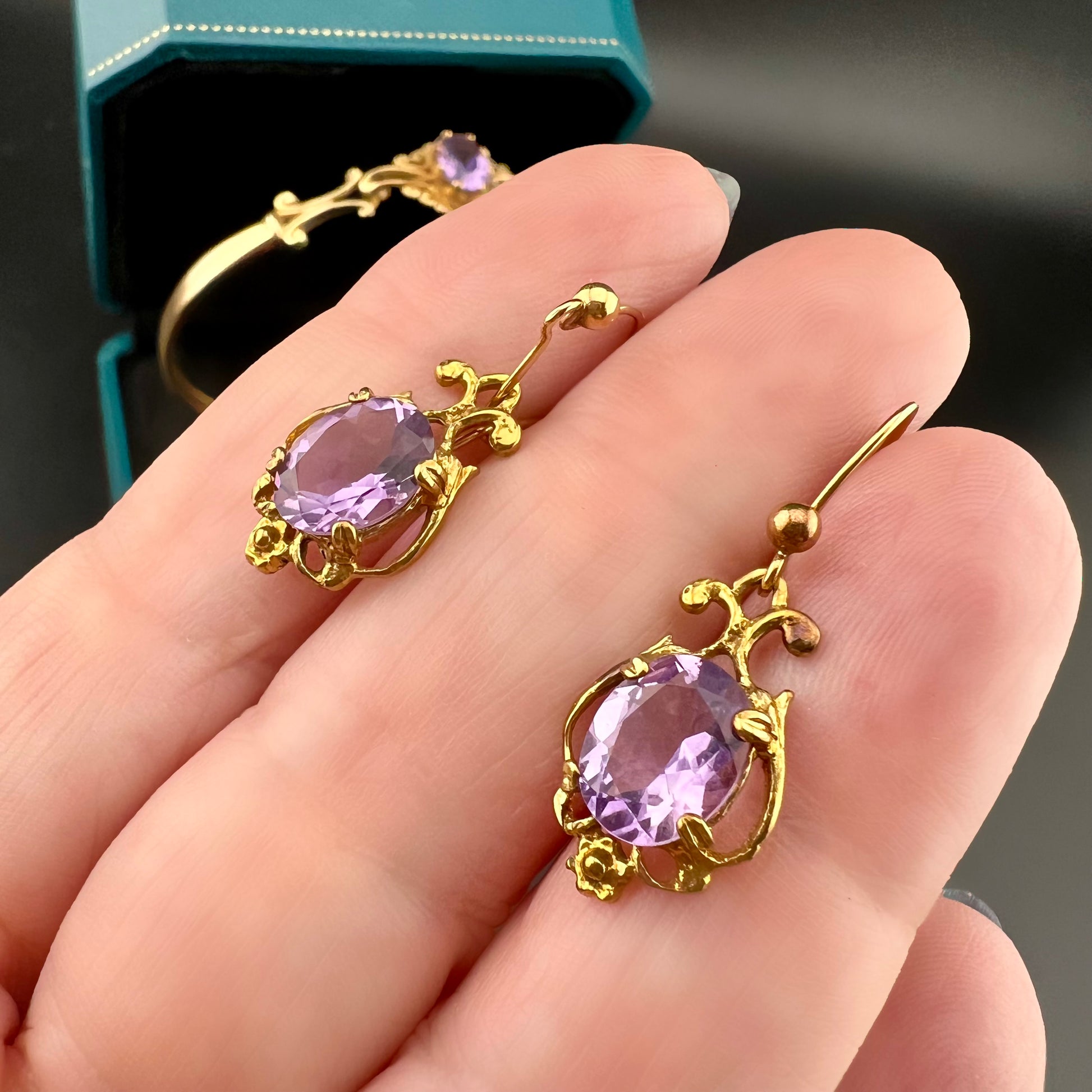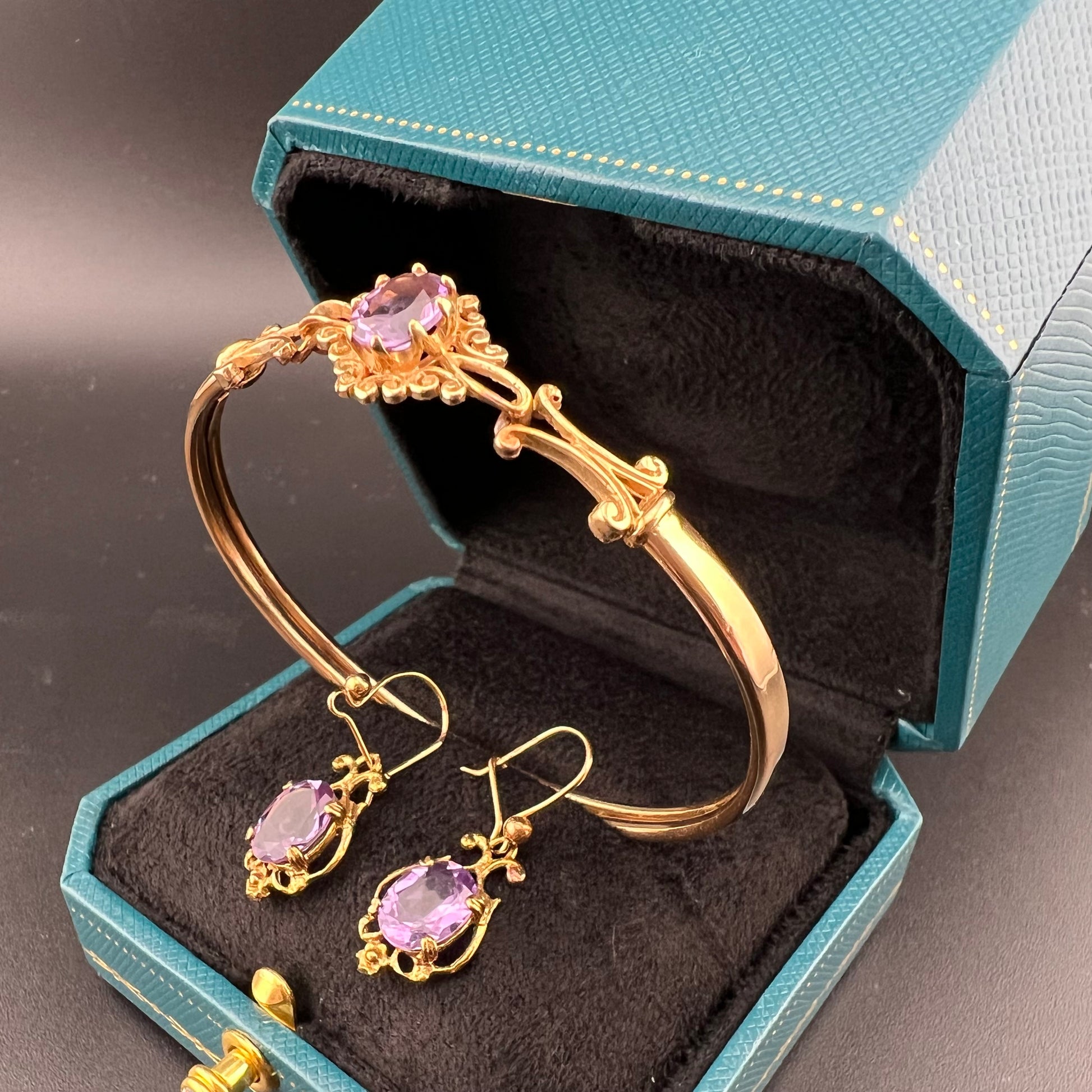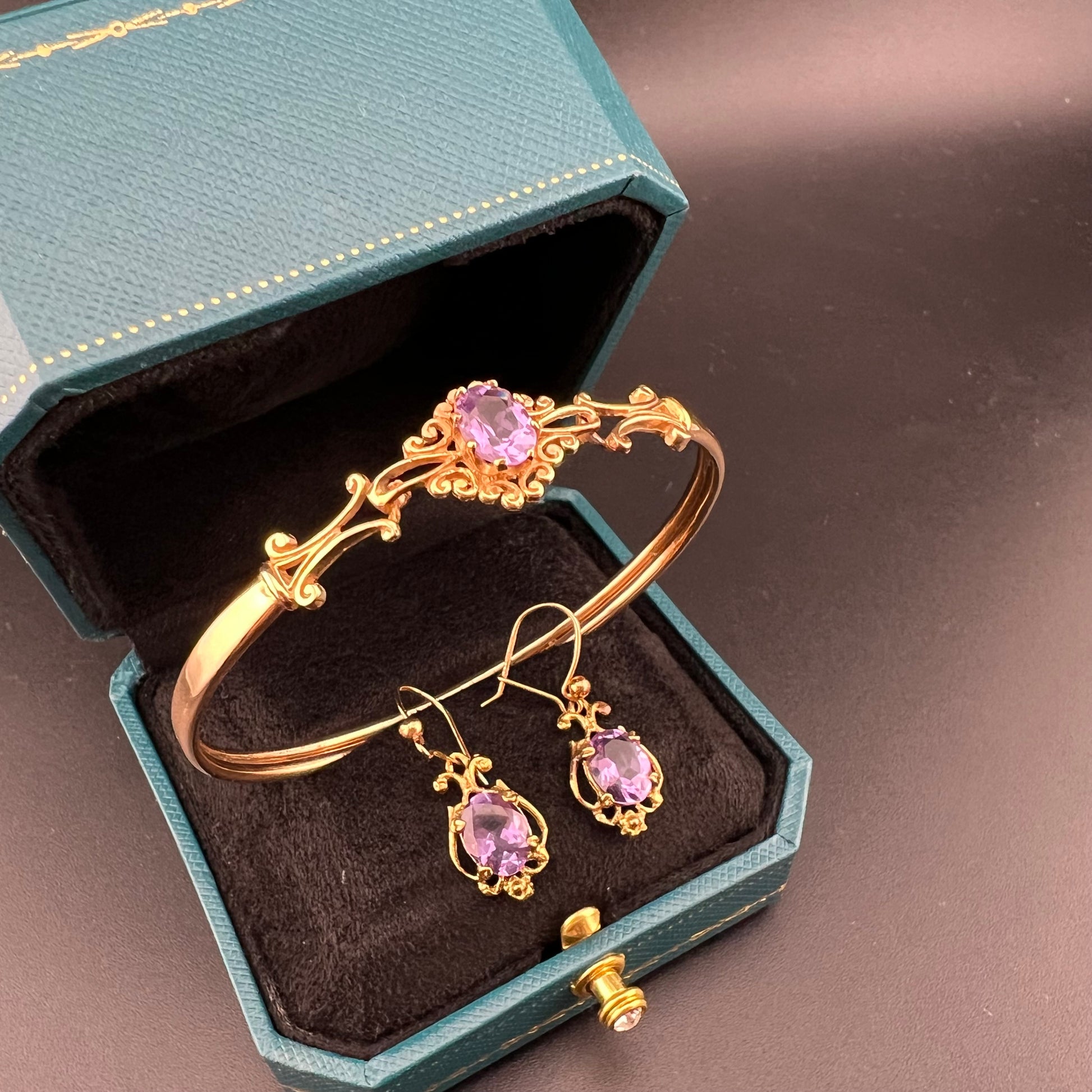 **Timeless elegance and refined beauty: this vintage English-made set features a bracelet and earrings crafted from warm 9ct yellow gold, embellished with vivid, luminous amethysts.**