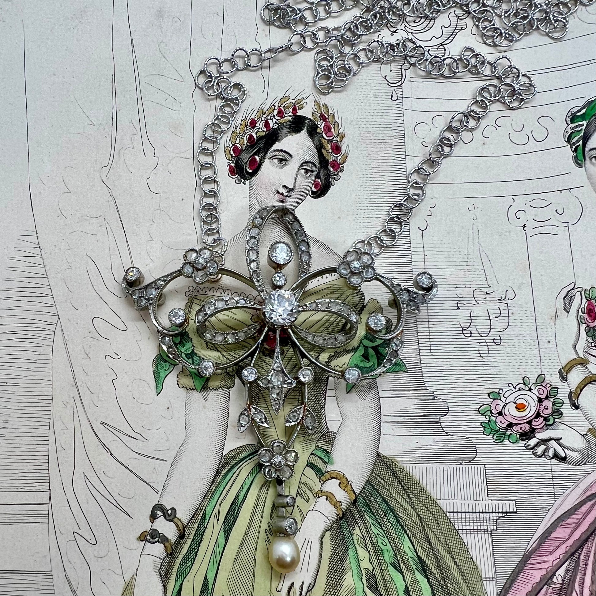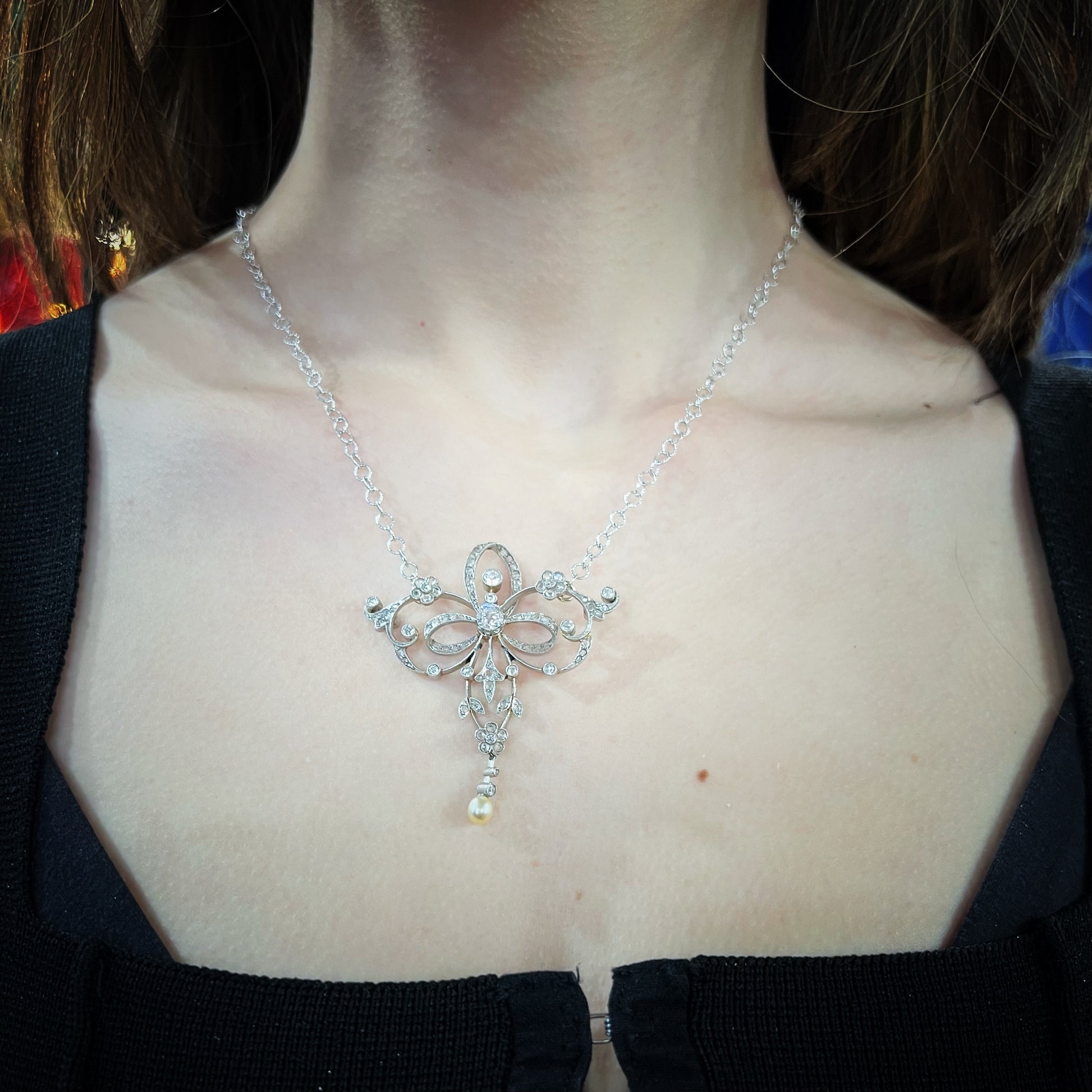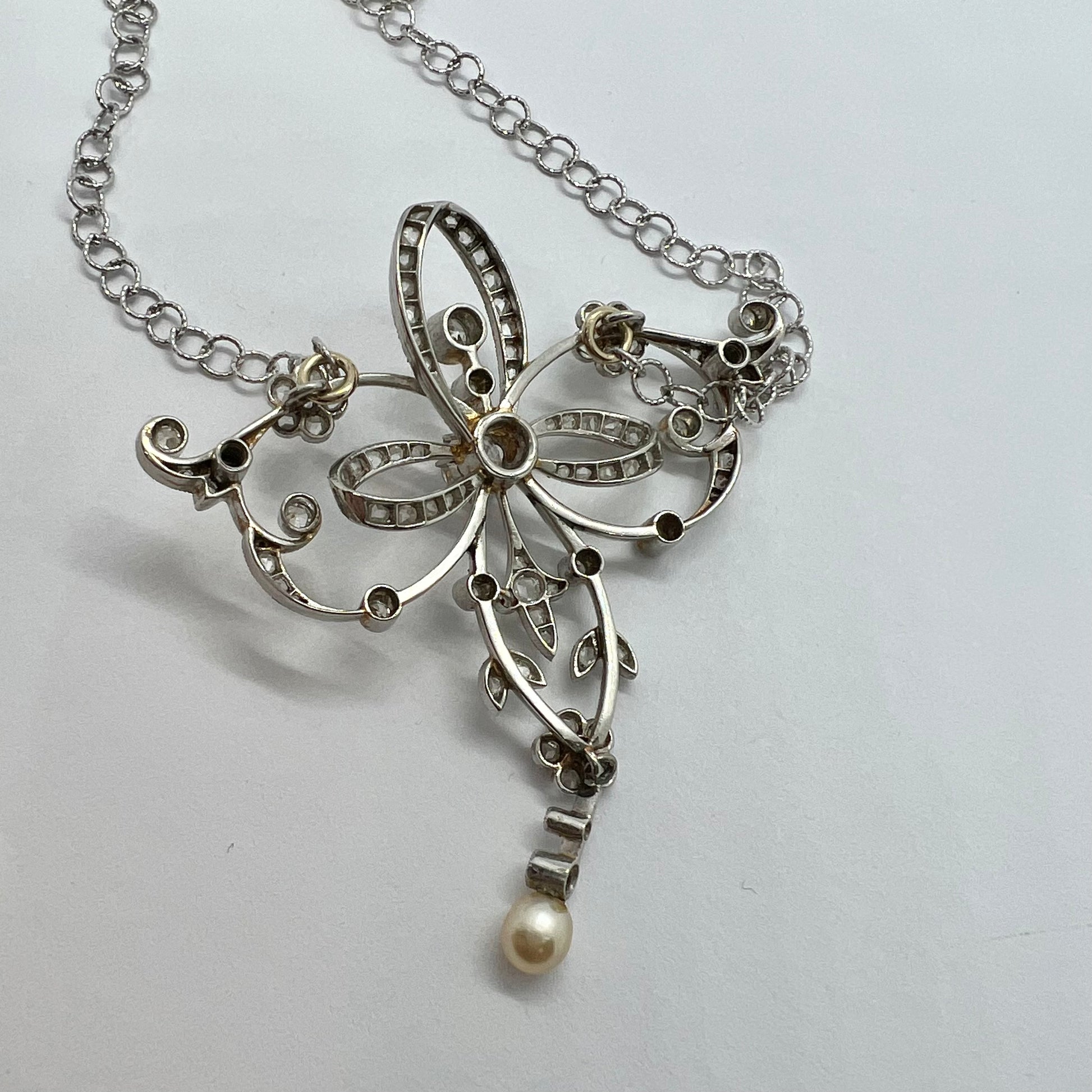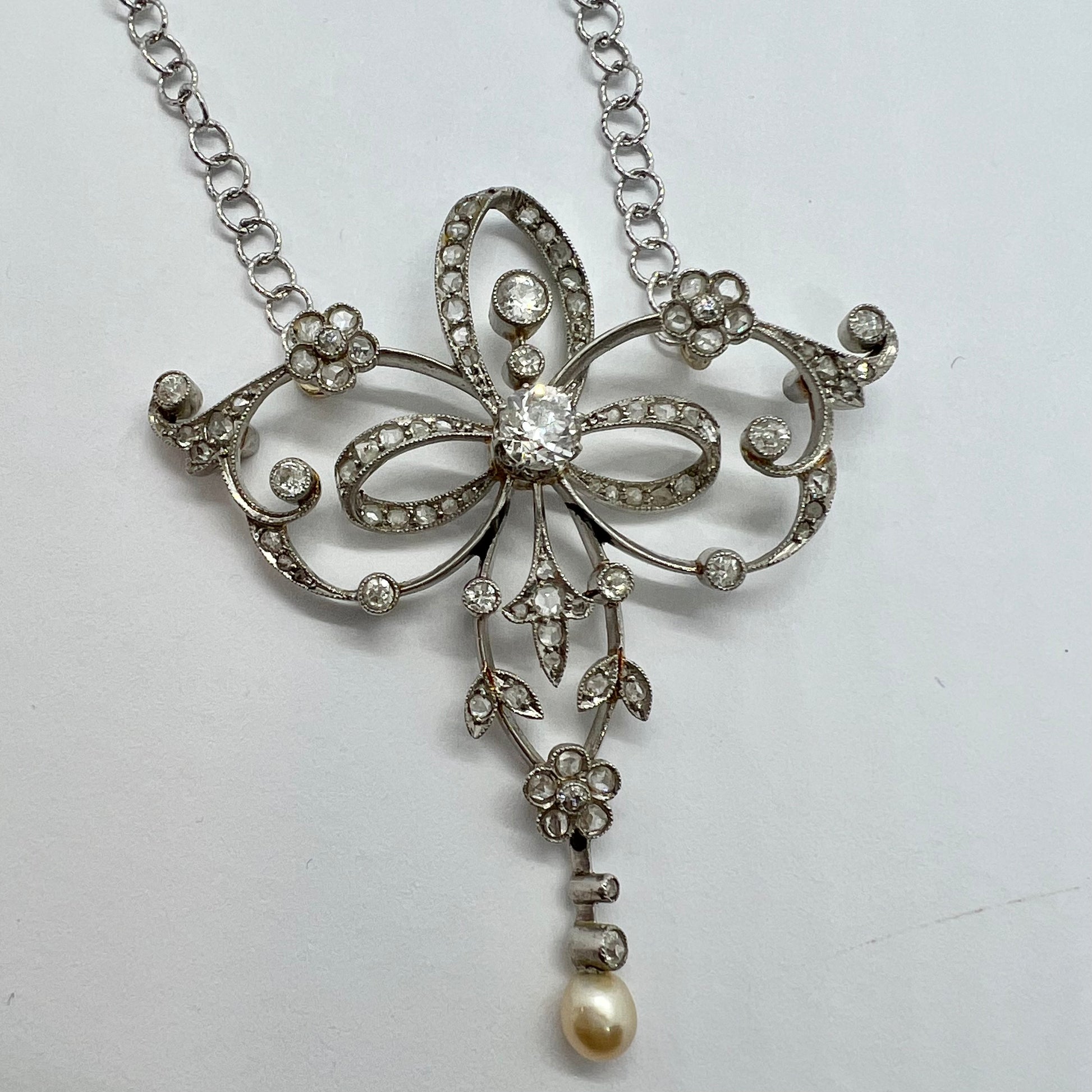 A delightful and ethereal lavalier necklace crafted in 18-karat white gold in the early 1900s. The sinuous movement that characterizes this refined jewelry period lends a surprising lightness to the piece, which in reality has a solid and robust structure. Every ribbon, every little flower, and every intersection is covered in crystal-clear diamonds. The stones are all original and natural. The small rose-crown cut stones, the medium-sized ones, and the large central one are antiqueold mine-cut diamonds. A swinging pearl completes the composition.