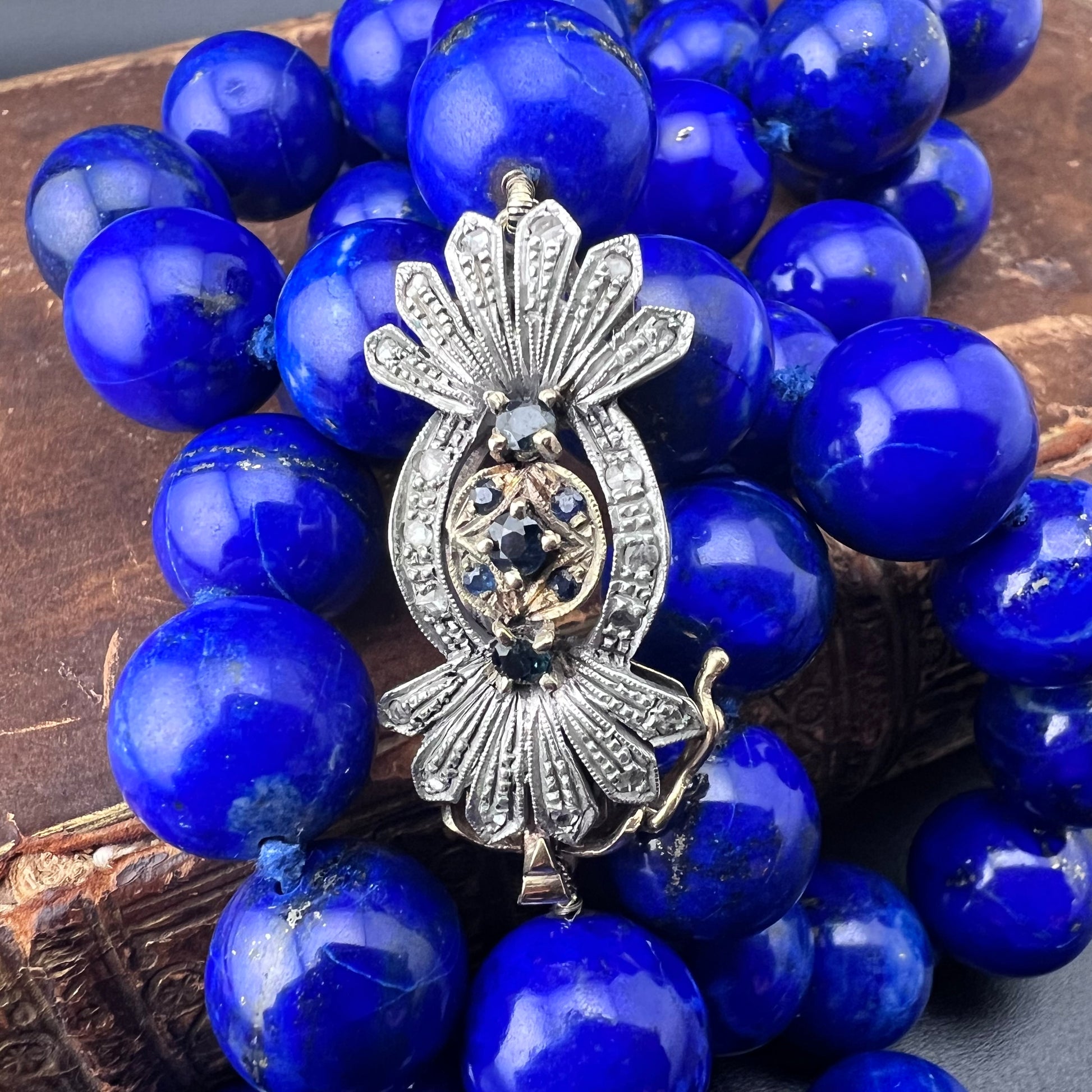 Necklace with natural lapis lazuli measuring 14 mm by 90 cm. Weight 242 grams. Clasp in gold, silver, diamonds and sapphires.