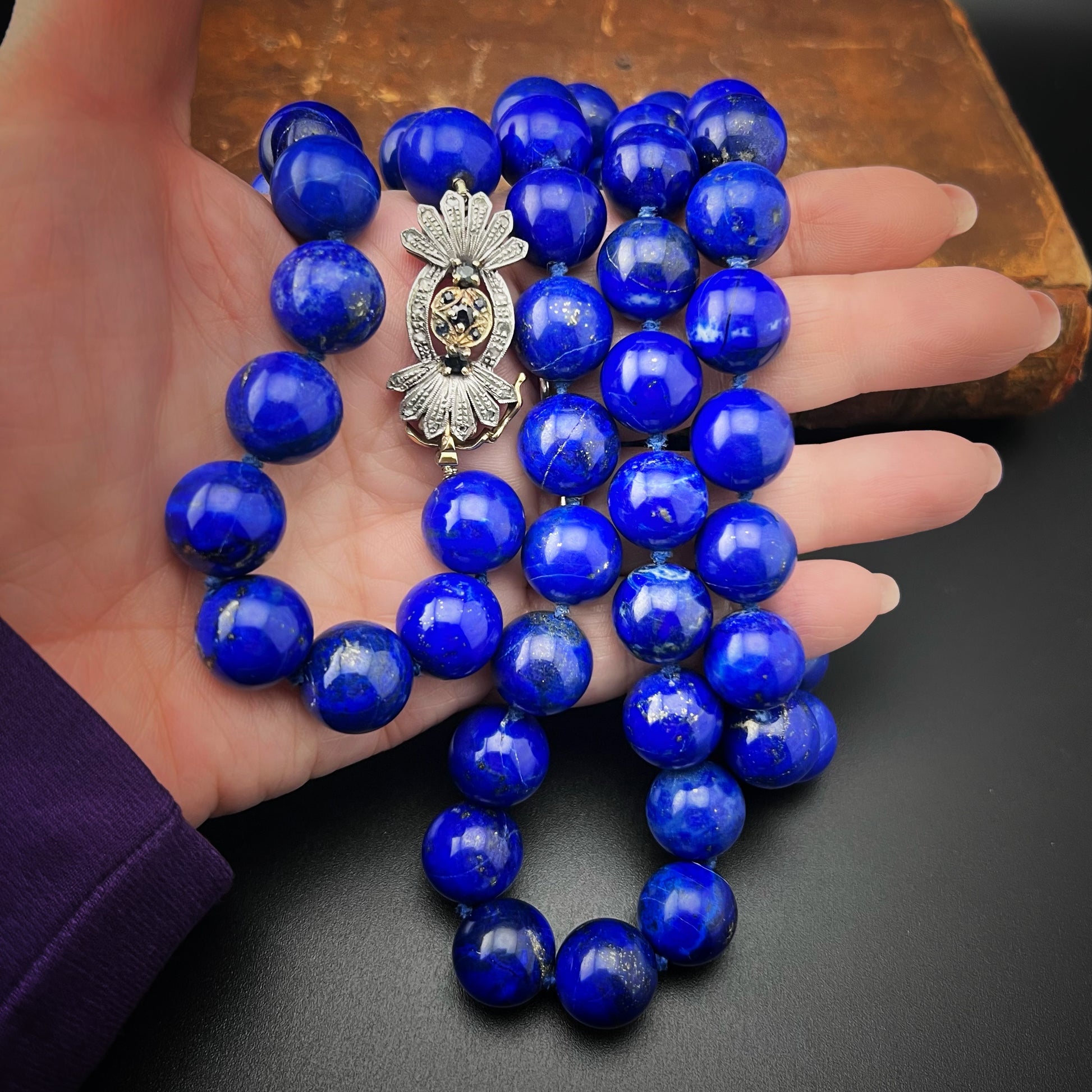 This magnificent vintage necklace stands out for its timeless beauty and high-quality materials. Crafted from 55 spheres of intense, uniform blue Afghan lapis lazuli, each stone is enriched with natural calcite streaks and delicate golden pyrite inclusions, evoking a starry sky.