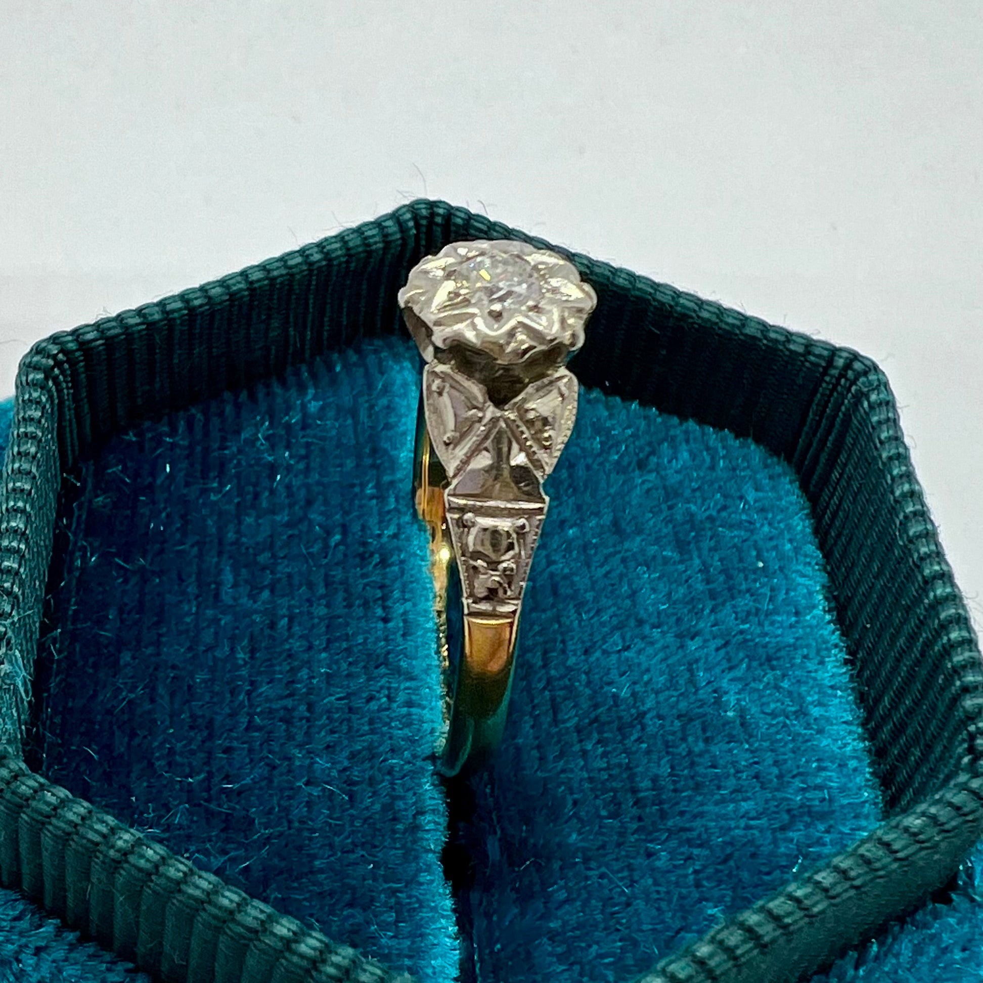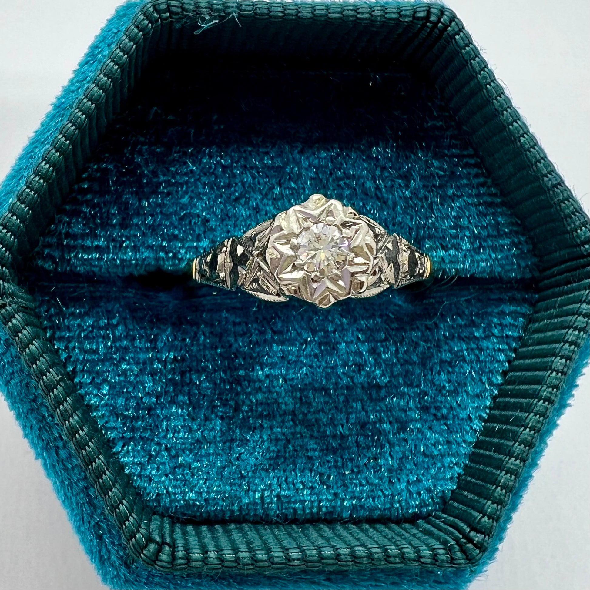 Elegant and rare solitaire from the early 1900s with 18k yellow gold shank and wonderful hand-engraved platinum shoulders. The star that holds the old-cut diamond in an illusion setting is also in platinum. The clear and bright diamond is estimated at 0.10 carats.