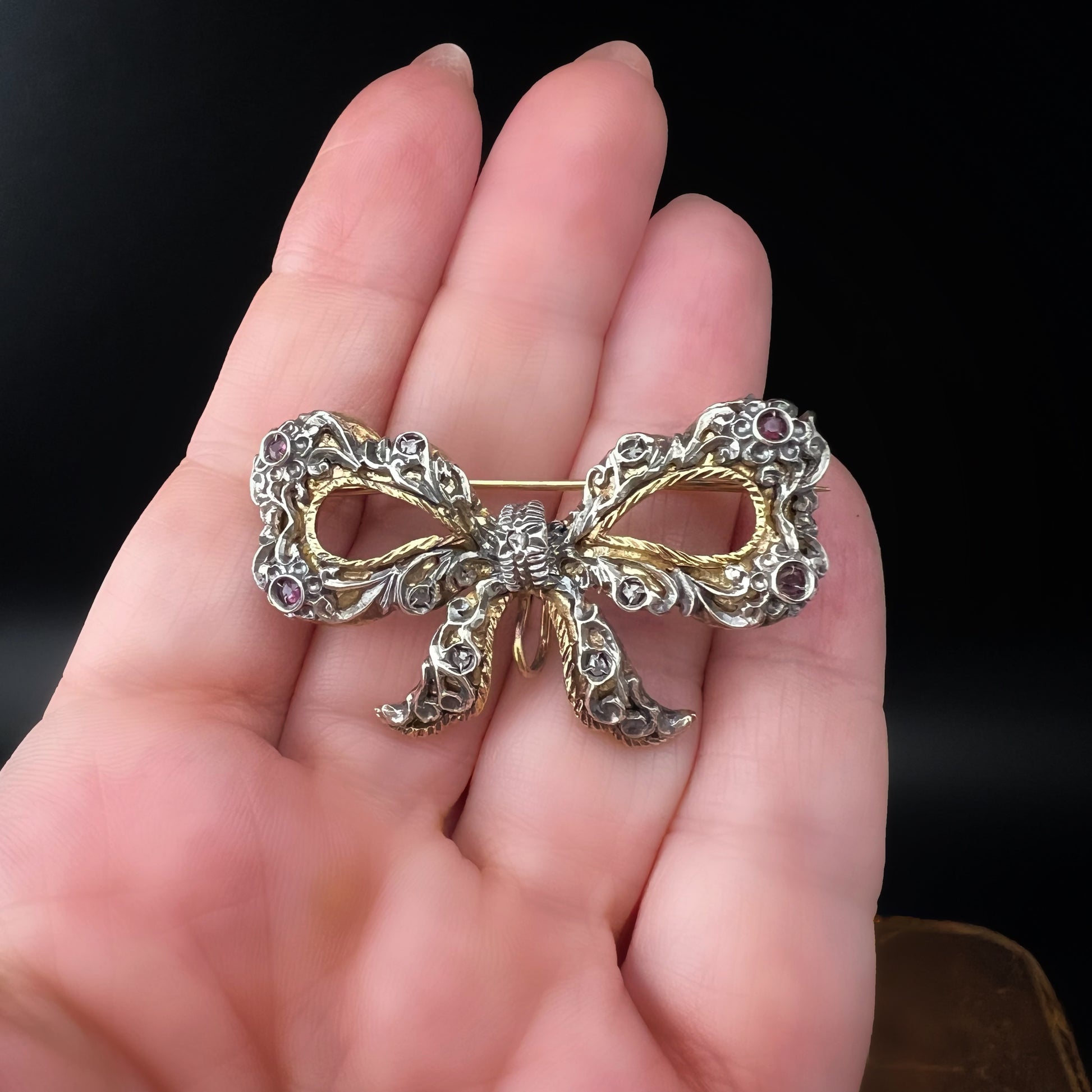 This antique bow brooch is a true masterpiece of elegance and refinement, a symbol of love and timeless beauty. Crafted with meticulous attention to detail, the ribbon seems to flow like soft fabric, reminiscent of the delicacy of vintage lace. The four carefully set round-cut rubies form enchanting flowers adorned with diamond rosettes that sparkle like morning dewdrops. Every element of this brooch evokes a romantic allure reminiscent of times gone by, yet still incredibly timely.