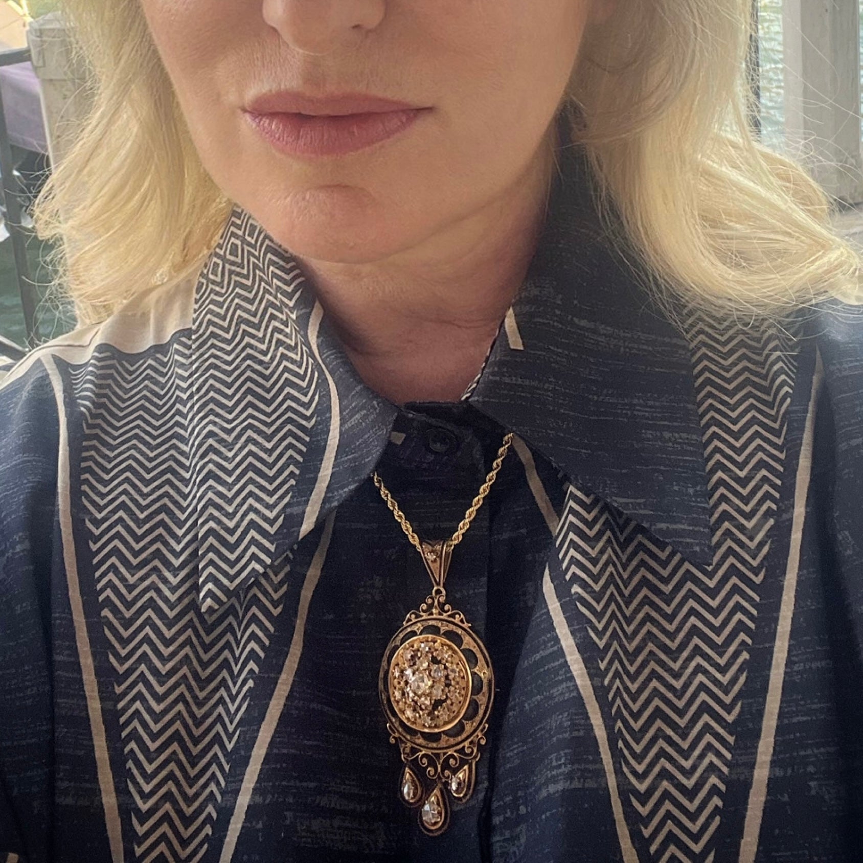 It is incredible how after about 150 years a sentimental jewel full of history and meaning is wearable and amplifies its charm. Among the "sentimental" jewels, in fact, the mourning jewel had great success. From 1861 Queen Victoria marked the beginning of this new custom. Not all creations are so bright and elaborate, this pendant will certainly have belonged to a very demanding and elegant lady. Made of 14k yellow gold, enamel and diamonds.