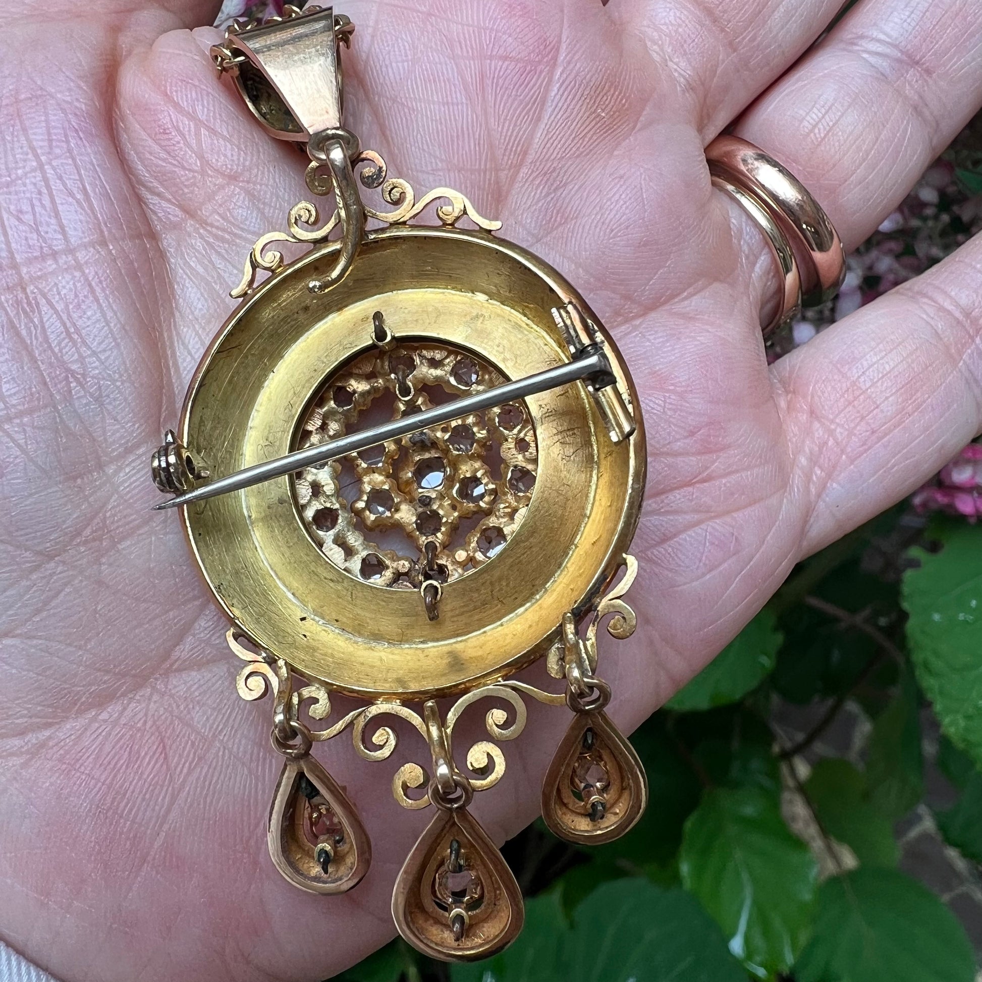 🖤 ​​Victorian era brooch/pendant of the highest quality and astonishing beauty. All rose crown cut diamonds are of equal transparency, purity and brilliance. They form a rosette enhanced by a contrasting black enamel border and three large drops hang freely, also surrounded by the same enamels.