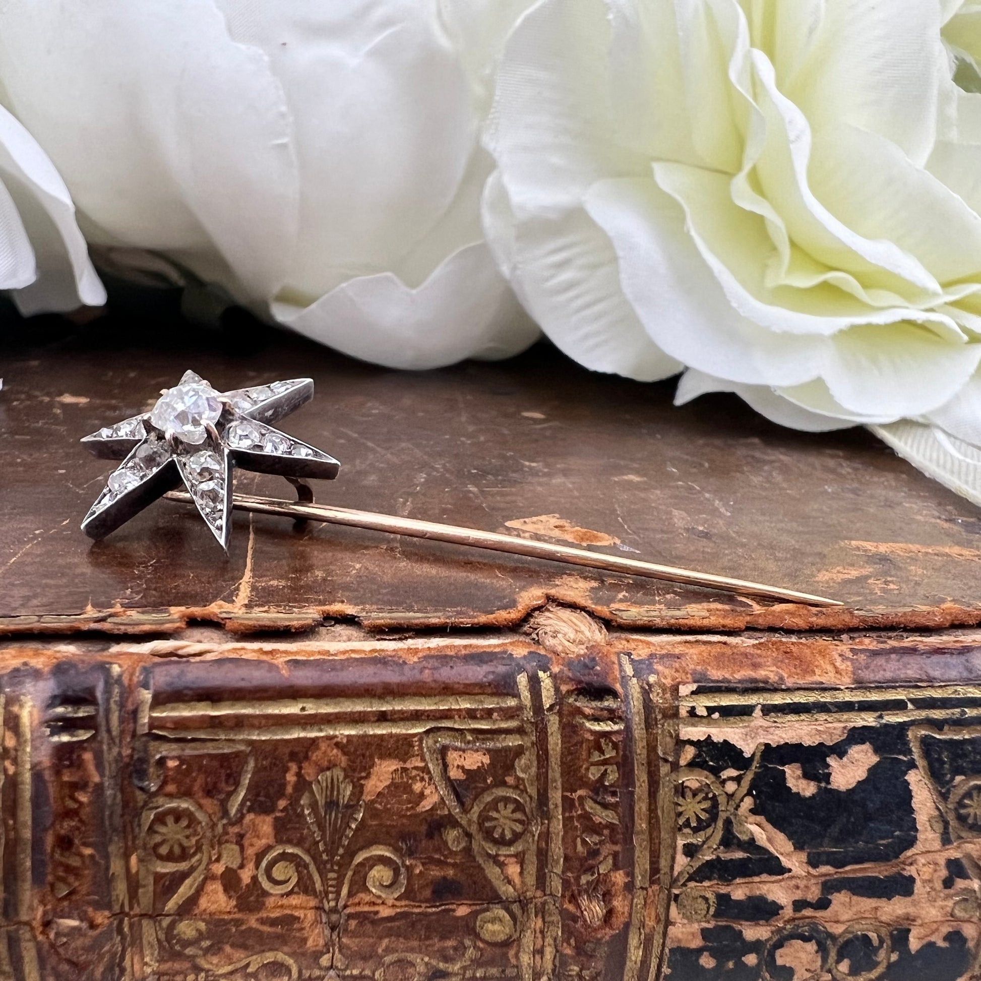 Raffinato spillone antico dei primi anni del ’900, impreziosito da una stella a sei punte interamente ornata di diamanti, simbolo di luce, guida e buon auspicio. Il gioiello colpisce per l’equilibrio tra eleganza decorativa e sobrietà formale, tipica della gioielleria europea antica.
