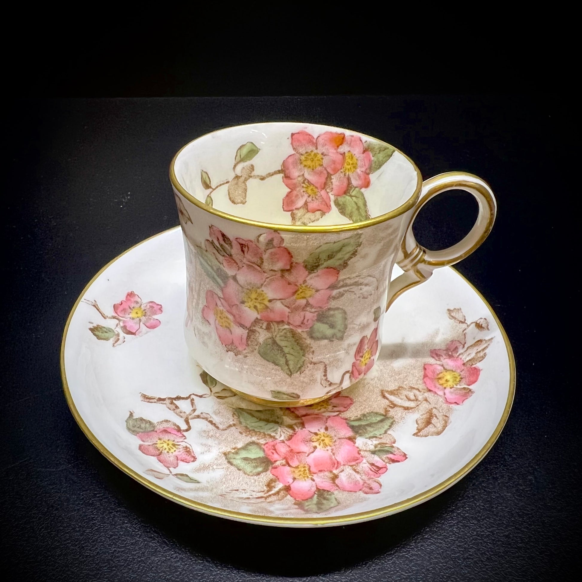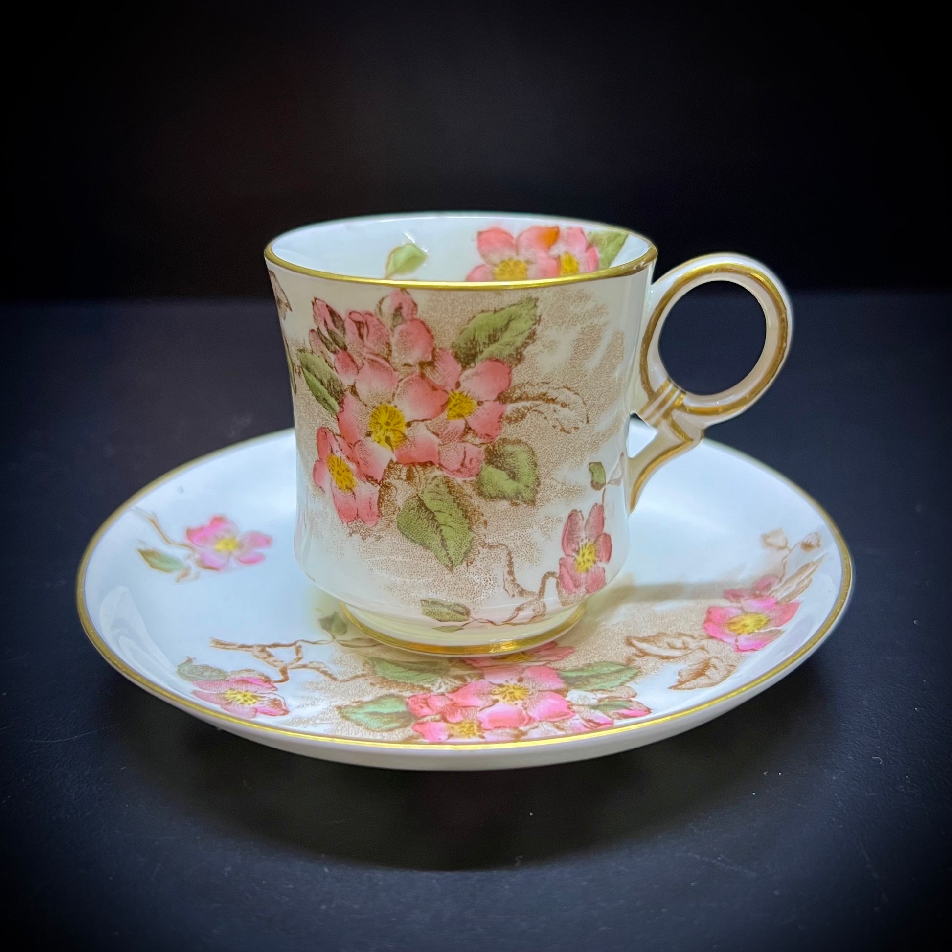 Porcelain coffee jewel decorated with harmonious flowering peach branches that also expand onto the saucer. Lucky the guest who will be able to enjoy coffee in this gem! Made in England in the early 1900s.