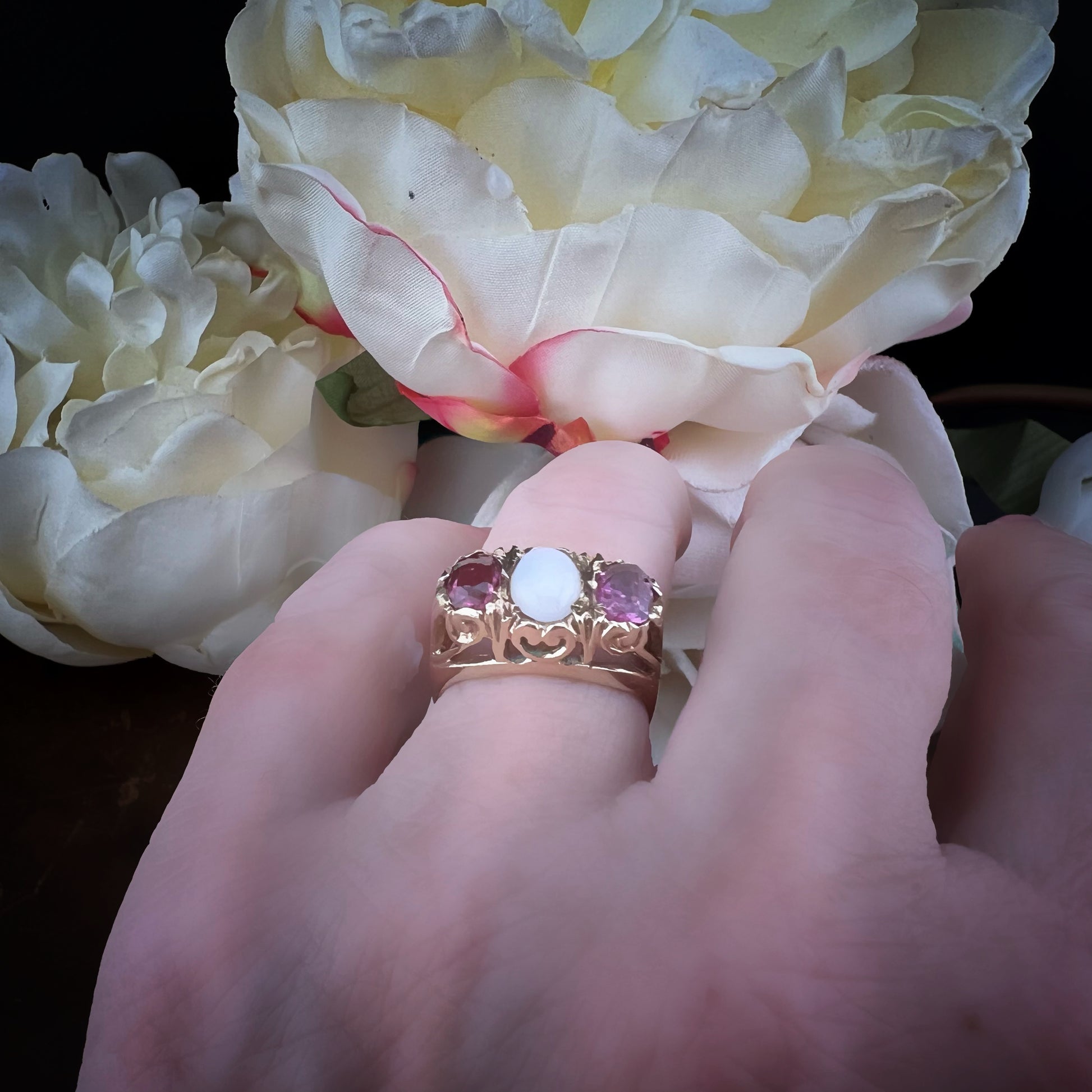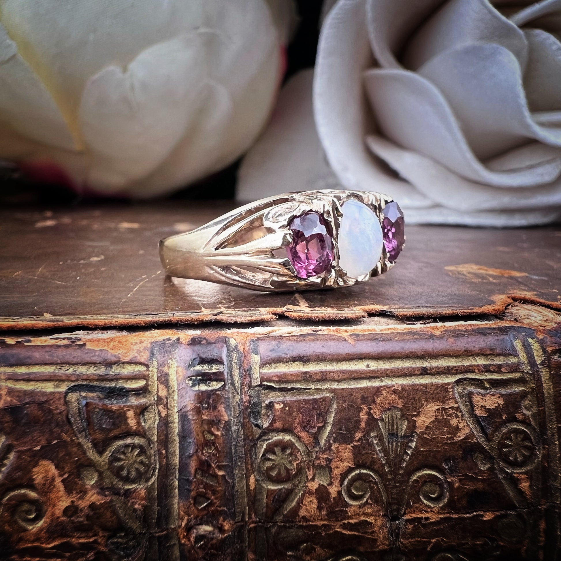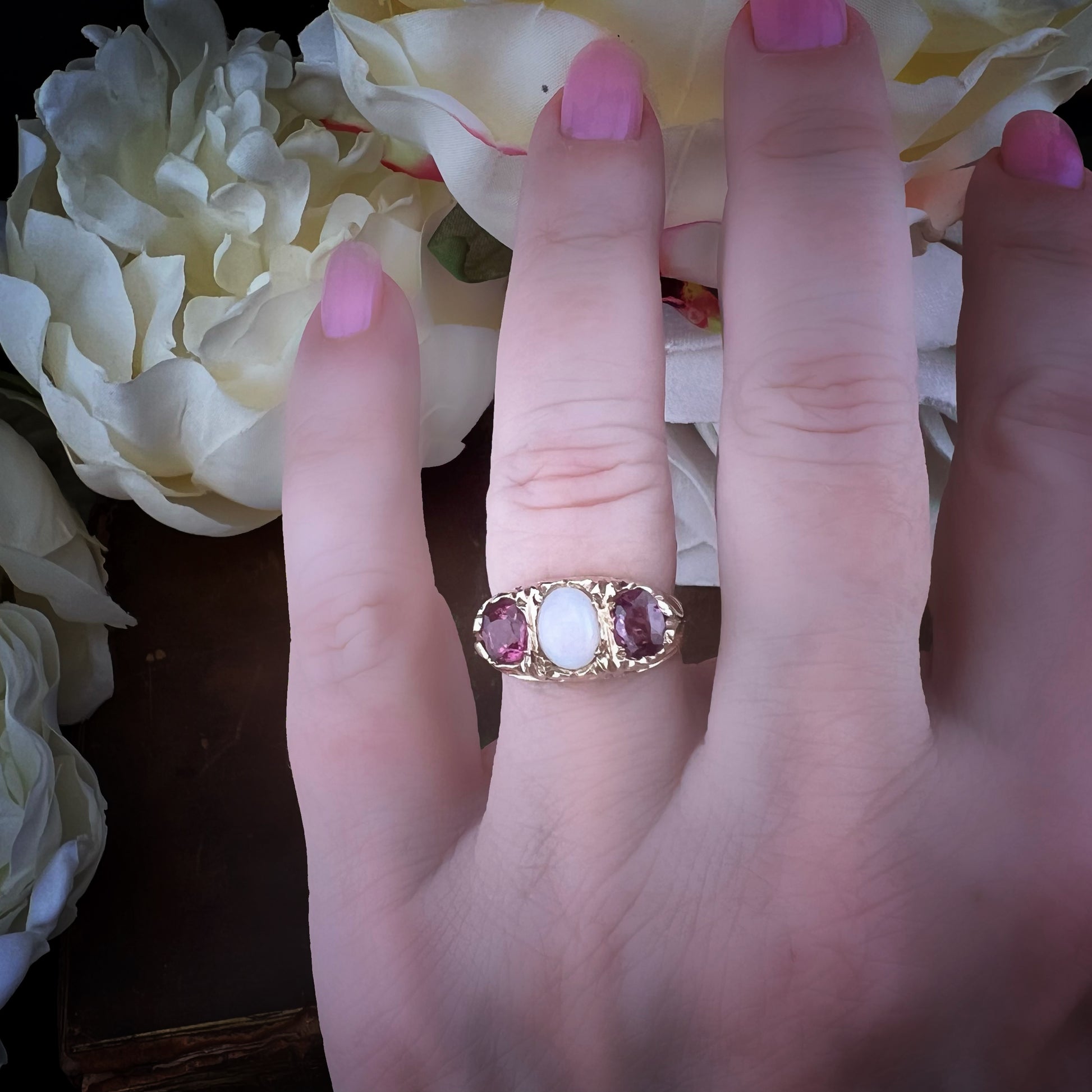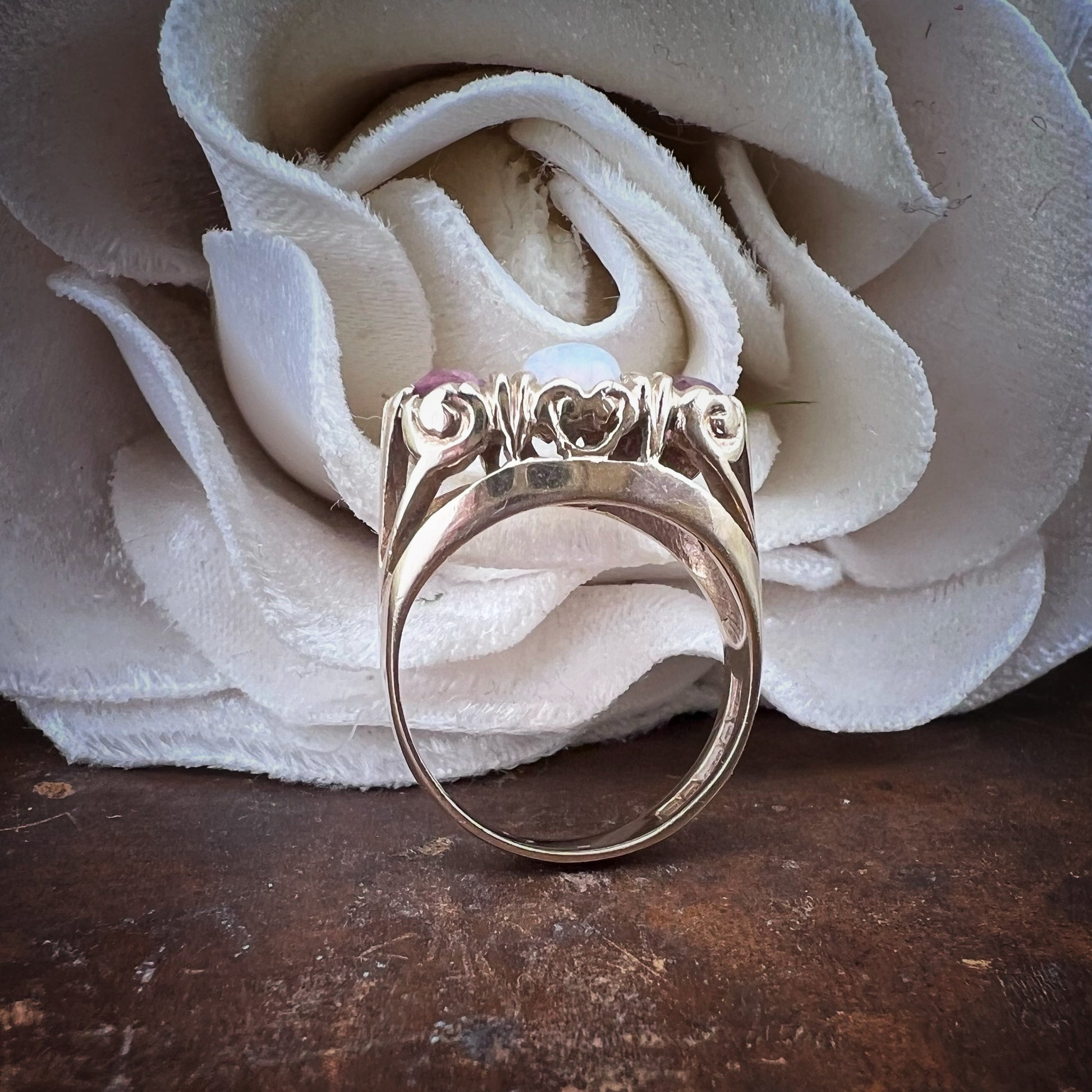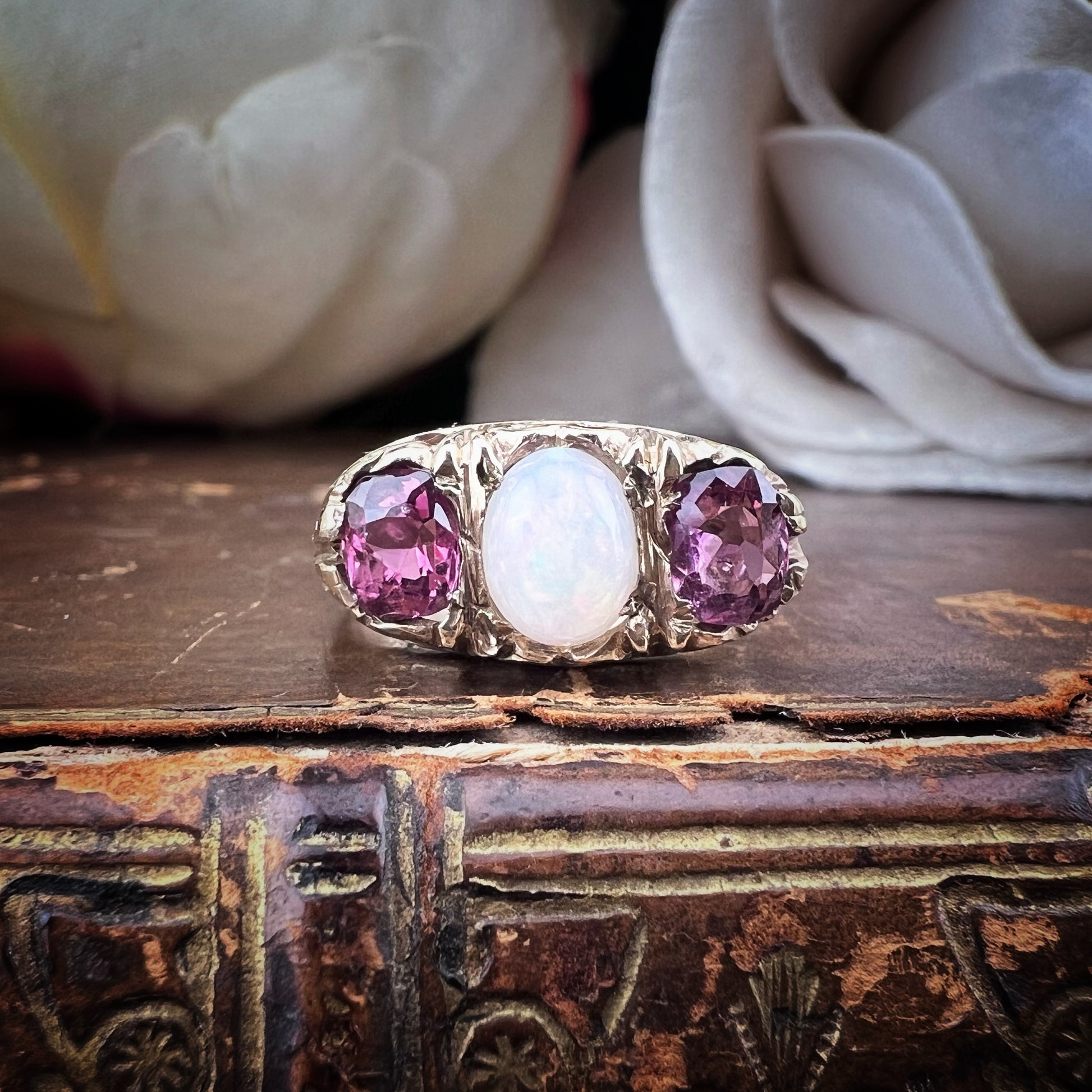 At the center, a cabochon opal with iridescent shimmers dominates, a gem that captures the light and reflects it back like a reflection of the soul. On either side, two oval-cut amethysts, in a delicate lilac hue, complete the composition with elegance and symmetry. This play of colors creates a perfect balance between dreaminess and rationality, spirituality and protection.
