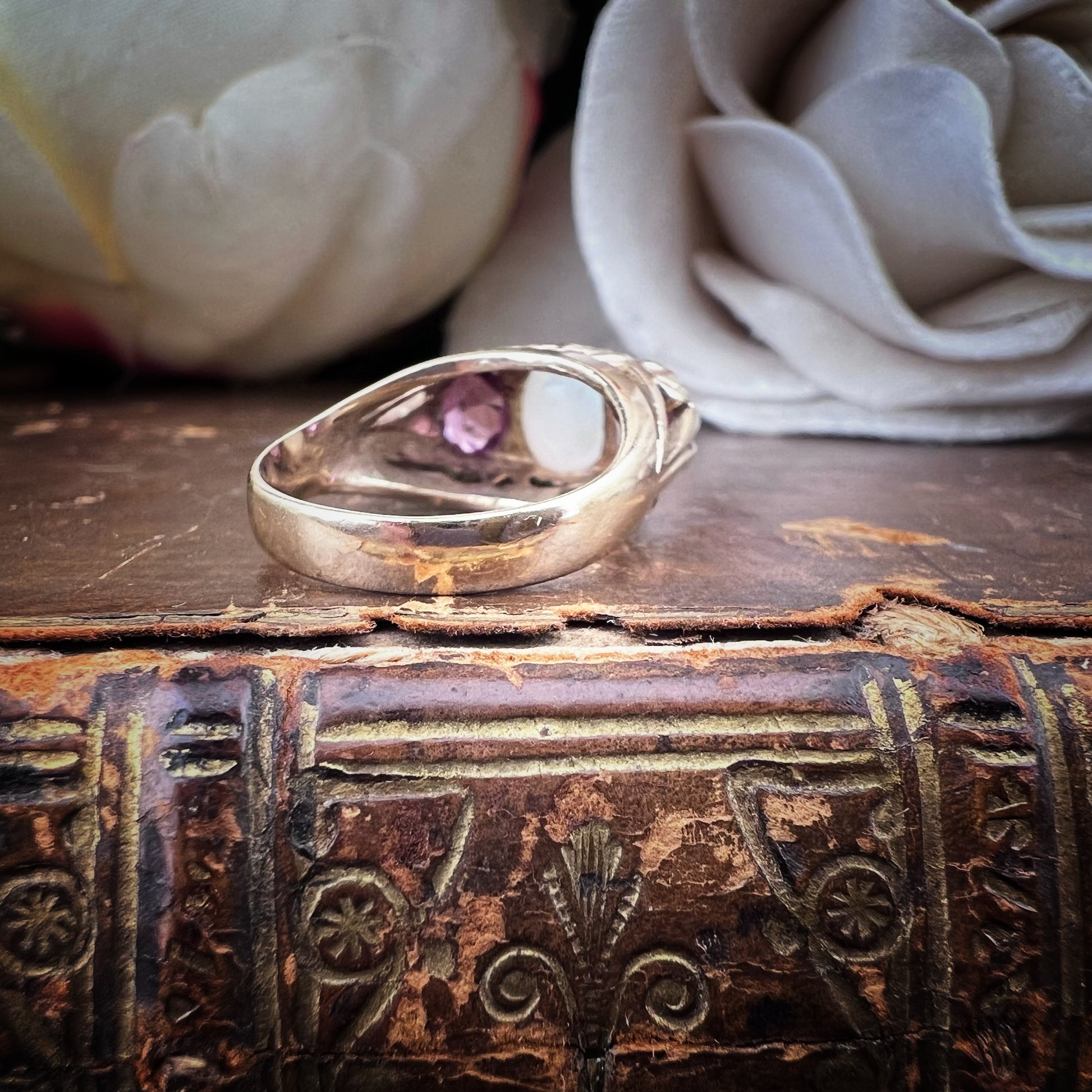 Perfect for a special occasion, this ring is much more than just a piece of jewelry: it's a symbol of love, spirituality, and transformation. Opal is known as the stone of creativity, hope, and intuition: it carries a mystical vibration that stimulates the imagination and protects against negative energies. Amethysts, on the other hand, are associated with wisdom, serenity, and emotional balance—ideal for those who desire harmony and awareness in their lives.