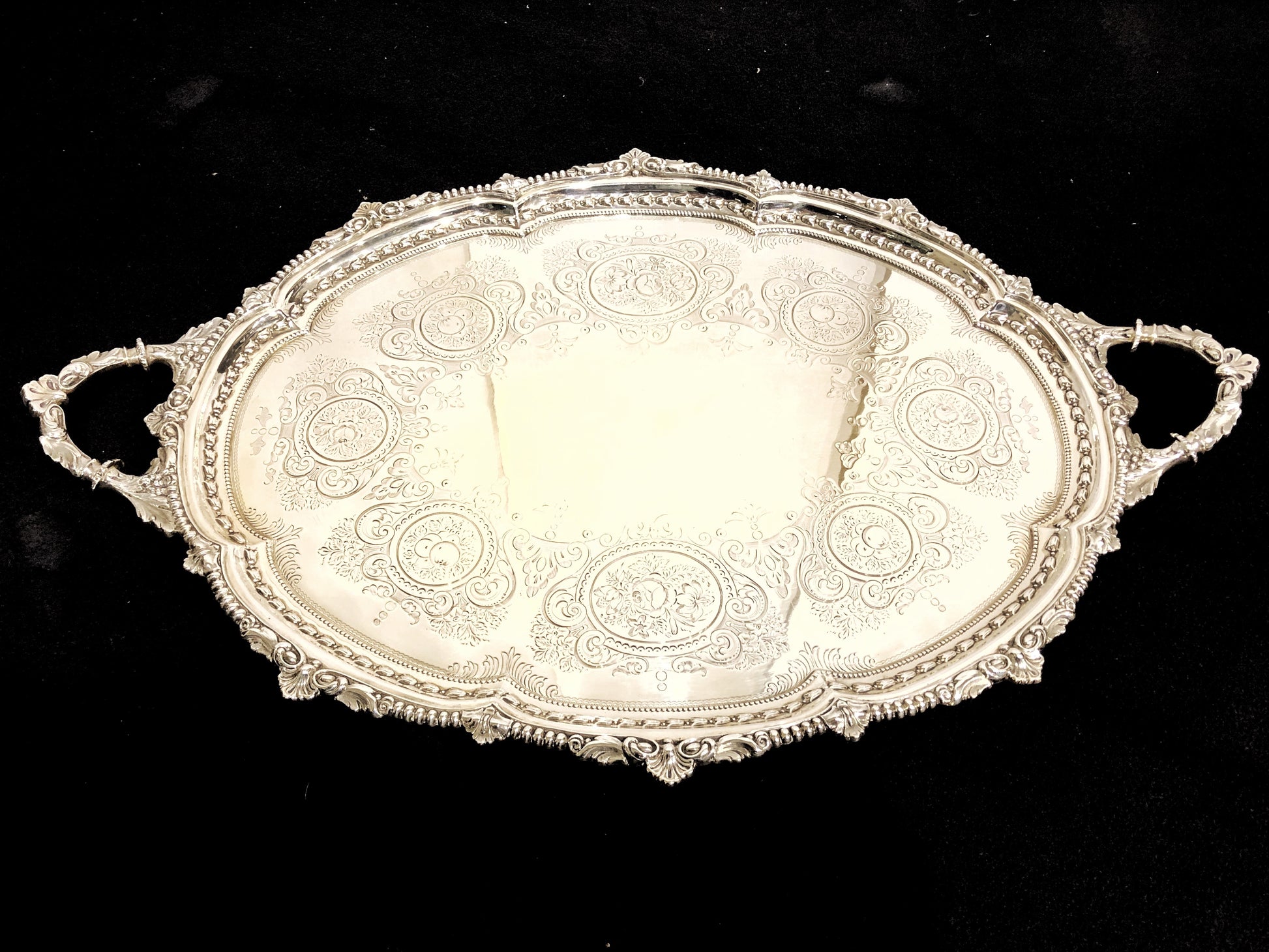 English chased silver tray, made by Frederik Elkington in London in 1884