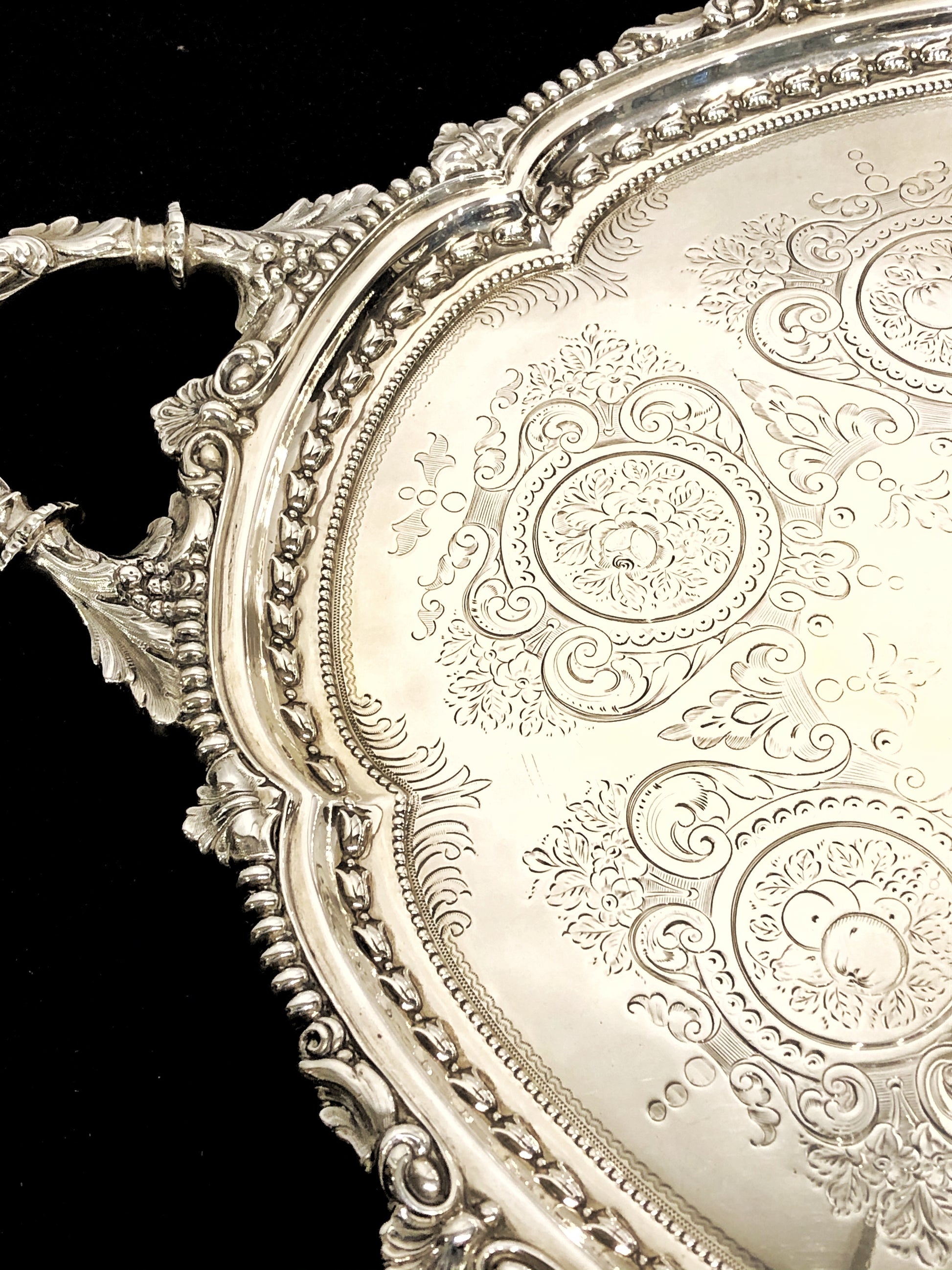 Large English silver tray with a top finely engraved with a burin chisel with Victorian themes of fruit, flowers and vegetation.
