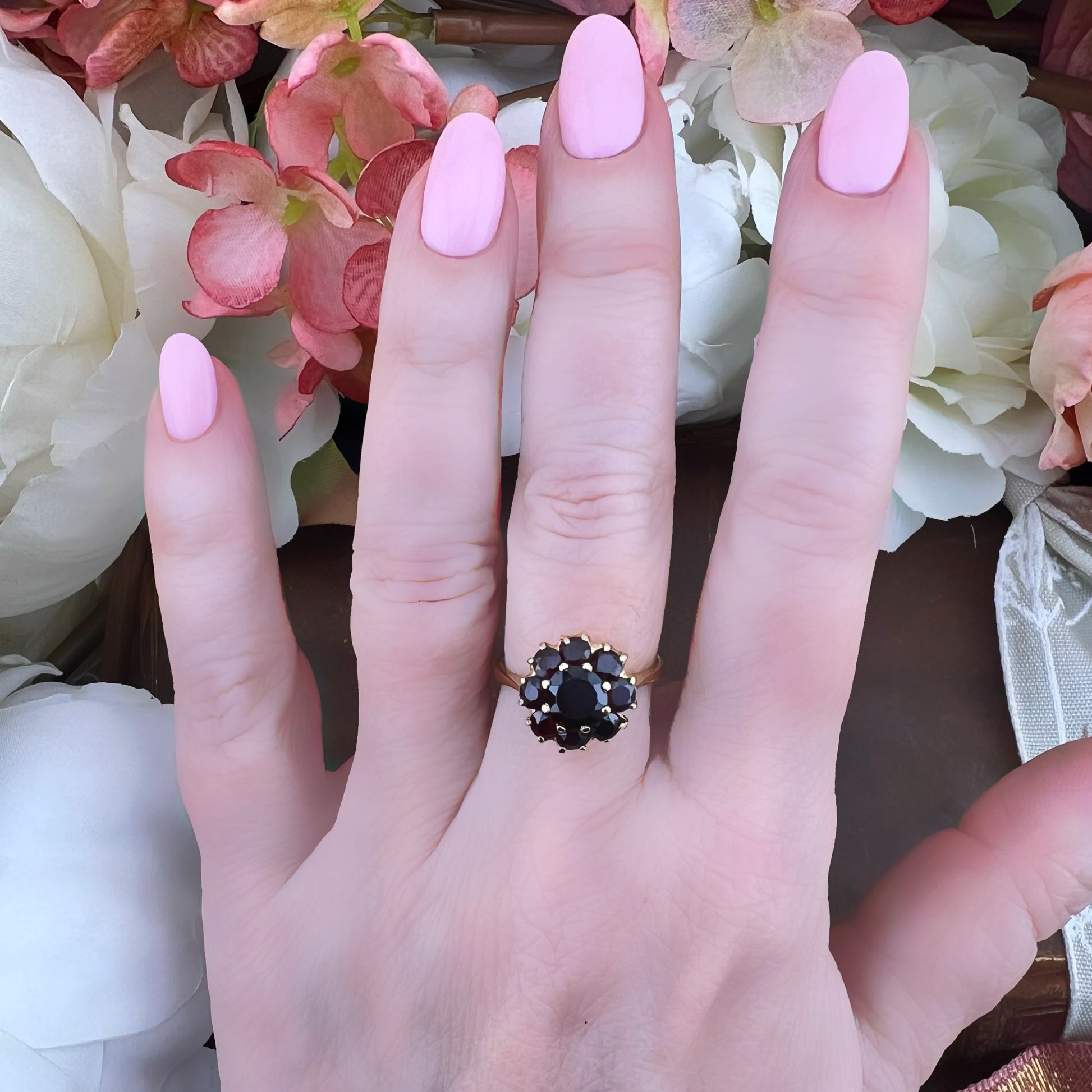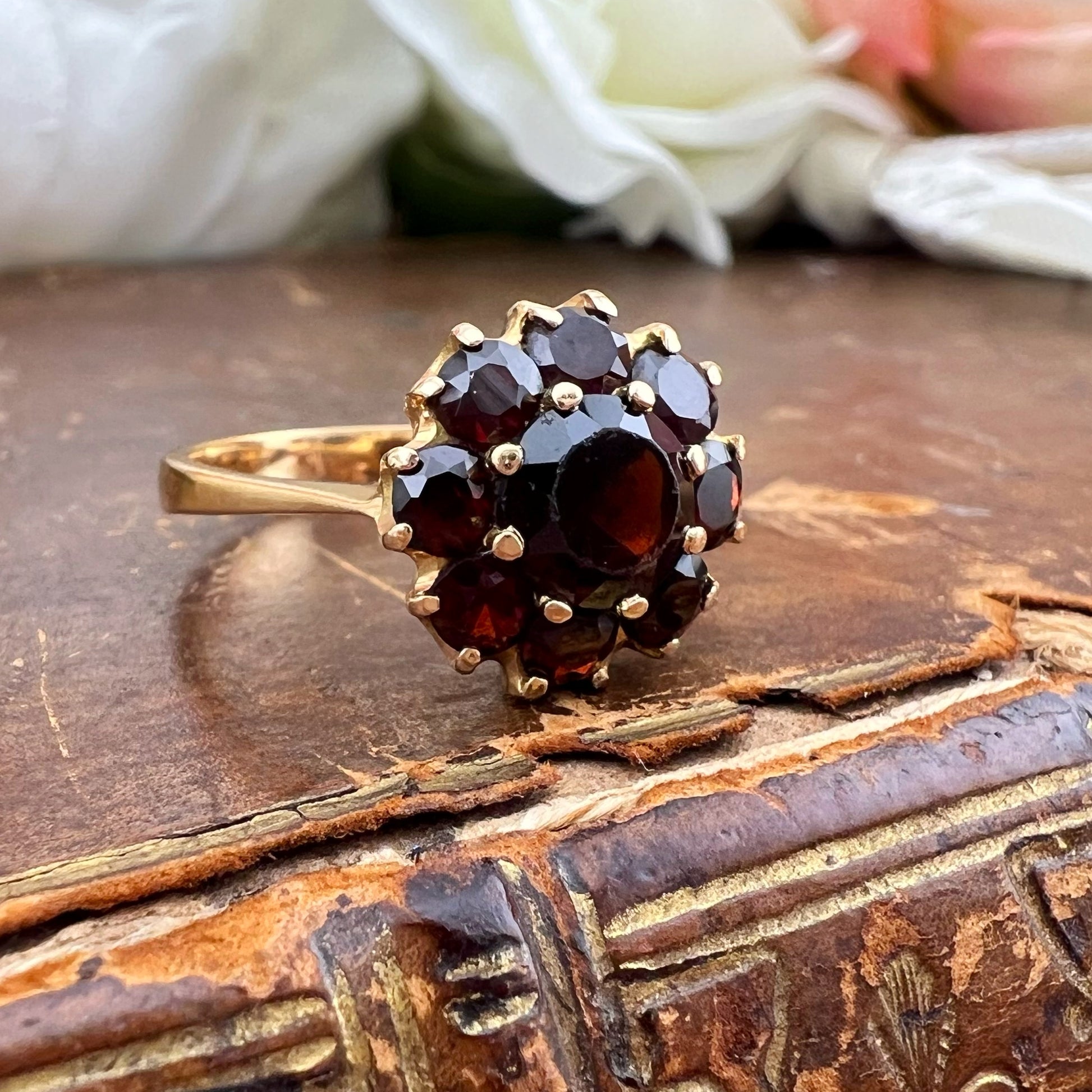 Anello margherita Vintage Inglese in Oro 18k con Granati