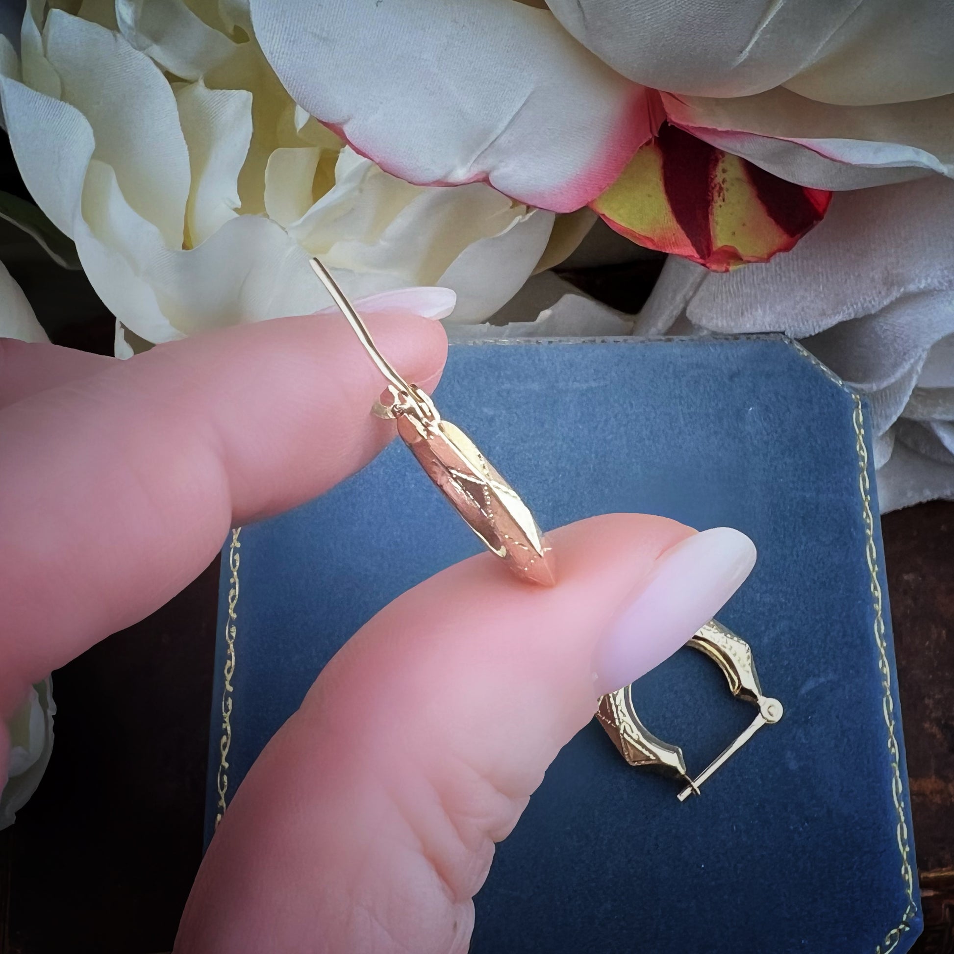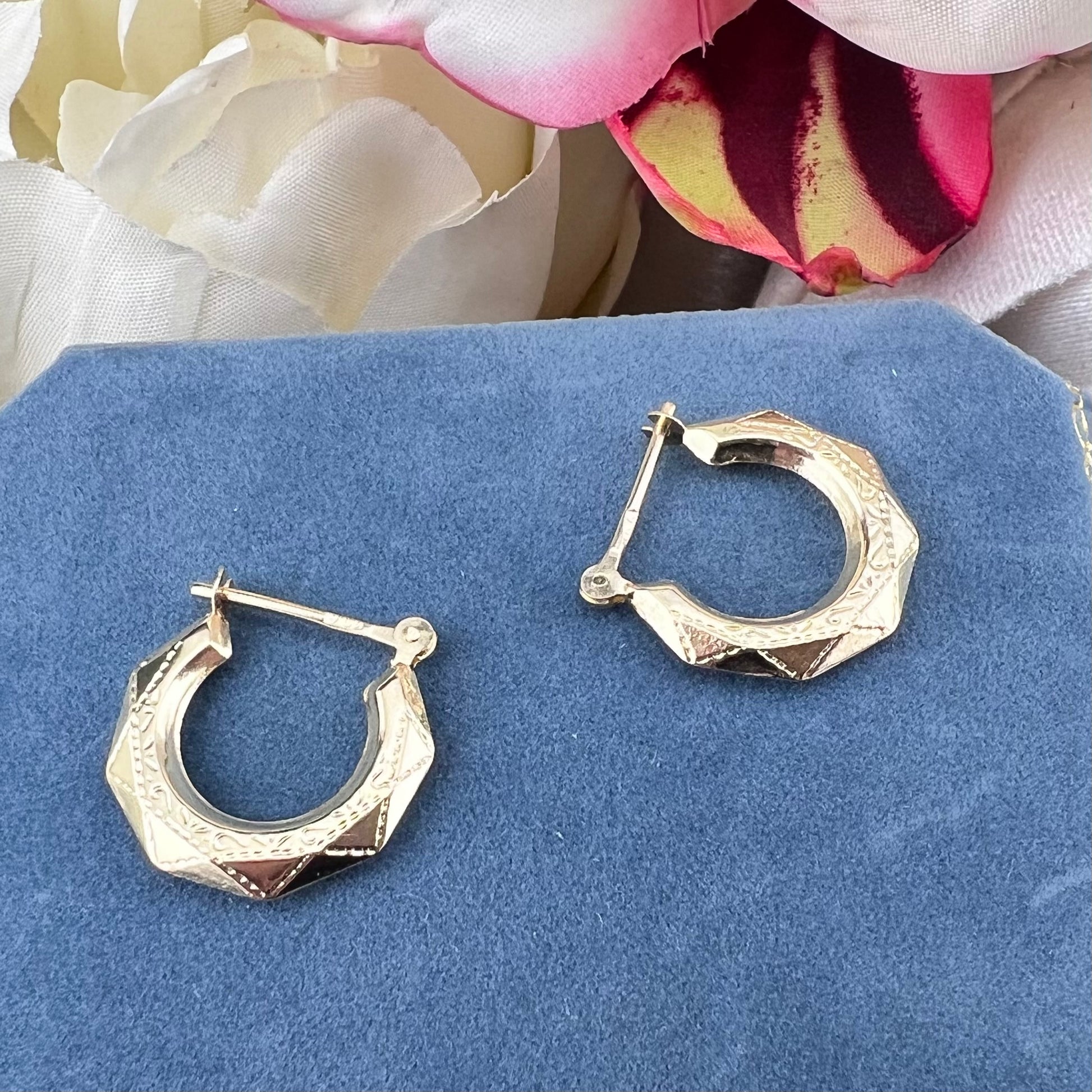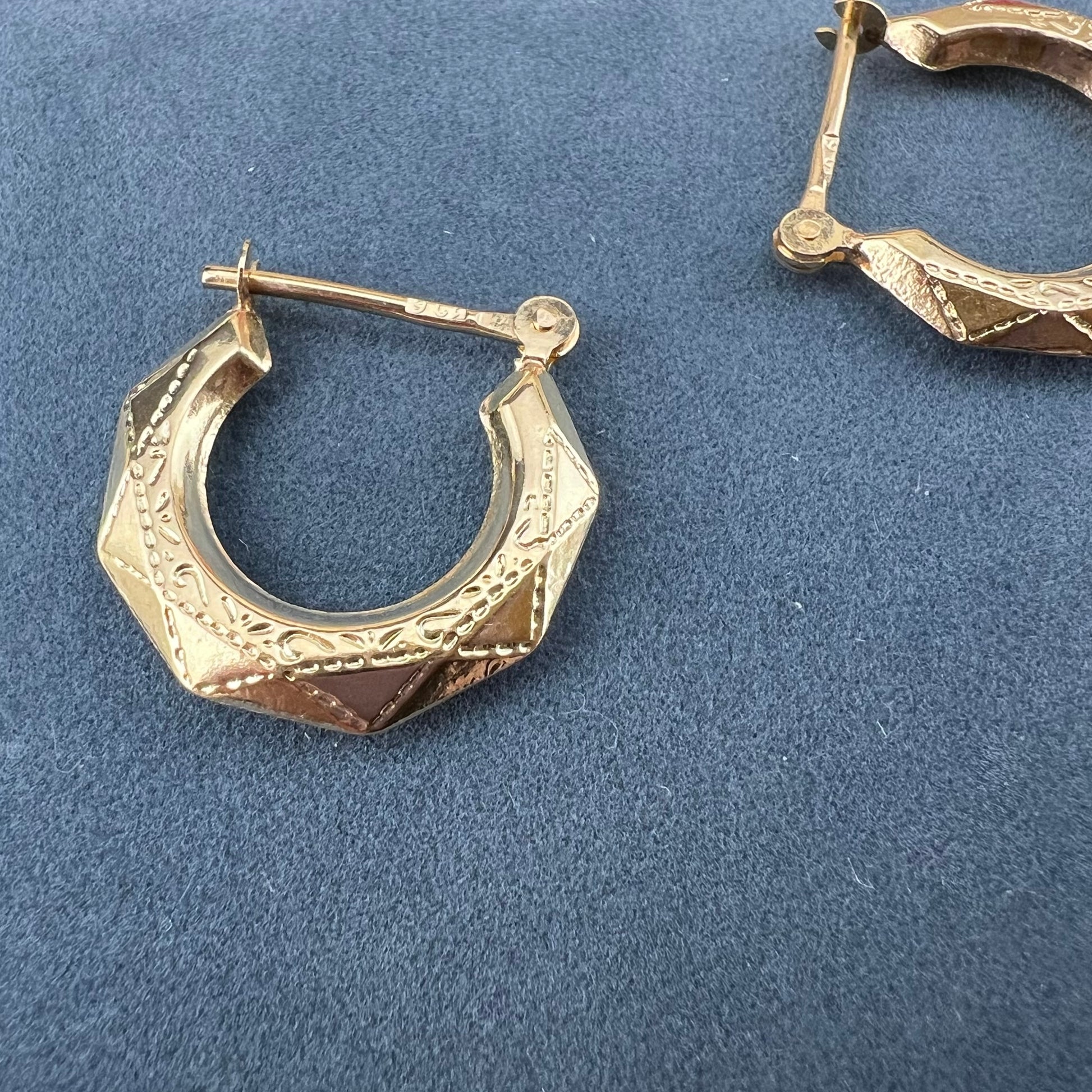Raffinati e senza tempo, questi orecchini a creola vintage sono realizzati in oro giallo 9 carati con delicata incisione. La loro forma geometrica, elegante e particolare, li rende un gioiello versatile, perfetto sia per un look quotidiano che per un tocco di stile retrò nelle occasioni speciali.