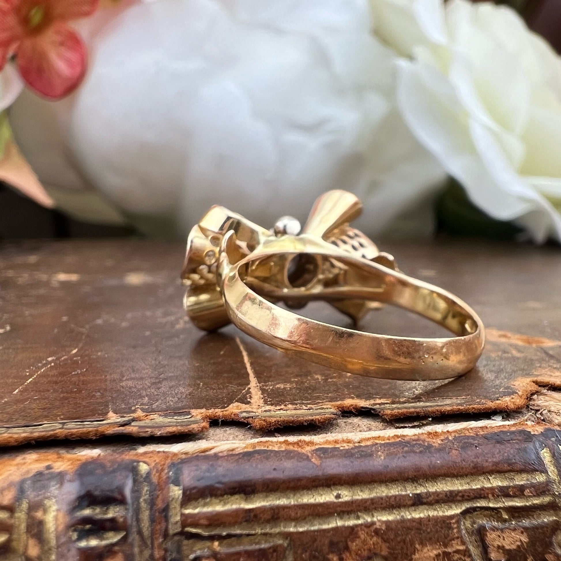 Il design è dominato da un nastro sinuoso in oro giallo 18 carati, elegantemente modellato a fiocco, con superfici morbide e parzialmente traforate, che donano leggerezza visiva e profondità alla composizione. Una lavorazione complessa, tipica della migliore manifattura orafa di inizio secolo, difficilmente riscontrabile negli anelli coevi.