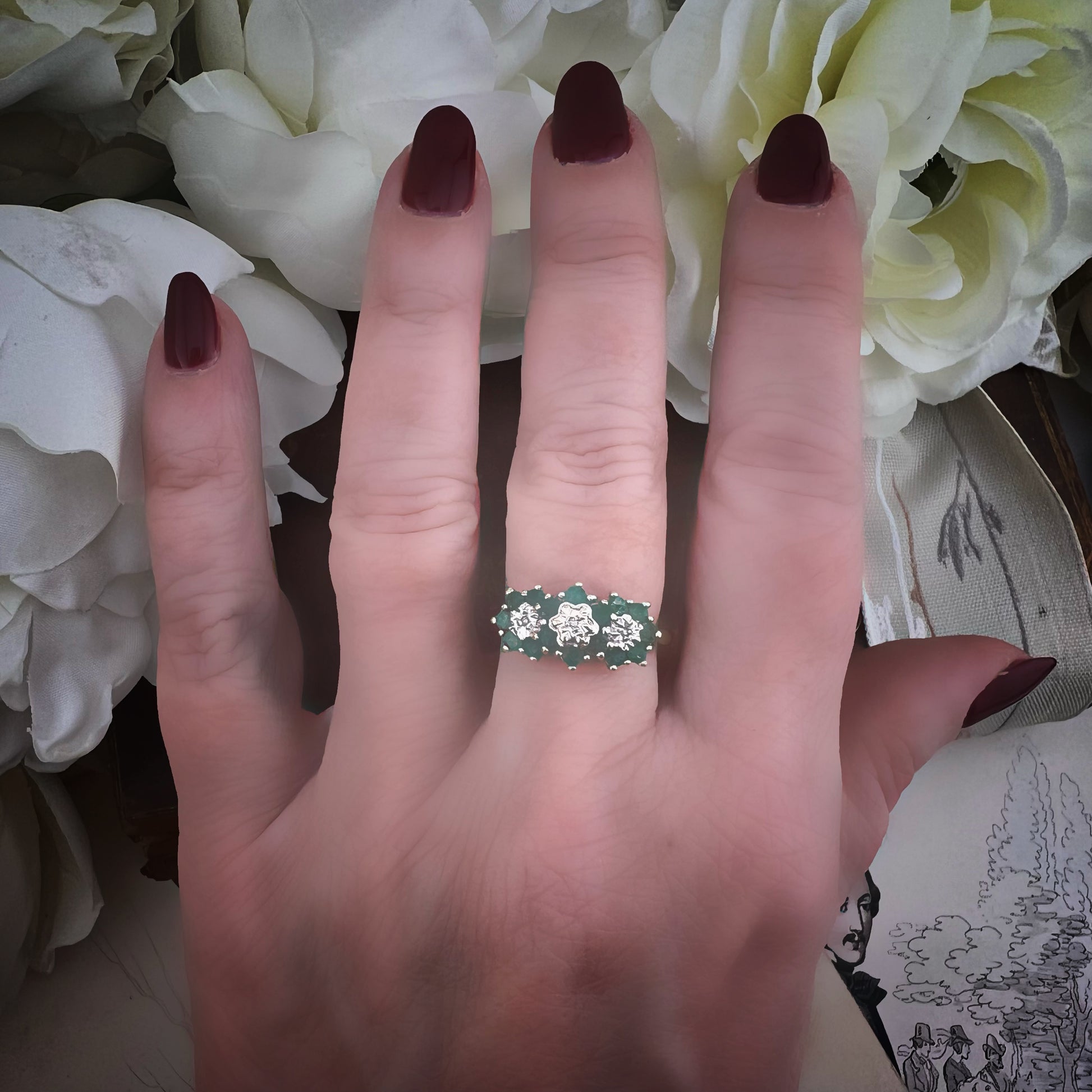 Raffinato anello vintage a tre margherite, un classico intramontabile che unisce eleganza senza tempo e preziosità delle gemme. La composizione è un armonioso gioco di luce e colore: sedici smeraldi naturali taglio tondo, di un verde intenso e profondo, formano i delicati petali delle tre margherite, mentre al centro brillano tre diamanti a taglio rosetta, montati a illusione per amplificarne la luminosità.