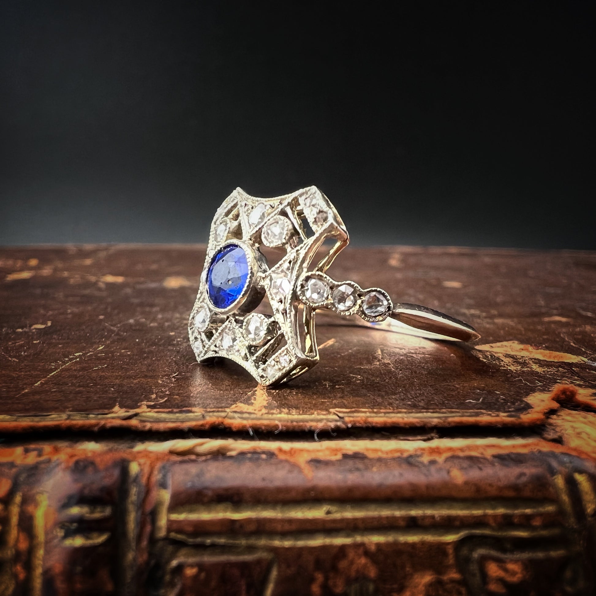 Anello Art Déco in oro 14 ct, diamanti e zaffiro di sintesi